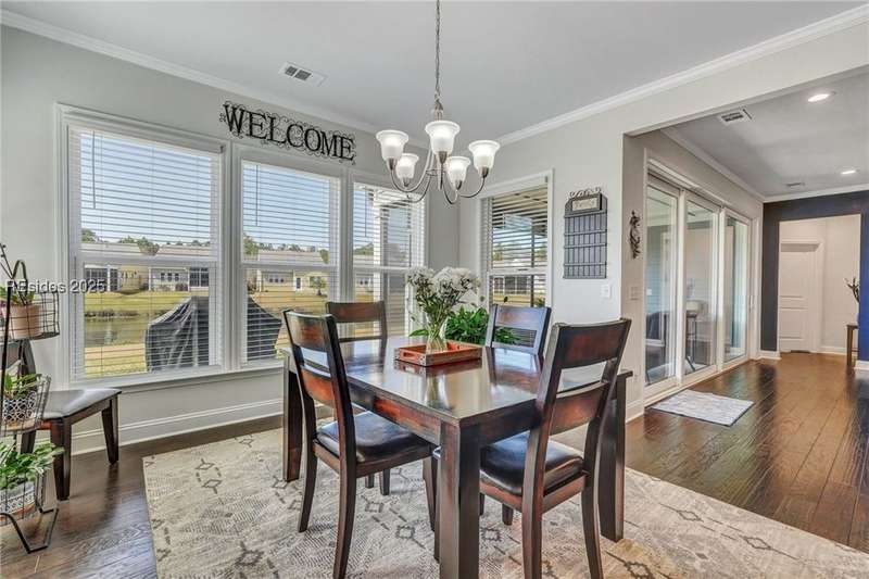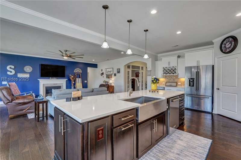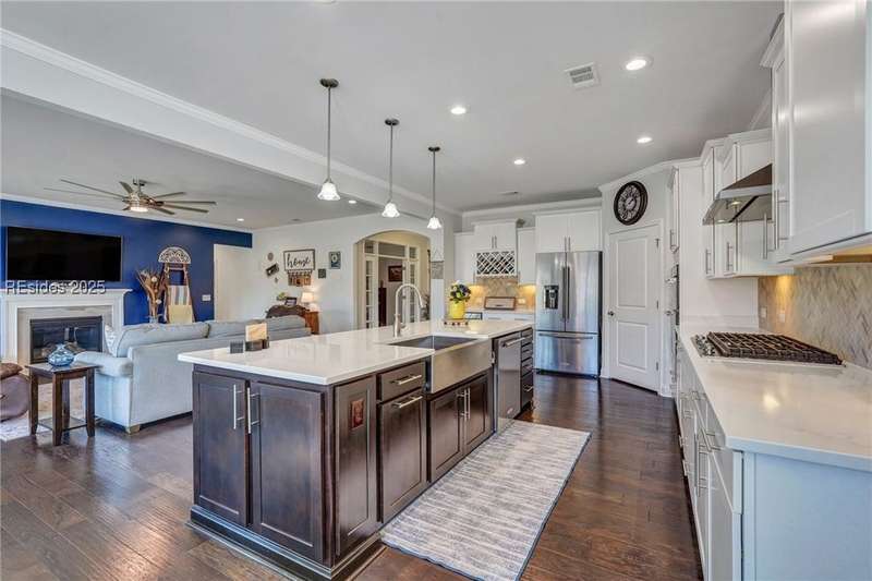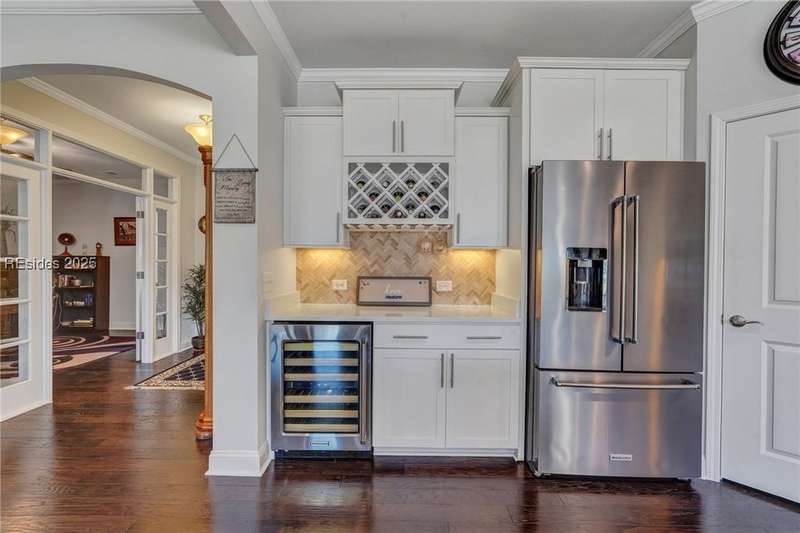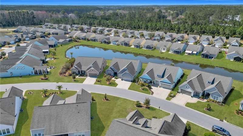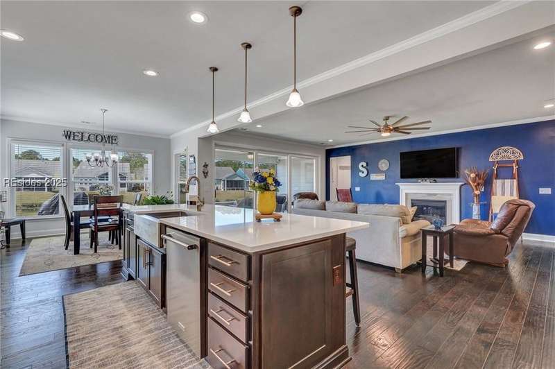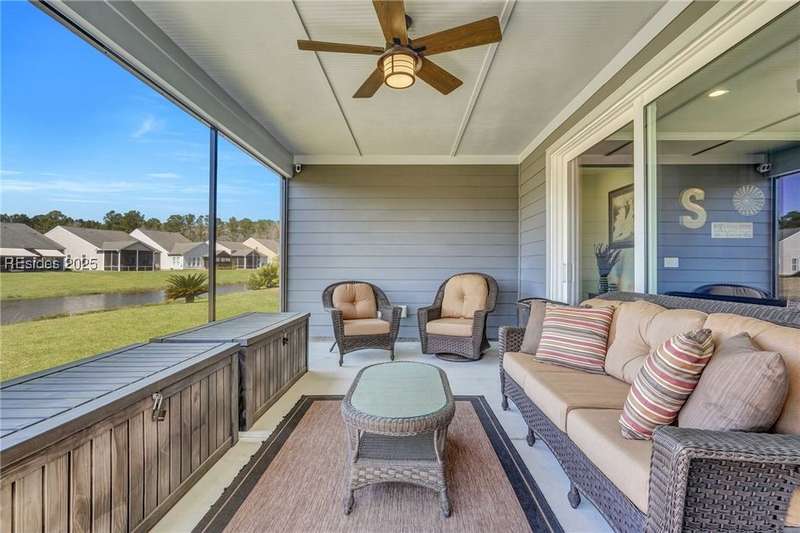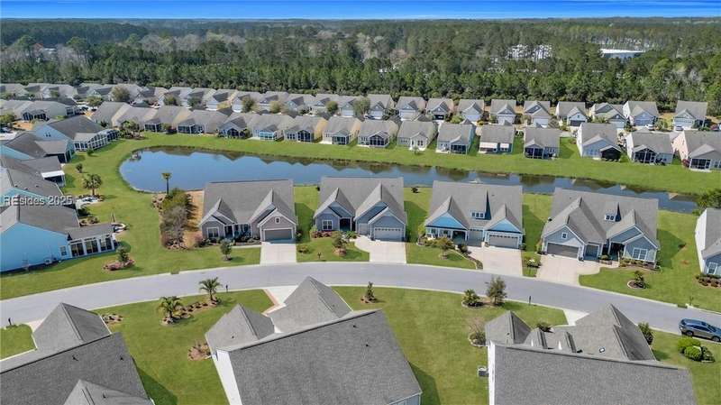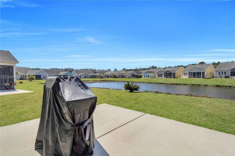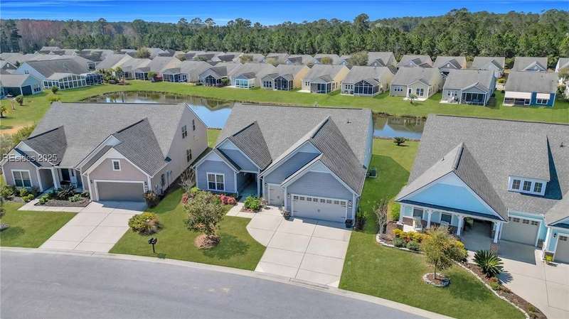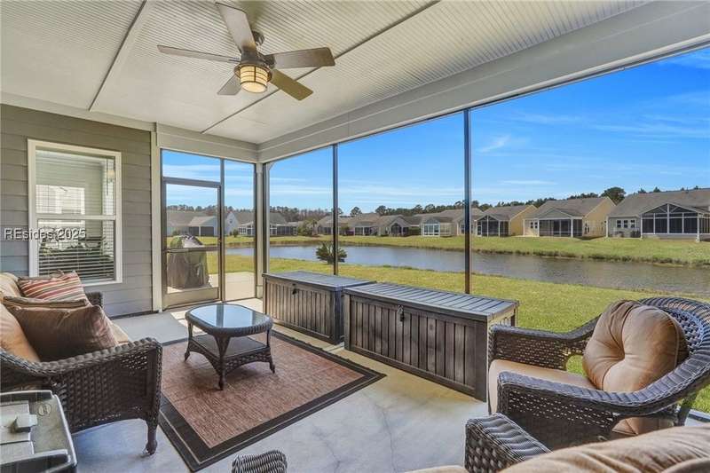 Fabulous Dunwoody Way offers stunning lagoon views & premium upgrades. Gourmet kitchen boasts quartz countertops, custom cabinetry, ext. island, SS KitchenAid appliances, gas cook top, wine fridge, & custom pantry. Entertainment friendly open-concept layout features a gas fireplace & telescoping doors to a large screened porch & patio. Wood floors & tile in baths & laundry. Custom closets and storage throughout. The primary suite w/ super shower & custom walk-in closet. 2 guest bdrs, 1 en-suite. Den w/ French doors. Laundry w/ cabinets & sink 2-car + golf bay gar. w/ walk-up storage. Centrally located for SC amenities.