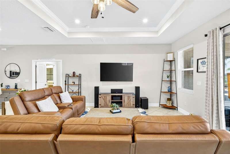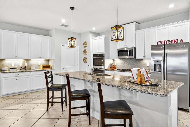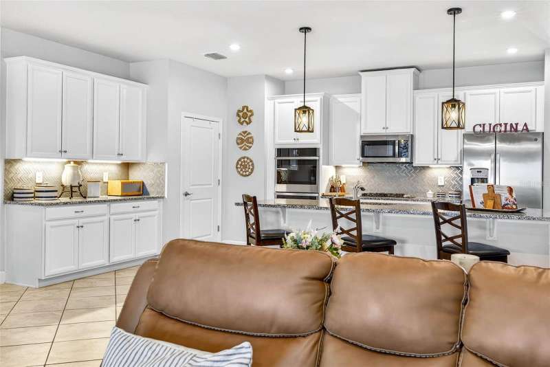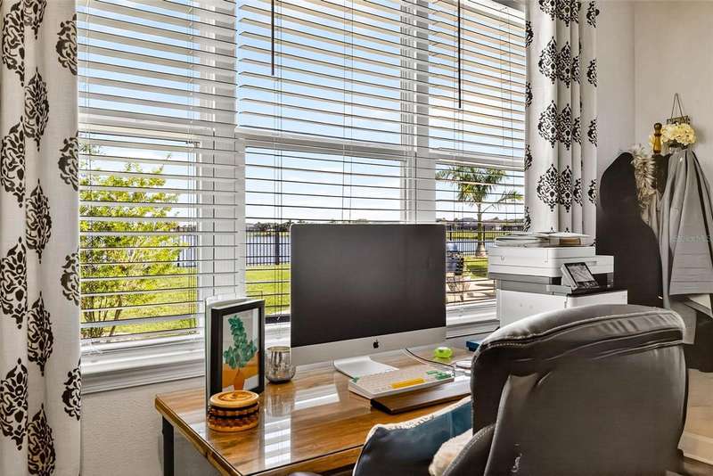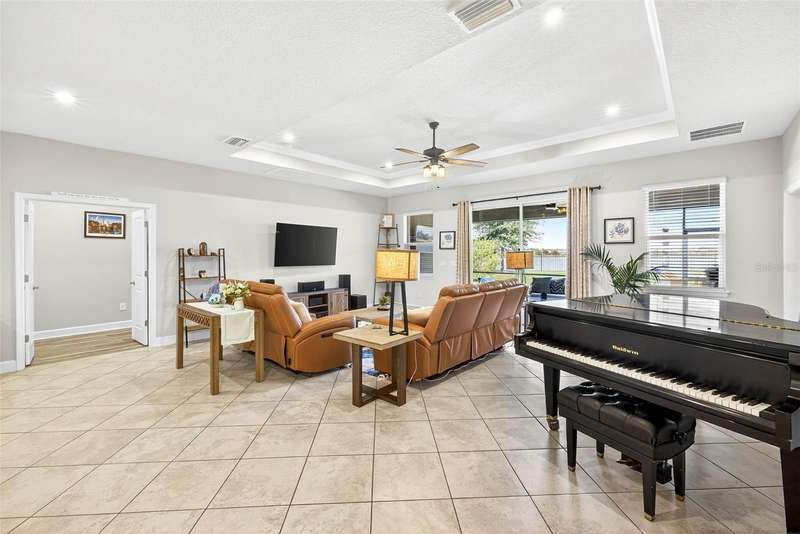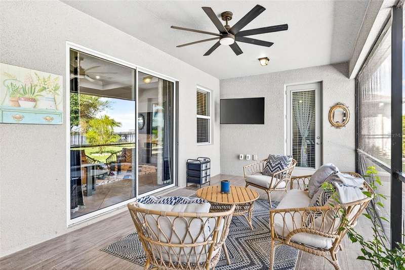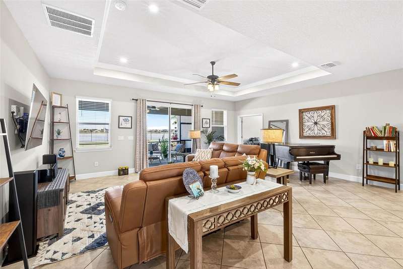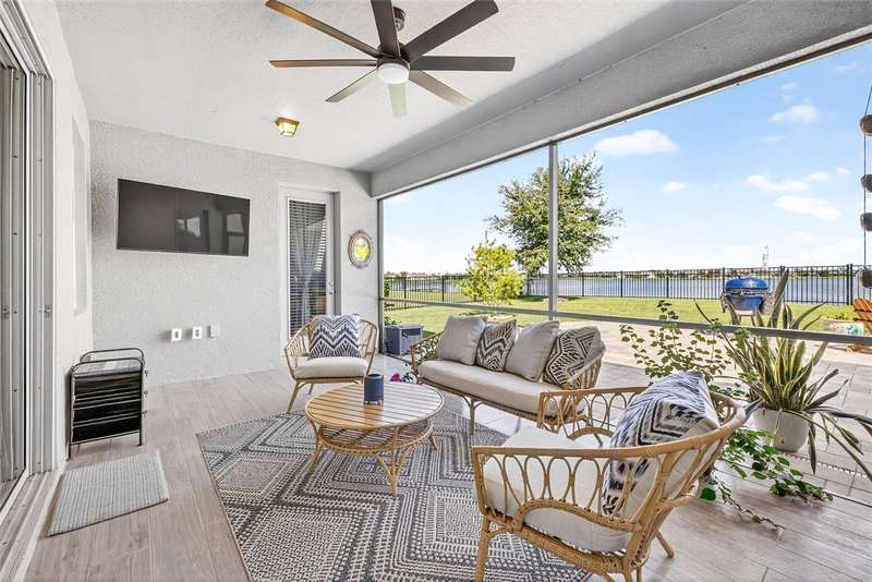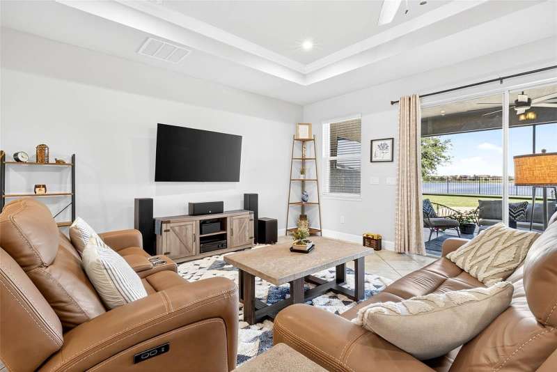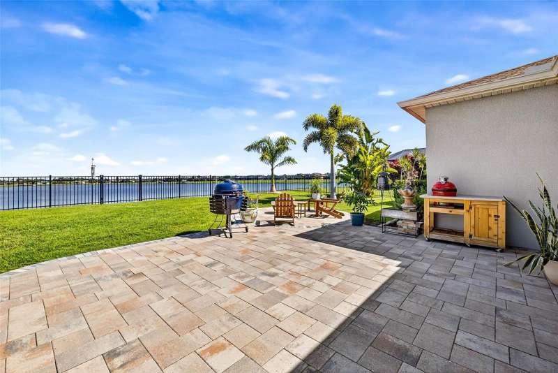 Welcome to this beautifully upgraded 5-bedroom, 3-bathroom home in the highly sought-after gated community of Lucaya Lake Club. With nearly $50,000 in upgrades, this residence blends thoughtful design, modern finishes, and versatile living spaces. From the curb, you’ll notice the professional landscaping, upgraded irrigation system, and wide paver driveway leading to the three-car garage. Step inside to find an open, light-filled layout with tile flooring in the main living areas and new hardwood flooring in all bedrooms and the bonus room. The heart of the home is the expansive living room with a tray ceiling, recessed lighting, and sliding glass doors that open to the lanai. The gourmet kitchen features granite countertops, stainless steel appliances including a new refrigerator, double wall ovens, herringbone backsplash, upgraded pendant lighting, and a large island with seating. A standout feature of this floorplan is its flexibility. In addition to the main living area, the home offers a second large living space that can be closed off to create a private in-law suite. This wing includes a wide-open bonus room, a spacious guest bedroom, and a full bathroom—ideal for multigenerational living, extended guests, or even a private retreat. The primary suite impresses with its size and spa-like ensuite bath featuring dual vanities, a makeup station, and a massive walk-in shower with decorative tile and a built-in bench. Additional bedrooms are generously sized, offering comfort and privacy for family and guests. At the front of the home, the fifth bedroom offers endless possibilities. With a custom Murphy bed built into the wall, this room is perfect for use as a home office, playroom, guest room, or anything else you desire. Its location and design make it one of the most versatile spaces in the home. Step outside to your private backyard oasis. The screened lanai, upgraded with tile flooring, opens to a custom paver patio with multiple seating areas, a fire pit, and a grilling station—perfect for entertaining or quiet evenings overlooking the lake. The backyard is enclosed with a black aluminum fence and professionally landscaped with mature palms and tropical plants, all with serene waterfront views of Lucaya Lake. For outdoor enthusiasts, this home is a dream—the lake is stocked with bass, tilapia, catfish, and bluegill, making it perfect for fishing right from your backyard. Additional upgrades include a whole-house water filtration and UV system, HVAC UV system, water softener with RO filter, and custom ceiling fans. Living in Lucaya Lake Club means enjoying resort-style amenities: a clubhouse, fitness center, zero-entry swimming pool, splash park, playgrounds, and access to the 78-acre lake for kayaking and paddleboarding. This is more than just a home—it’s a lifestyle of comfort, convenience, and community in one of Riverview’s most desirable neighborhoods.
