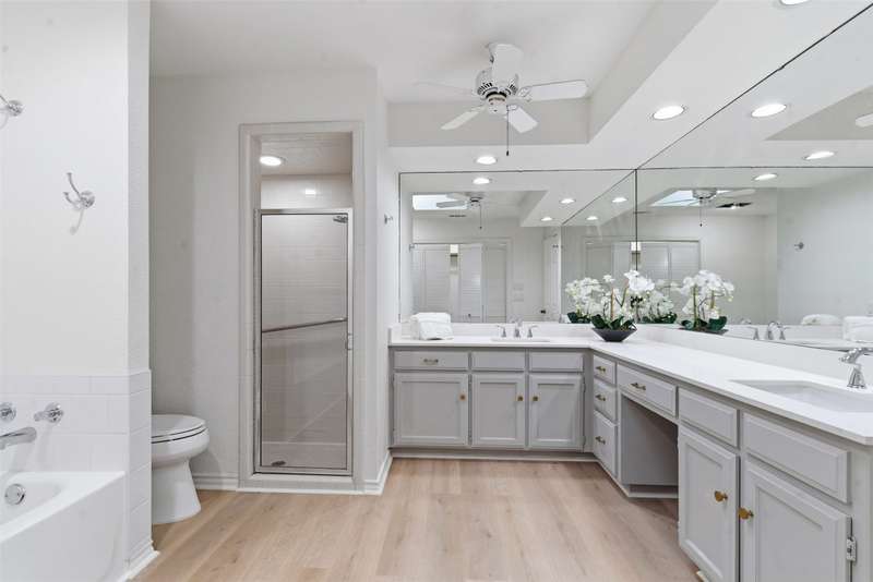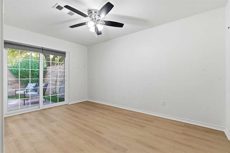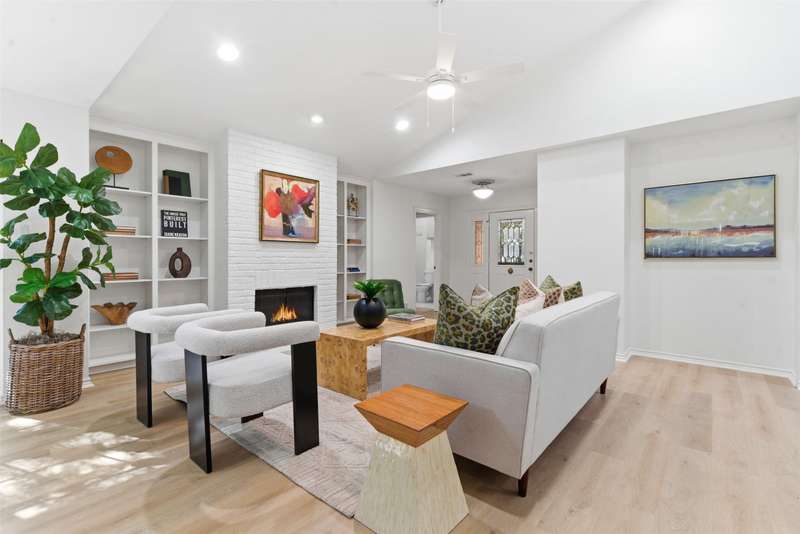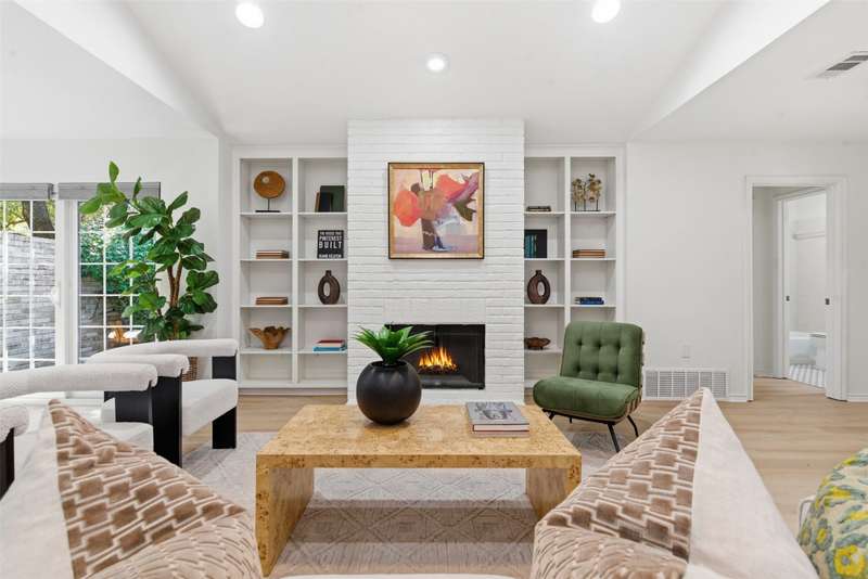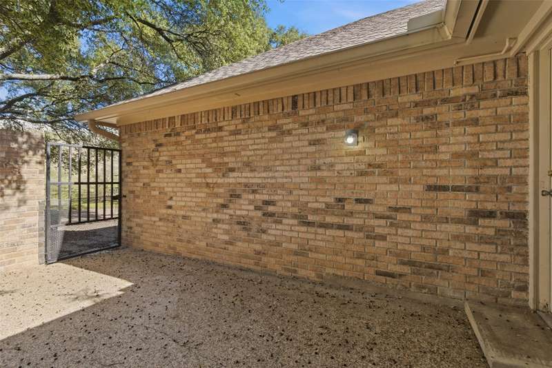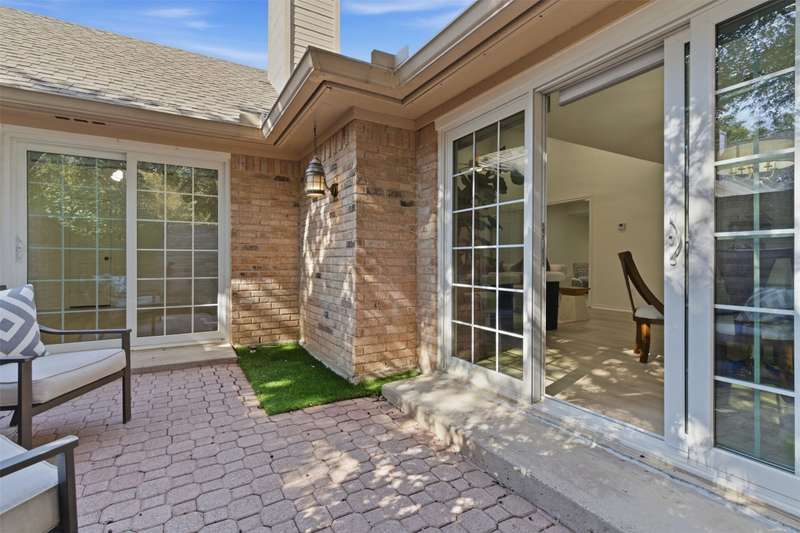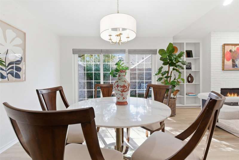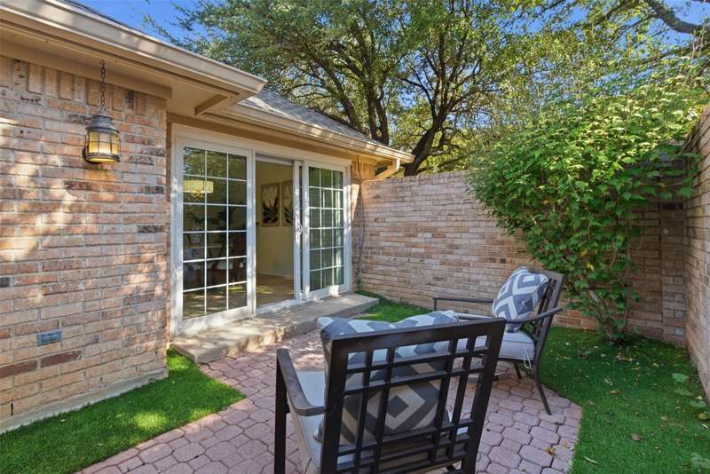 Located in the quiet, tree-lined Meadows West neighborhood, this beautifully updated single-story end unit townhome offers spacious, low-maintenance living just steps from the Trinity Trails and minutes from Watersides shops and restaurants. The open-concept great room includes the living, dining, and kitchen areas along with a flexible space ideal for an office, reading room, or more. A cozy fireplace flanked by built-ins creates a warm focal point perfect for gatherings and entertaining.Enjoy three inviting outdoor spaces, including an iron-fenced front courtyard and a private patio with turf and pavers accessible from both the dining area and secondary bedroom. Interior updates include new wood-look flooring, fresh paint, modern lighting, and stylish cabinet hardware throughout. The primary ensuite features new bathroom countertops, a soaking tub, and generous walk-in closet space.A third full bath adds convenience for guests, while multiple storage areas and a one-car garage with additional storage (or potential conversion back to a two-car) make this home as functional as it is beautiful. Offering comfort, versatility, and charm in one of Fort Worths most desirable communities, this Meadows West townhome is move-in ready and designed for effortless living.