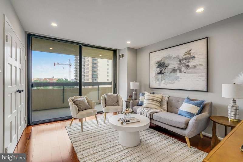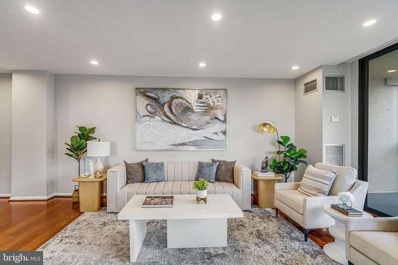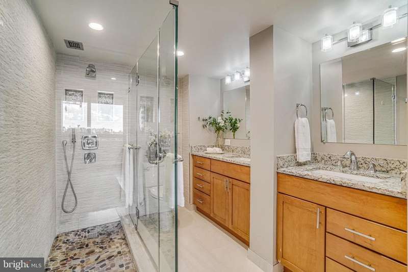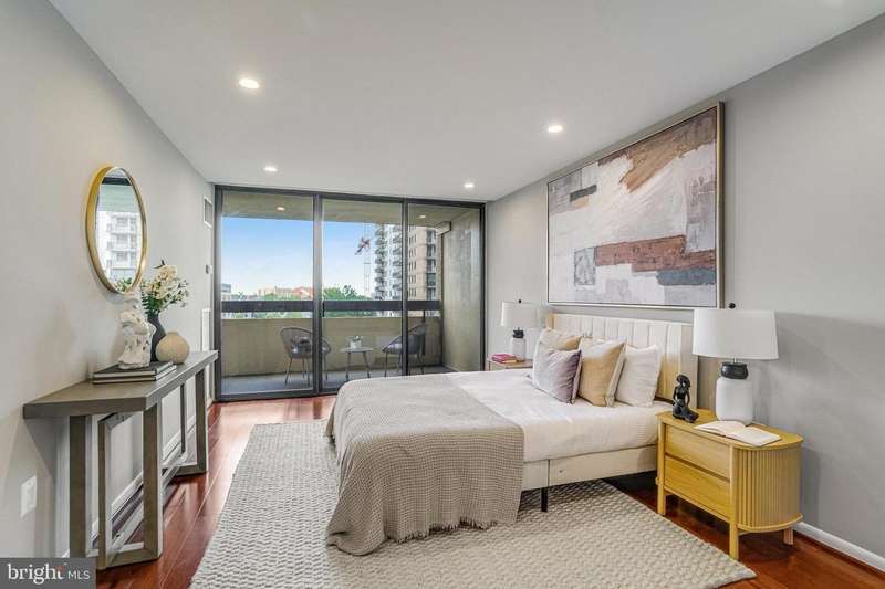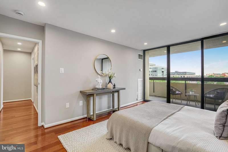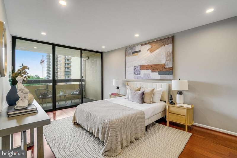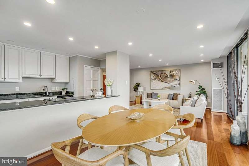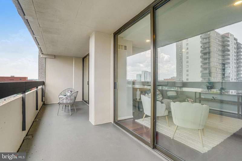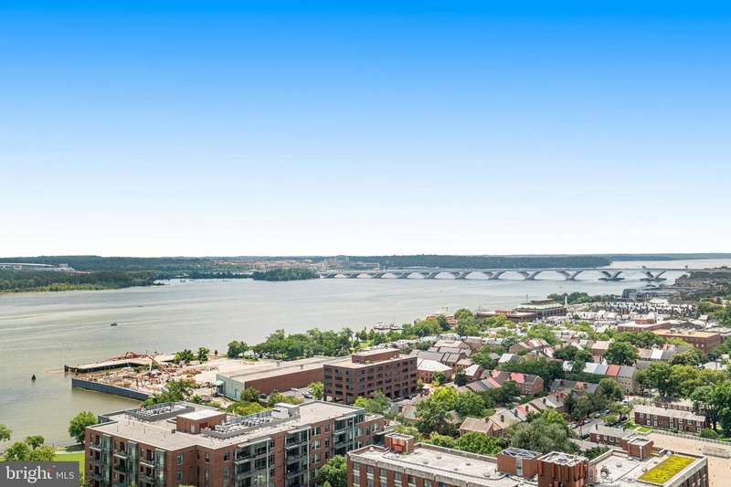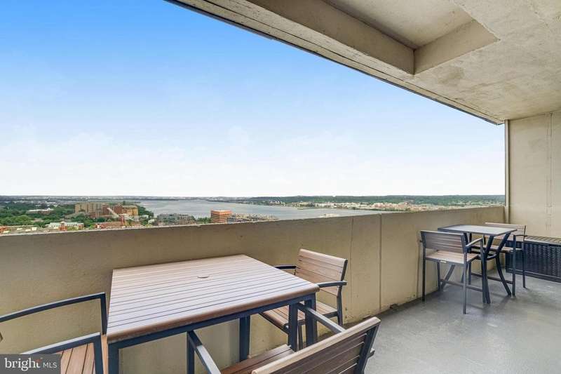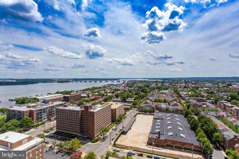 Impeccable re-imagined and renovated two-bedroom two bath residence at Alexandria House. This seventh-floor condo with views of the Potomac and charming rooftops of Old Town Alexandria, afforded through a northwest corner of floor to ceiling glass that spans the entire rear and front sides of the property. Updated and refreshed throughout with new ceiling LED recessed lights in every space. Brazilian Cherry flooring featured in all the living spaces. You are greeted as you enter the open concept main salon and living space with 8 ft ceilings and sweeping walls of sliding glass. A main living area, and connected dining space sit in front of the open kitchen island with granite counters, stainless appliances, and built in microwave hutch, custom under-mount lighting and recessed lights that communicate nicely with the dining and living rooms. The kitchen has ample cabinet space, a full depth refrigerator, and pantry spaces. The primary bedroom has a walk-in closet with custom shelving, double racks and long hanging spaces. The primary bath includes dual sink separated vanities, a walk-in shower with custom frameless glass shower door with Granite and marble that accentuate a timeless and modern look. Sliding doors lead to the exterior 85 ft wrap around balcony offering plenty of space for your grill. The second bedroom features ample closet spaces with double hanging racks, custom shelving, and direct access to the same balcony. The second bathroom features a soaking tub. A separate laundry closet with new stackable washer and dryer finishes the space. Two parking spaces, 329 and 330 on B2 and a storage unit also convey with the sale. Building offers amazing amenities; 24-hour concierge and security, a rooftop pool and sun deck, party room with full kitchen and expansive balcony with Potomac River and DC Monument vistas. Dual saunas, a state of the art weight room and gym, a meeting room, library, and print and copy center, and a dedicated Amazon package room. Dedicated bike room, EV Charging stations and four elevators service the tallest building in Old Town. A dedicated community park and extensive common areas abound. Condo fee includes all utilities. A delightful modern masterpiece, with charming features and high-end upgrades with enough space to spread your wings in the comfort of the best managed condominium in Old Town, steps to shopping, the Potomac River and easy access to Metro, the Airport and DC and beyond.