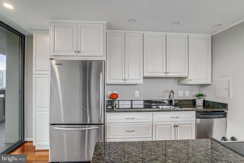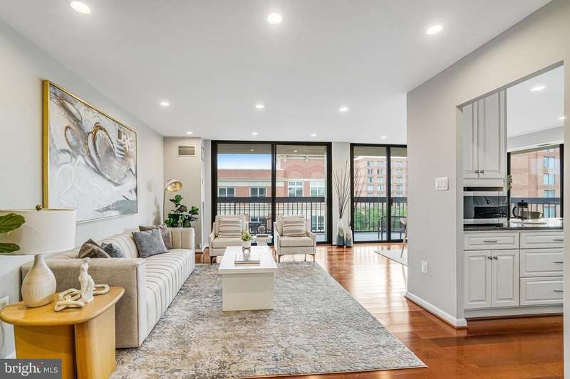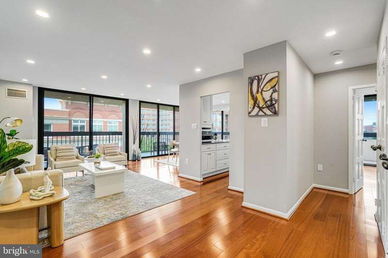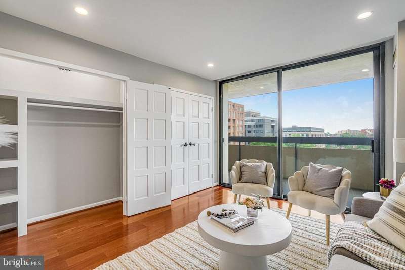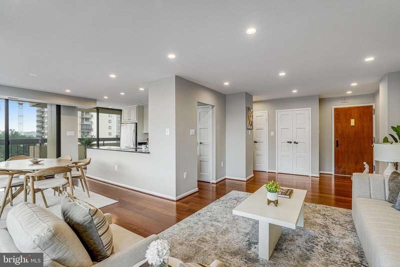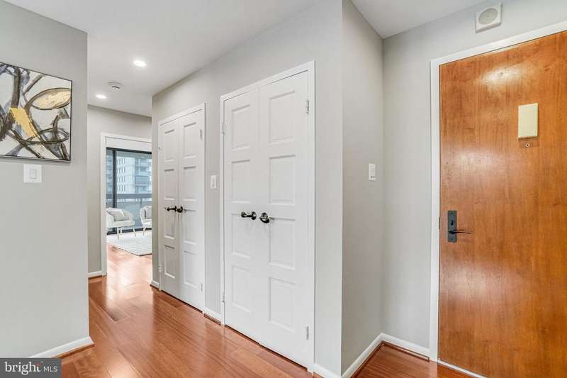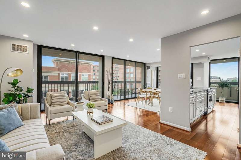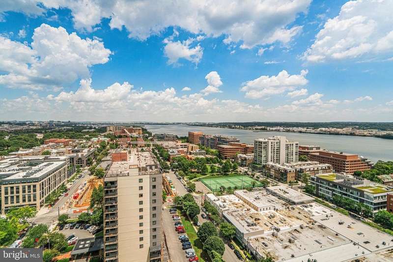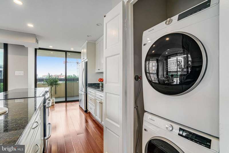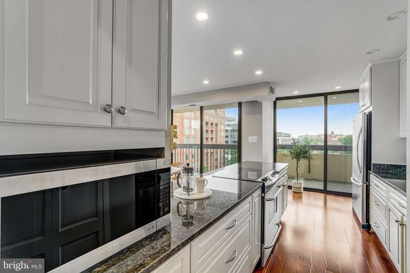 Impeccable re-imagined and renovated two-bedroom two bath residence at Alexandria House. This seventh-floor condo with views of the Potomac and charming rooftops of Old Town Alexandria, afforded through a northwest corner of floor to ceiling glass that spans the entire rear and front sides of the property. Updated and refreshed throughout with new ceiling LED recessed lights in every space. Brazilian Cherry flooring featured in all the living spaces. You are greeted as you enter the open concept main salon and living space with 8 ft ceilings and sweeping walls of sliding glass. A main living area, and connected dining space sit in front of the open kitchen island with granite counters, stainless appliances, and built in microwave hutch, custom under-mount lighting and recessed lights that communicate nicely with the dining and living rooms. The kitchen has ample cabinet space, a full depth refrigerator, and pantry spaces. The primary bedroom has a walk-in closet with custom shelving, double racks and long hanging spaces. The primary bath includes dual sink separated vanities, a walk-in shower with custom frameless glass shower door with Granite and marble that accentuate a timeless and modern look. Sliding doors lead to the exterior 85 ft wrap around balcony offering plenty of space for your grill. The second bedroom features ample closet spaces with double hanging racks, custom shelving, and direct access to the same balcony. The second bathroom features a soaking tub. A separate laundry closet with new stackable washer and dryer finishes the space. Two parking spaces, 329 and 330 on B2 and a storage unit also convey with the sale. Building offers amazing amenities; 24-hour concierge and security, a rooftop pool and sun deck, party room with full kitchen and expansive balcony with Potomac River and DC Monument vistas. Dual saunas, a state of the art weight room and gym, a meeting room, library, and print and copy center, and a dedicated Amazon package room. Dedicated bike room, EV Charging stations and four elevators service the tallest building in Old Town. A dedicated community park and extensive common areas abound. Condo fee includes all utilities. A delightful modern masterpiece, with charming features and high-end upgrades with enough space to spread your wings in the comfort of the best managed condominium in Old Town, steps to shopping, the Potomac River and easy access to Metro, the Airport and DC and beyond.