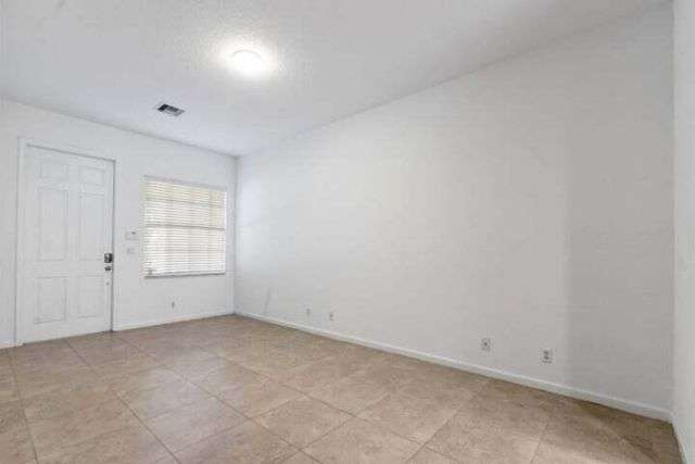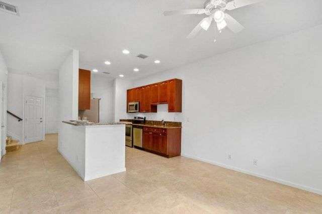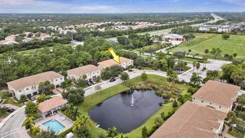Nestled within a private nature preserve, this beautiful townhouse is located in Heritage Enclave, a gated community of just 50 homes built with high-quality construction, including concrete walls, impact windows, and fire sprinkler systems. This pet-friendly neighborhood offers peace, privacy, and modern comfort.This two-story home features a bright and open first-floor layout with high ceilings and ceramic tile flooring, including a welcoming living room, dining area, a versatile space perfect for a home office or family room, a powder room, and a modern kitchen equipped with stainless steel appliances, wood cabinetry, granite countertops, and a snack bar for casual dining.Upstairs, the split floor plan provides privacy and functionality. The spacious primary suite overlooks