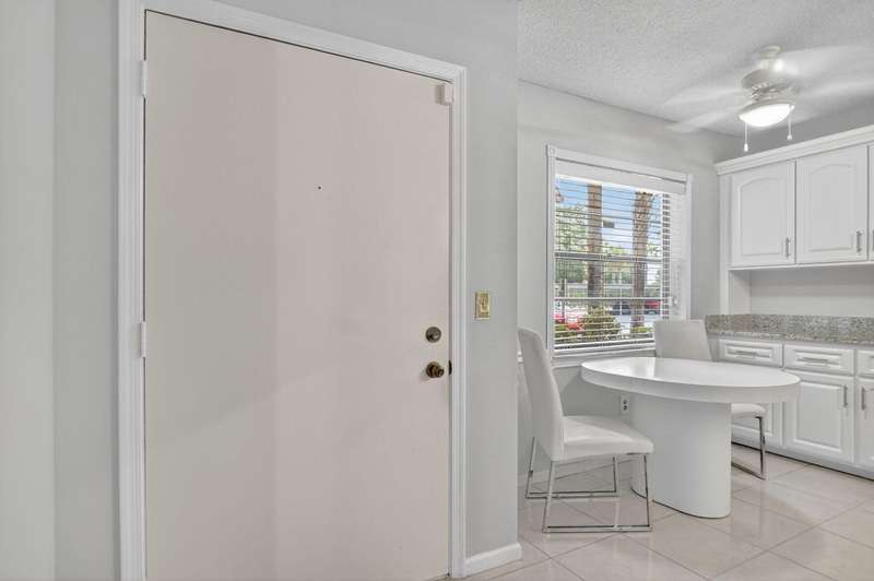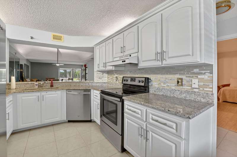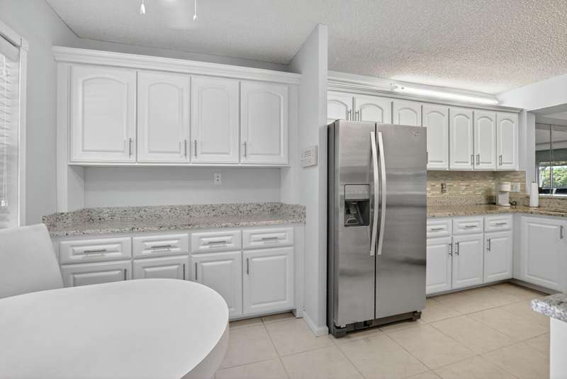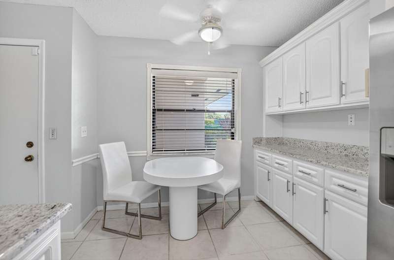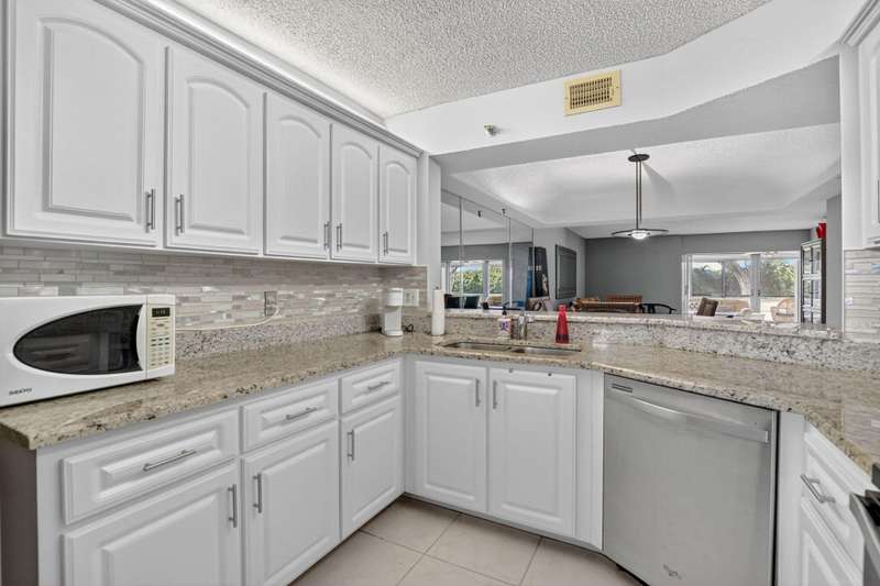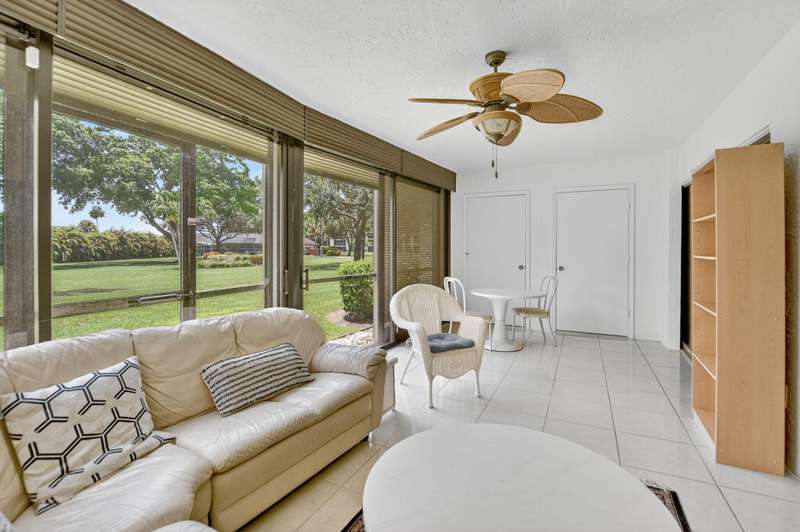 Enjoy easy first-floor access in this spacious 2BR/2BA condo featuring a large enclosed Florida room with expansive garden views. The updated kitchen offers granite countertops, white cabinetry, stainless steel appliances, and a convenient pass-through to the dining area. Bright, open floor plan with tile flooring in main areas and carpet/laminate in bedrooms. The generous primary suite includes excellent closet space and a bath with double sinks and a walk-in shower. The Patios offers 2 pools, spas, tennis, fitness room, game and billiard rooms. Community passed Milestone and SIRS studies with strong reserves and structural integrity. New hurricane-rated foam roofs add long-term value.