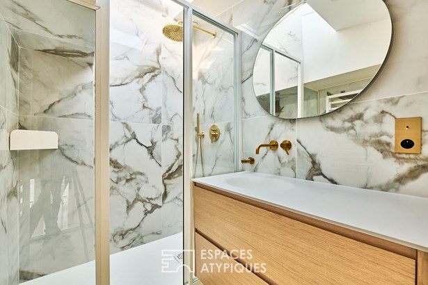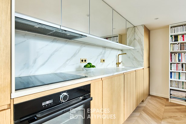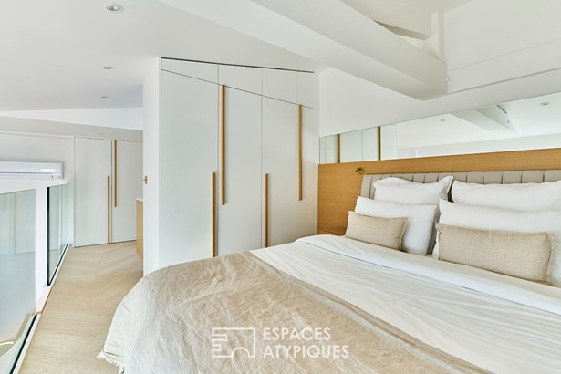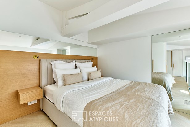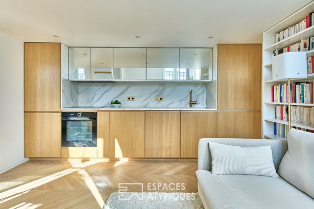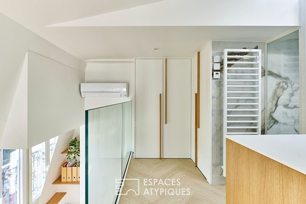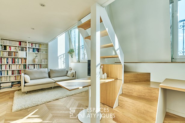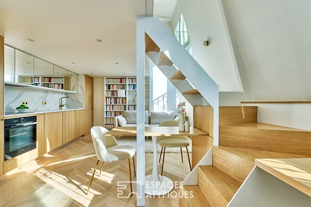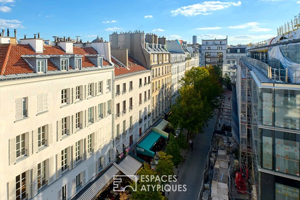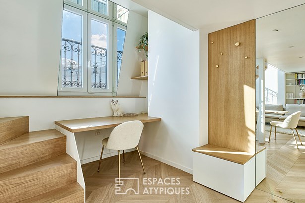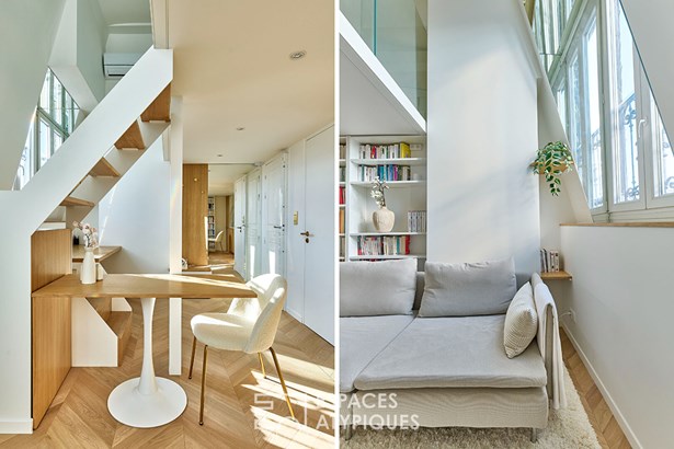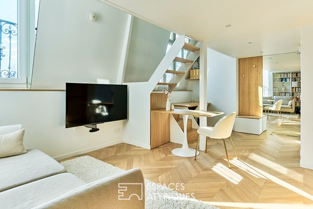 Overlooking the Place du Marche Saint-Honore, this top-floor duplex of 40.58m2 (35.50 m2 Carrez law) has been entirely redesigned by an architect to offer the comfort and elegance of a true hotel suite, in a refined Parisian spirit.