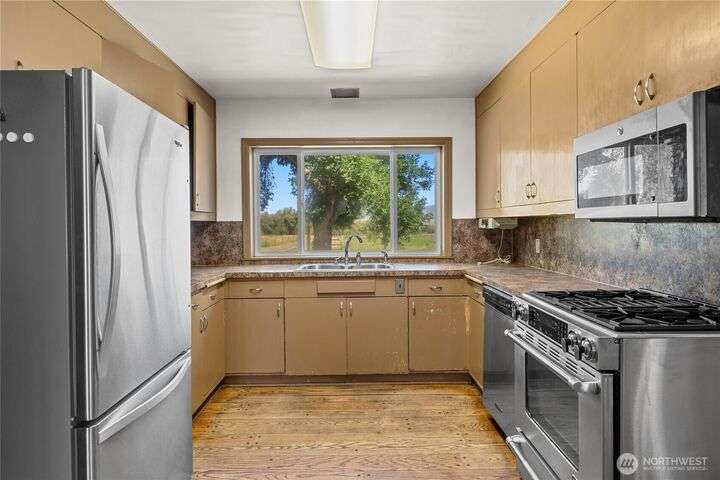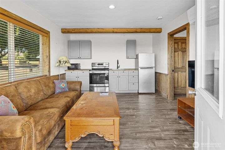 Discover the historic L.T. Murray Ranch House, tucked away on 8.22 irrigated acres on Ellensburg’s westside. This 3,190 sq. ft. ranch blends rustic charm with timeless style, featuring a vaulted great room with clear fir ceilings, a striking stone fireplace, and solid oak floors. The home offers 2 bedrooms plus a den/office, while a recently updated 1-bedroom, 1-bath ADU provides flexible living or guest space. Nestled among mature trees, the property also includes several original barns and loafing sheds, preserving its ranching heritage. A rare opportunity to own a secluded historic home with acreage, character, and endless potential.