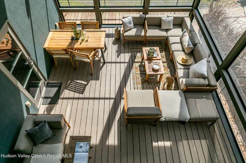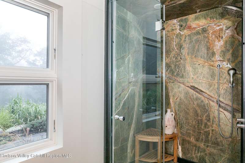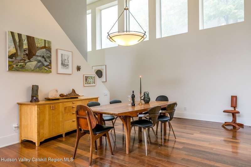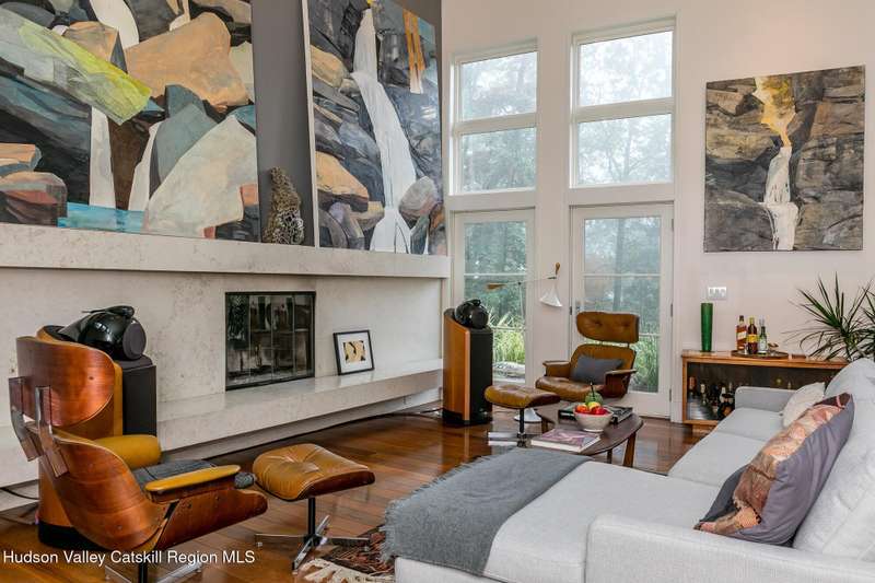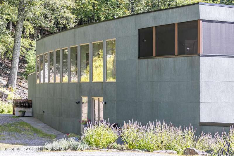 Swoop House is a residence with two great rooms, one of which was designed as a professional art studio. Designed by FT Architecture & Interiors, and inspired by the Diller Scofidio Slow House, the 5000 square feet span three levels. This singular residence is sited at the end of a long driveway on Overlook Mountain on 16 peaceful and private acres. This property provides you with both distant and intimate mountain views. It borders thousands of acres of pristine NY State land, while being located just five minutes from the village of Woodstock. Two non-parallel curved walls and sloping ceilings create a graceful series of shapes. The first story has a spacious two-story entry with a walk-in closet, and Brazilian cumaru wood flooring. There is great room with a 40-foot-long curved northern wall providing ample room for art displays, as well as a row of 10 large picture windows above - each of which frame views of the surrounding environment. The room is anchored by a wood burning fireplace with a 15-foot blanca perlino Italian marble hearth. Floor-to-ceiling windows face South, where glass doors lead to a walkway and a series of outdoor spaces. The gourmet kitchen boasts top of the line Bosch, and Wolf appliances and a built in Sub-Zero refrigerator, a stone countertop, and a butler's pantry with a sink and second refrigerator. The kitchen door leads out onto an expansive two story screened porch designed for dining and lounging, and the 40-foot outdoor deck, with black locust wood decking, where you can host dinner parties among the treetops. Adjacent to the kitchen is an office, and an adjoining full bath. Two well appointed bedroom suites are located on either end of the residence for privacy. The first floor bedroom suite has high ceilings, a walk-in closet, and large windows. A private entrance opens out onto one of several native bluestone patios, surrounded by perennial gardens with a hot tub. Its spacious bathroom has a dressing area and an oversized Brazilian stone shower where it is easy to imagine yourself under a waterfall. Leading to the primary bedroom suite, an open staircase provides views of the great room and outdoors from above. At the top of the stairs there is access to a south facing balcony. Here you can soak up sunshine and views year round while staying protected from the elements. The primary bedroom suite has two walls of floor to ceiling windows, a walk-in closet, and ensuite bathroom with a shower, a travertine marble countertop, and walk-through room for a jetted tub. From here one can step outdoors onto a serene sleeping porch on a loft within the two-story screened porch. Access to the second great room is provided from inside the house, as well as from outside at ground level, via a set of double glass doors and its own dedicated driveway. This space, now in use as a painting studio offers 2000 square feet, with 18-foot ceilings, a 40-foot display wall, oak flooring and radiant heat. Large windows, with custom sun-blocking shades, provide gorgeous natural light. There are also tracks for lighting, and a double utility sink in the kitchenette. Its adjoining media room is a place where you can take a break, repose, listen to music, have meetings, workout, and refresh in the full bathroom with a steam shower. It too has a private entrance that opens to a bluestone patio. There is a laundry room with linen storage, and a 300 square foot storage space. The studio and media spaces would also make an impressive addition to the residence as a family room or an alternative private bedroom suite. The outdoor spaces where you can enjoy the mountain and gardens are perfect for finding solitude or for entertaining. Swoop House is within 10 minutes to The Bearsville Theater, Woodstock's renowned restaurants, music venues, art galleries, shops, and farmer's market. It is 20 minutes to Kingston, 30 minutes to Rhinebeck and under two hours to NYC.