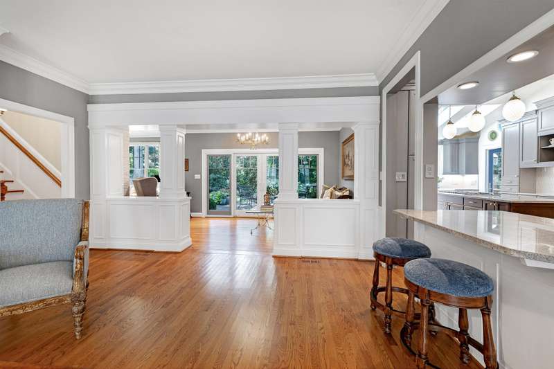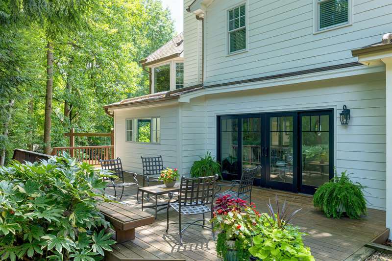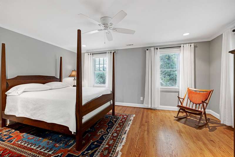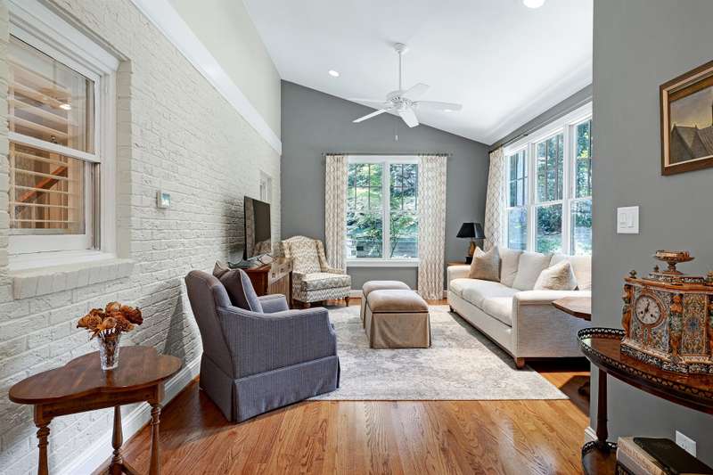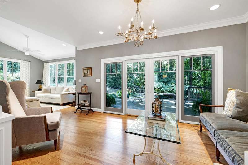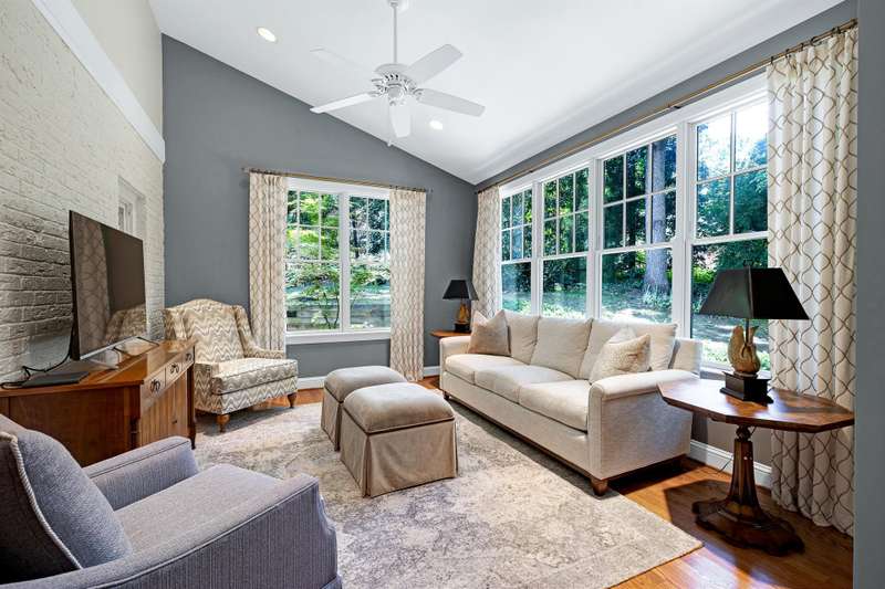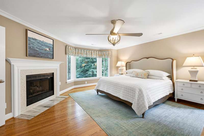 Set on a peaceful cul-de-sac with no through traffic, this 4-bed, 4-bath home offers nearly 4,300 sq ft of beautifully updated living. A major two-story rear addition expands the living space with a renovated kitchen and double sunrooms. All new Pella windows, new skylights, updated HVAC systems on every level, and major plumbing replacement mean the big projects are done. Quiet location, quality finishes, and a strong price point make this one of the best values in North Raleigh.Light-filled interiors begin with a welcoming foyer and continue into a versatile living/billiards room with built-ins and a gas fireplace. The formal dining room features a beamed ceiling and space to host a crowd. The kitchen includes a center island, gas cooktop, wet bar, granite counters, new skylights, and a sunny breakfast banquette. Two adjoining sunrooms create relaxed spaces for reading, entertaining, or enjoying the quiet setting. The primary suite offers a fireplace, double closets, and a newly renovated bath. Upstairs are two additional bedrooms, a full bath, and a spacious bonus room with rear-stair access. The third floor provides a private guest suite with full bath. Outside, a two-level deck overlooks a landscaped yard with magnolias, hydrangeas, and towering oaks, backing to a creek and forest.