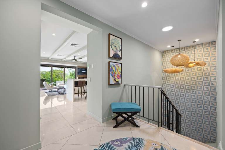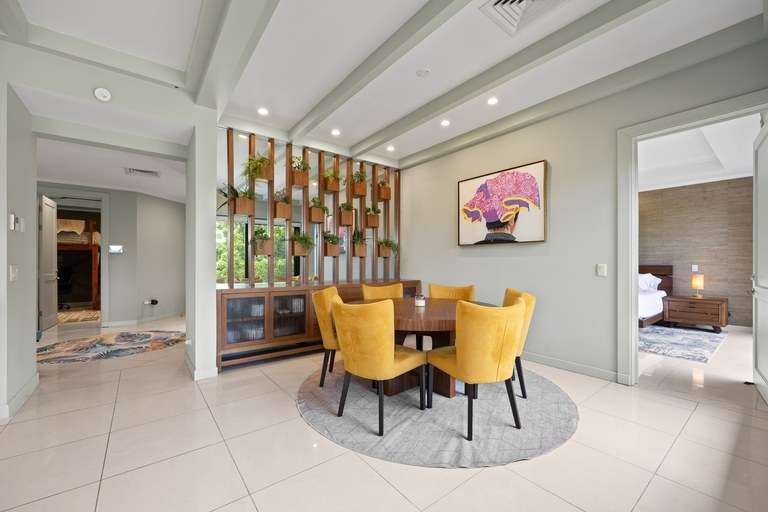 Each of the four bedrooms is designed as a private suite with its own en-suite bathroom. The luxurious primary suite on the main level features a king-sized bed, oversized walk-in closet, private terrace, and a spa-inspired bathroom with a skylit rain shower and a two-person Jacuzzi tub. Another guest room upstairs includes a loft bed with garden views, while the two lower-level suites offer flexible space for guests, family, or a home office. One guest suite includes two queen beds and terrace access, and another is currently configured as a private office with a poolside bathroom.