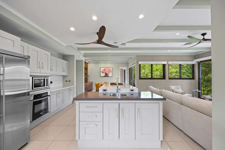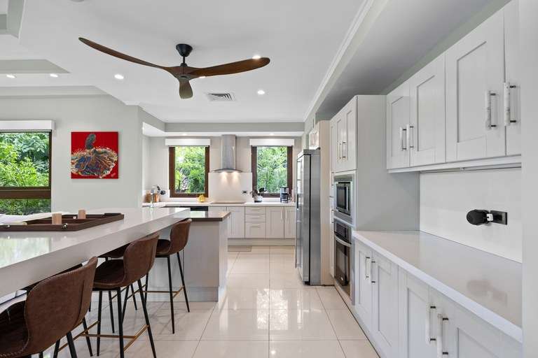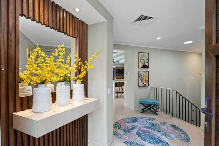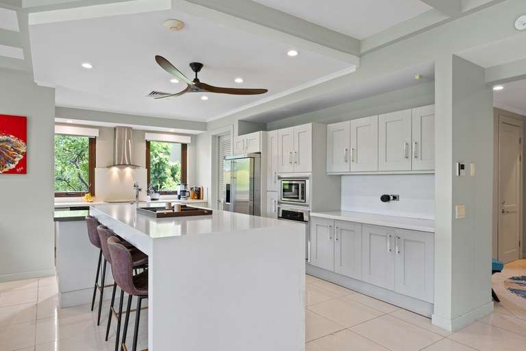 The villa's outdoor spaces are equally impressive. A newly added custom swimming pool and heated jacuzzi are surrounded by lush tropical landscaping, creating a private oasis. A fully equipped summer kitchen with built-in BBQ, dishwasher, and outdoor dining area allows for effortless entertaining. Electric privacy blinds enclose the terrace to create a breezy second living room, while hammocks, lounge chairs, an outdoor shower, and beautifully maintained gardens complete the resort-style experience.