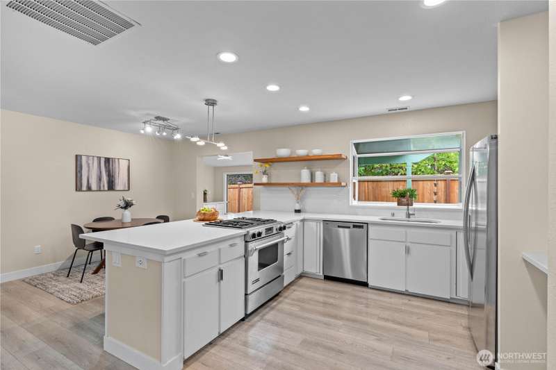 Renovated in 2021, this gorgeous rambler in desirable Madrona Meadows neighborhood offers modern comfort & style! Bathed in natural light, the open-concept layout features a solar tube in living room, LVP flooring, stunning kitchen w/quartz slab counters, SS appliances & breakfast bar. Enjoy a custom bar w/wine fridge that flows seamlessly to your covered patio. Relax in spacious primary suite w/private bath, or unwind in the secluded, beautifully landscaped, fully fenced yard-perfect for entertaining, play or pets. Bonus flex room ideal for home office or hobby space. Stay cool w/ A/C, cozy up by the fireplace or step right onto BPA Trail from your cul-de-sac location. Mins to freeways, shopping, dining, parks, schools & future lightrail