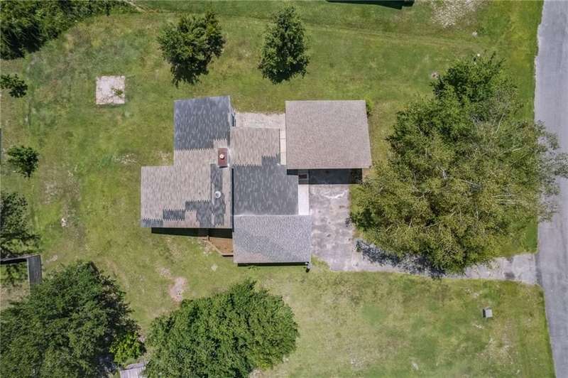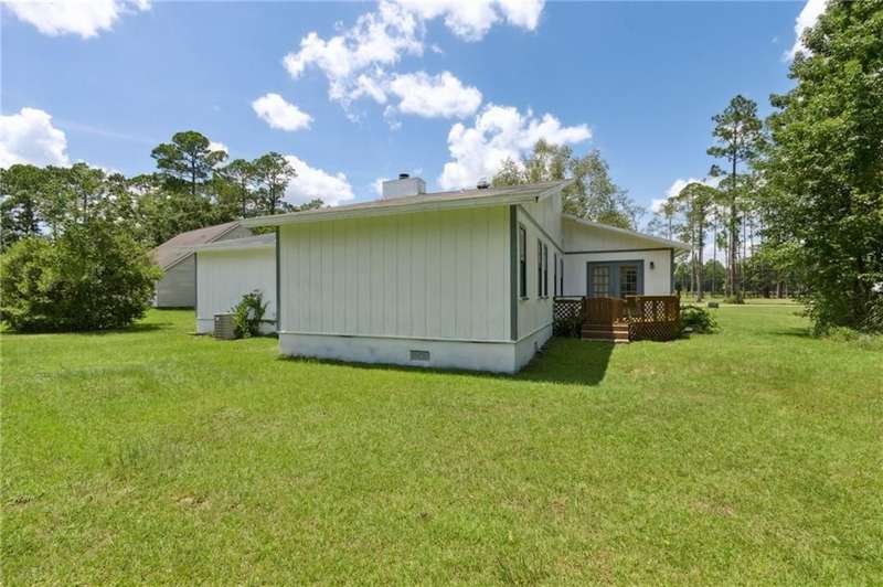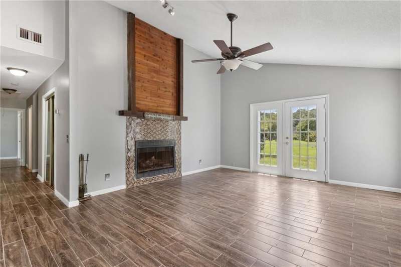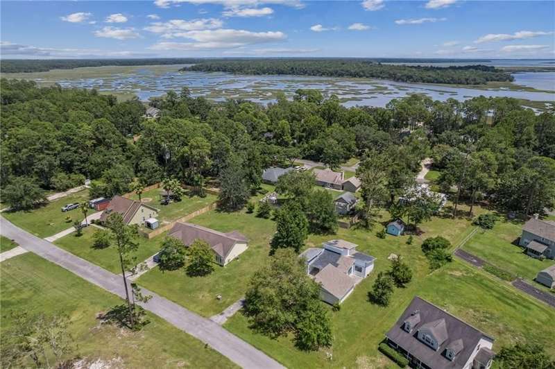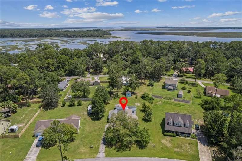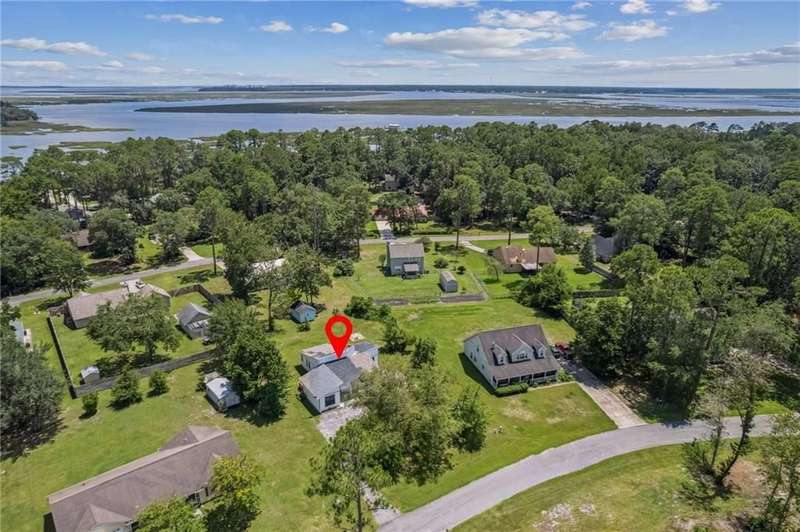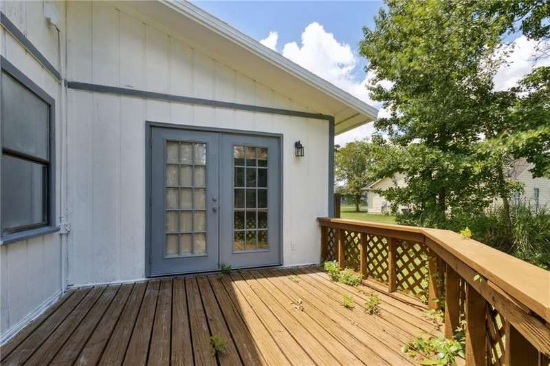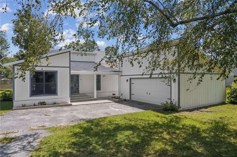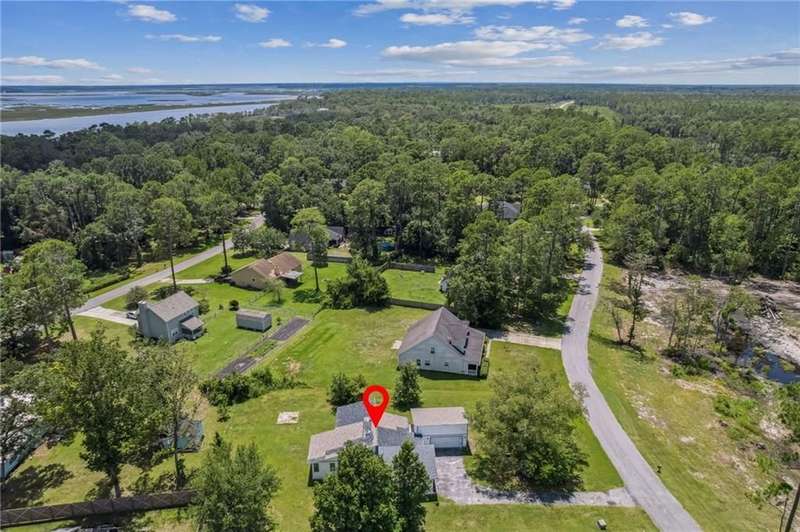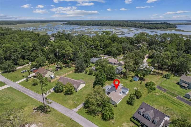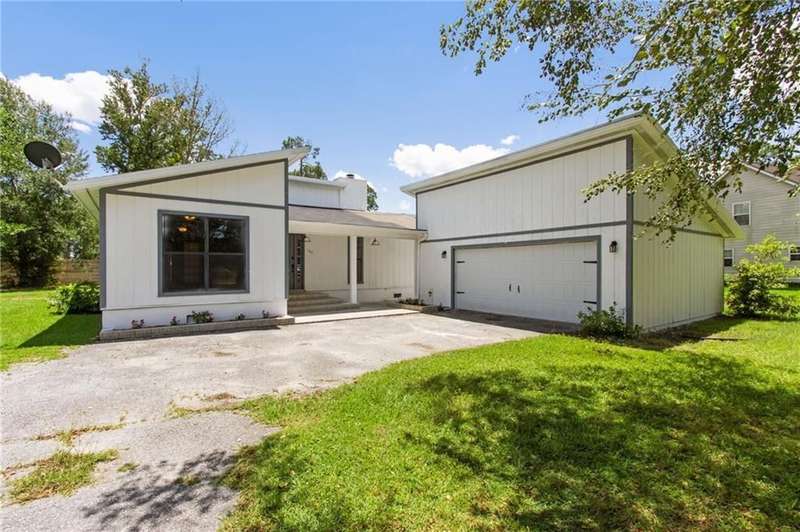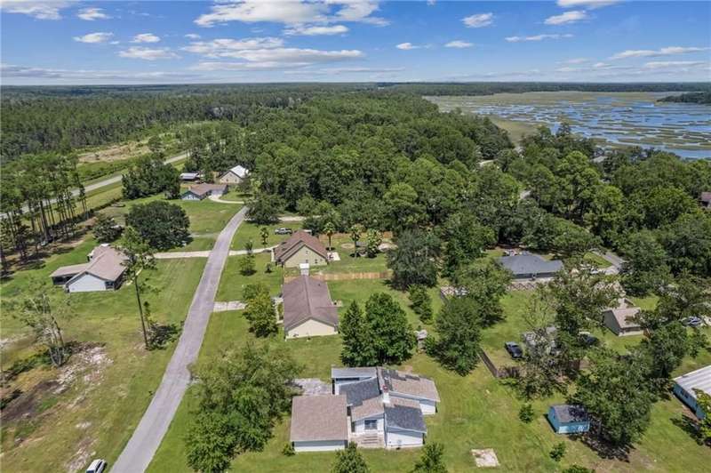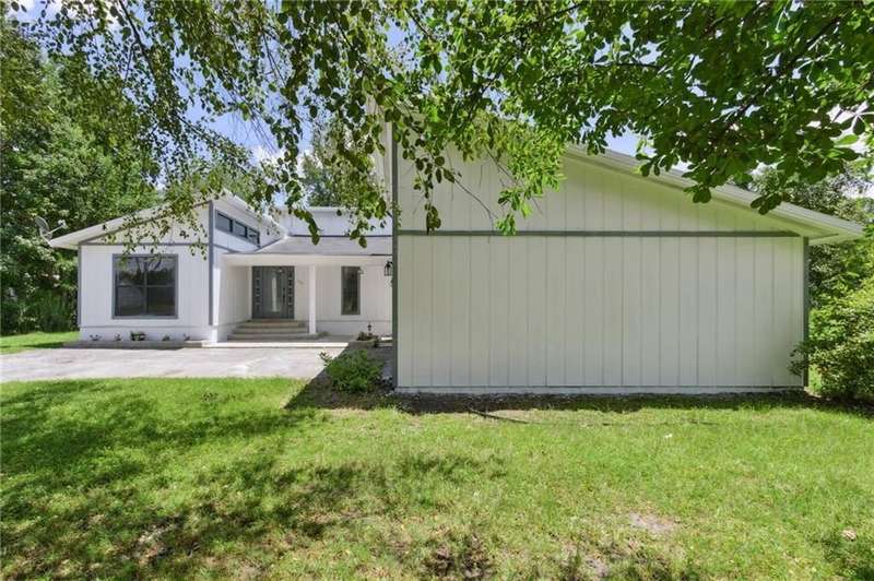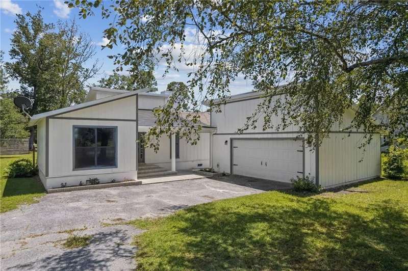 This one-of-a-kind lean-to style home showcases unique architectural character and a smart, functional interior layout. A spacious front porch welcomes you, along with a detached two-car garage offering plenty of storage and parking. Step inside to a semi-open floor plan featuring two flexible living areas that can be used as a living room, family room, dining area, media space - or whatever suits your lifestyle. High-set windows bring in beautiful natural light while maintaining your privacy. The home features wood-look tile flooring in the living areas and kitchen, with laminate in the bedrooms. The primary suite includes a private en suite with a tiled shower. Enjoy cozy evenings by the wood-burning fireplace in the living room. The kitchen is well-appointed with stainless steel/black appliances and solid surface countertops. Located just minutes from the public boat ramp and outside city limits - enjoy the benefits of no city taxes while staying close to everything you need.