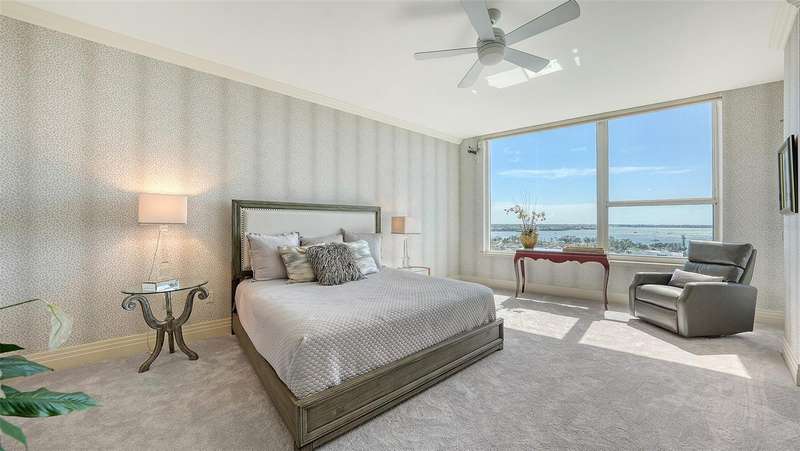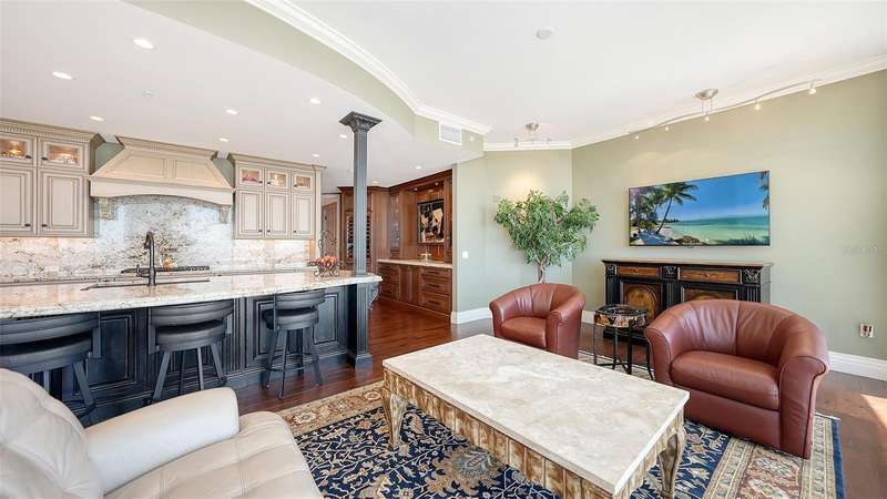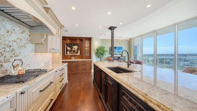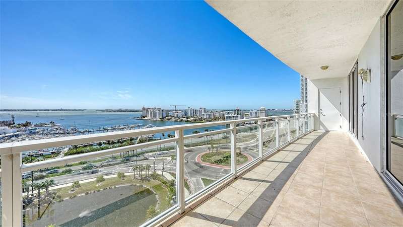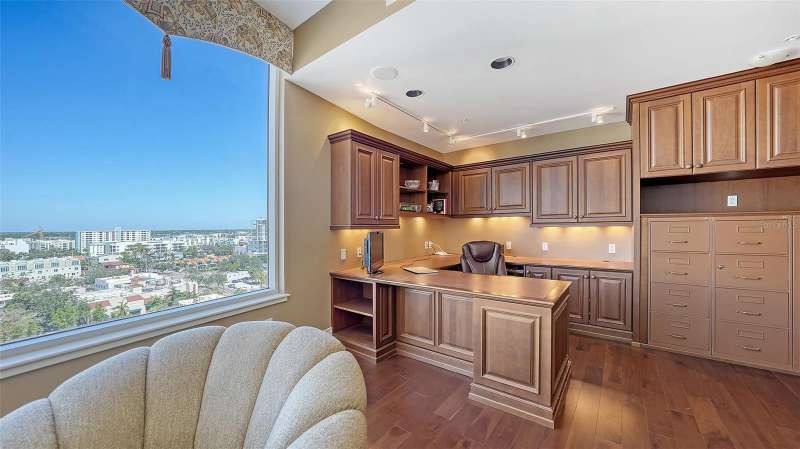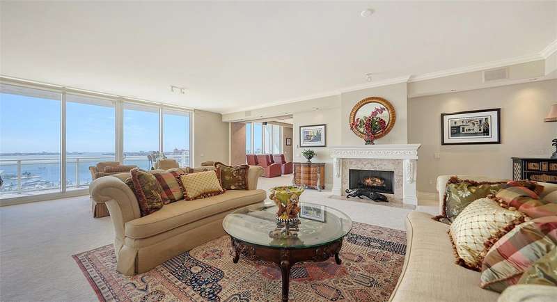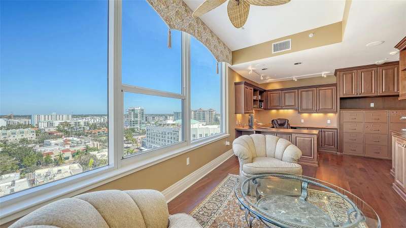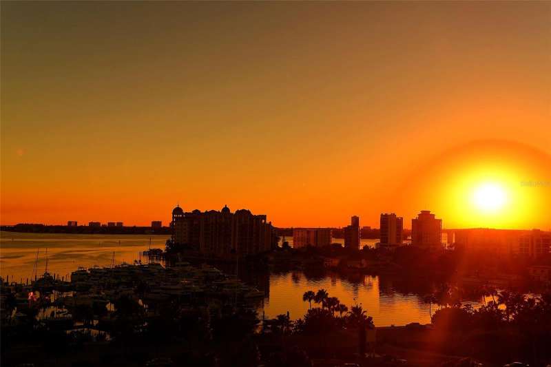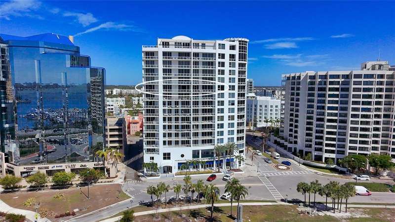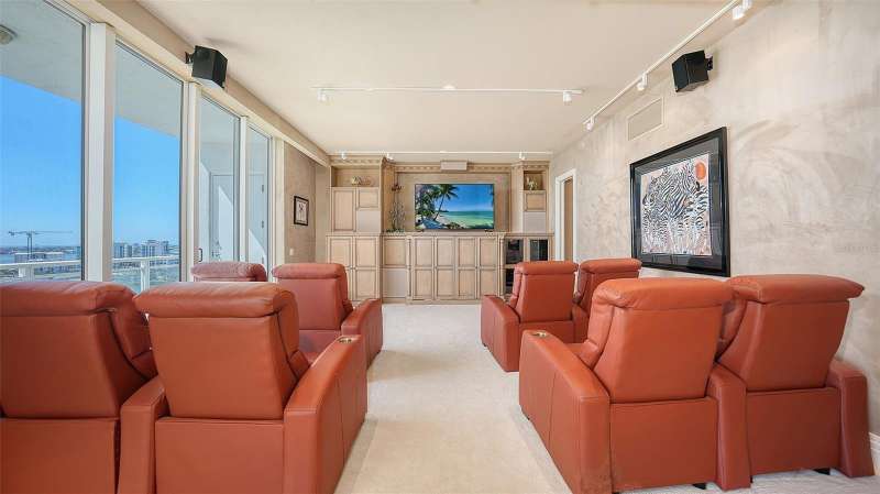 MAJOR PRICE REVISION. Marina Towers, Sarasota’s premier bayfront building is in the heart of downtown and offers 365* views of unimpeded bay, marina, gulf, and city views from this 10th floor, 5,800sf residence with an expanded terrace and high ceilings. A private elevator lobby opens into a Grand Salon featuring a gas fireplace and a wall of floor to ceiling windows overlooking the picturesque vistas. The large rooms throughout the residence with endless panoramic viewpoints make this a unique living experience. Delight in a gourmet chef's kitchen highlighted with top-of-the-line appliances including a Wolf gas range, Wolf ovens, Miele dishwasher and a Sub Zero refrigerator and a large pantry closet. A separate catering kitchen is perfect when entertaining larger groups, and spacious dining room and separate intimate dining space are ideal for family gatherings or intimate dinners. The bar area includes a handsome built-in wine cellar. A home theater and the family living areas are well-designed for everyday living. The floor plan lives like a sizable home accommodating 4-bedrooms, 3 en suite plus an oversized den/office with views for everyone. The primary suite has two large walk-in closets and a spacious bathroom. Both the primary and secondary suites overlook Sarasota Bay. Marina Tower offers the epitome of contemporary living in our vibrant bayfront city, boasting full-service amenities including 24-hour concierge and security. This is a pet-friendly, amenity-rich community featuring a chic outdoor heated pool/spa area, fitness center, and a community room with catering kitchen. Additionally, owners have access to a guest suite. This pet friendly community allows two pets with no weight limit. Clever building design allows owners to drive into the gated building, with concierge service available to assist with shopping bags and packages. Added unique features are room-size storage areas plus four secured parking spaces. Sarasota Bay’s famous sunsets and sparkling blue water as far as the eye can see with the heart of Downtown Sarasota, abundant dining, shopping, and entertainment mere steps away.