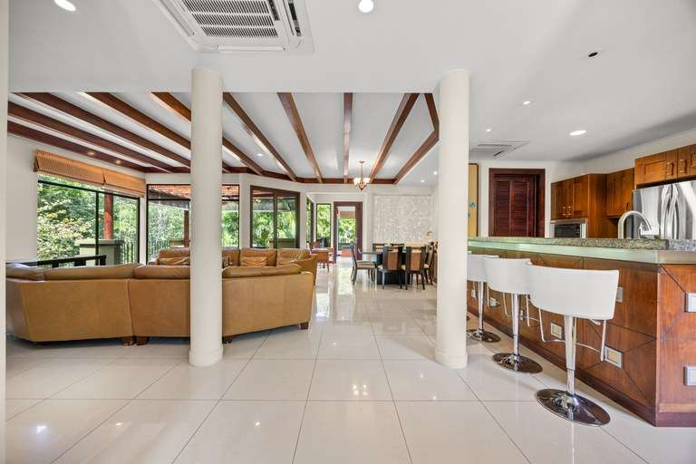 From the grand foyer to sunlit interiors, Villa Carao 12 exudes sophistication. High ceilings, natural wood accents, and premium finishes complement open-concept living and dining spaces, while a gourmet chef's kitchen boasts top-tier appliances, bespoke cabinetry, and ample counter space. Walls of sliding glass open to multiple terraces, inviting tropical breezes and panoramic views, creating seamless indoor-outdoor living that embodies Costa Rica's famed pura vida lifestyle.