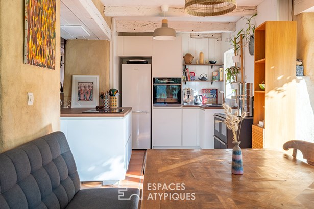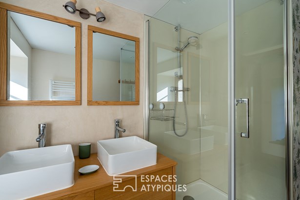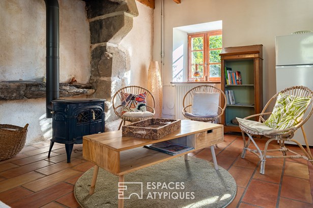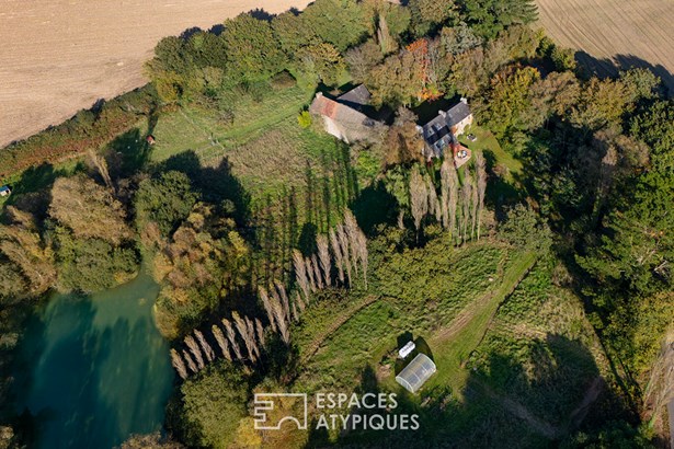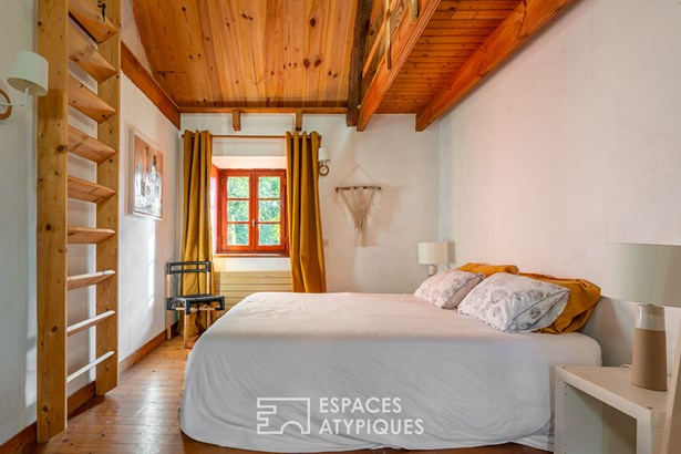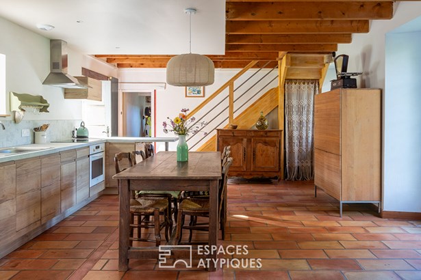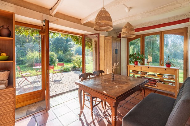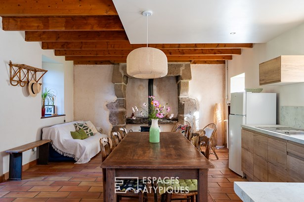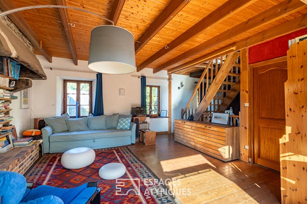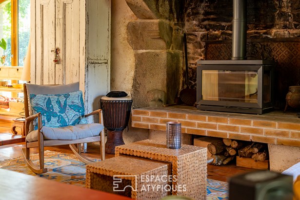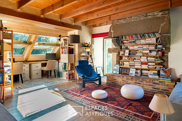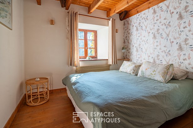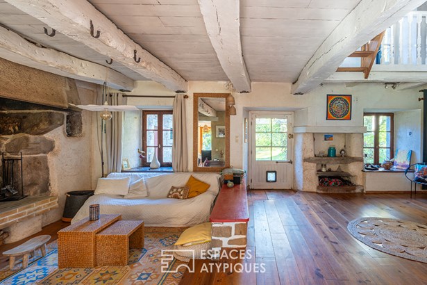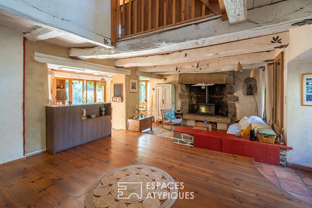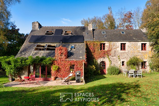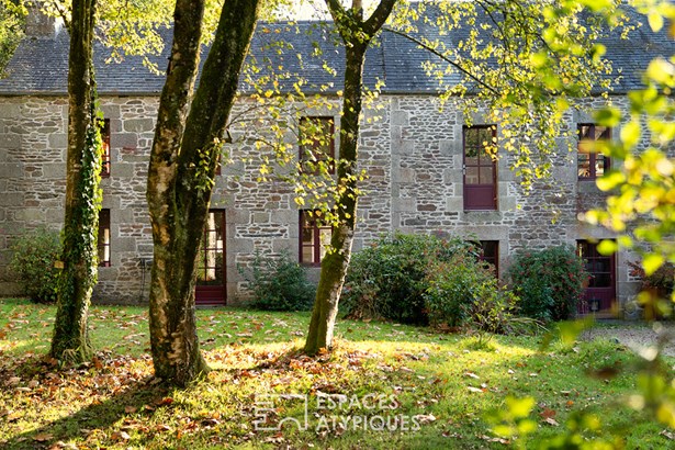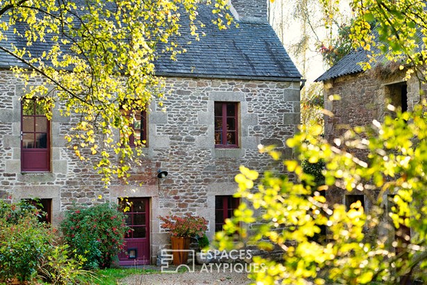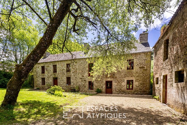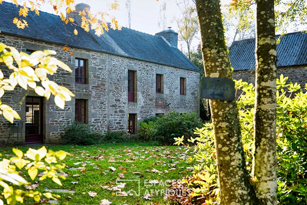 At the edge of a path that gently disappears under the trees, where the landscape opens onto unspoiled nature, a characterful property is revealed, nestled in the heart of 3.7 hectares crossed by water. Here, a stream winds between meadow, orchard and undergrowth before joining two ponds, like a natural breath that punctuates the life of the place. Built in 1864 and composed of two stone houses linked together, this plural address offers several ways of living: a family home with the feel of a refuge, a main residence complemented by an independent gite or a life project combining hospitality, creation and sharing. The recently redesigned kitchens and two wood-burning stoves instill a warm atmosphere, while the exposed framework, the through volumes and the patinated stone tell, in filigree, the intact soul of the building. In the first house, the living room, warmed by a wood-burning stove, becomes the heart of the place. Stone, beams, and lime plaster envelop the room in a mineral softness. As an extension, the renovated kitchen opens onto the dining room in a spirit of fluid conviviality. The dining room naturally extends towards the terrace, like a threshold between interior and landscape. Direct access leads to the south-facing terrace, inviting you to extend your outdoor life to the rhythm of the seasons. Upstairs, a vast, bright landing accommodates a relaxation or office space with an unobstructed view of the garden. Led by the light under the eaves and the presence of books, this space exudes the soul of the place and invites both work and daydreaming overlooking the landscape. A bathroom and a toilet complete this level. Under the eaves, the bedroom nestles beneath the roof frame, offering an intimate cocoon. The exposed stone and the ancient curve of the wall alcove recall the origins of the place. Connected by the ground floor but also benefiting from its own independent access, the second house can live independently. Its living space, organized into a living room and open kitchen, opens onto its dedicated terrace, creating an intimate outdoor space. Animated by a wood-burning stove, this warm volume allows you to imagine a gite, a guest house or an independent reception area, without breaking the link with the whole. On the south side, each house has its own terrace facing the garden. Upstairs, two bright bedrooms, extended by a mezzanine space offering extra sleeping or reading corner, make up a warm sleeping area, completed by a bathroom with a refined style. Set back, the old stables, built in stone and developing more than 200 sqm on the ground, offer an exceptional volume to reinvent. A building permit with change of use to residential use has been validated, opening the way to numerous scenarios: charming accommodation, creative workshops, or professional place in the heart of nature. An independent workshop and garage complete this functional complex. The 3.7 hectares envelop the place like a living setting. The meadow opens onto an orchard, the stream traces the path to the two ponds, and a garden greenhouse extends the spirit of culture and life to the rhythm of the seasons. The hiking trails, the greenway and the equestrian paths naturally extend the property into the surrounding countryside, like an invitation to get some fresh air at any time. In respect of this preserved environment, the property is partially equipped with solar panels and a wood pellet boiler insert, reinforcing its energy autonomy in a logic of coherence with the surrounding nature. Only 15 minutes from Morlaix and 20 minutes from the beaches, this rare place combines freedom of space, authenticity and inspiration. A unique address, for those who dream of an art of living in the heart of nature, at the gateway to the Monts d'Arree, at the crossroads of possibilities.