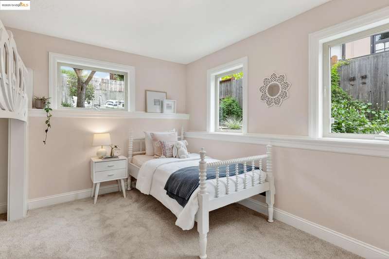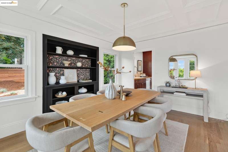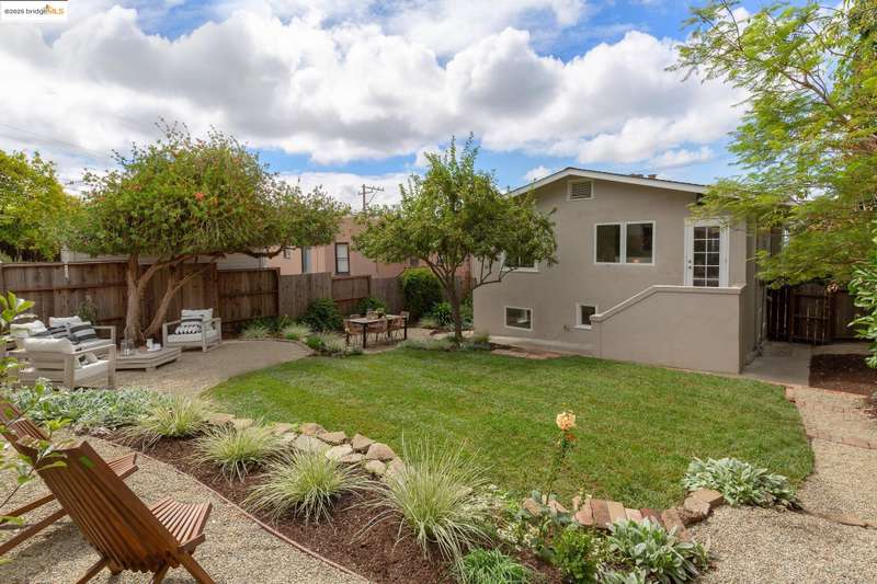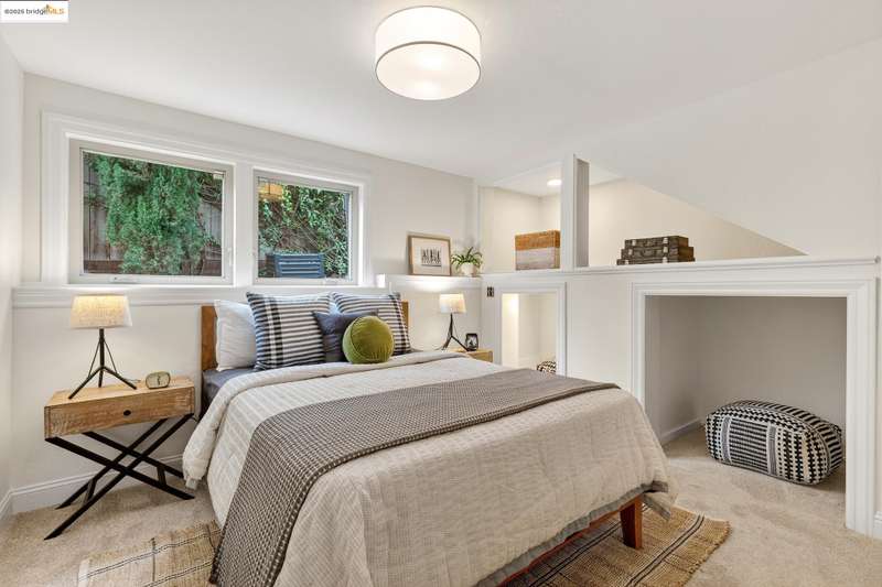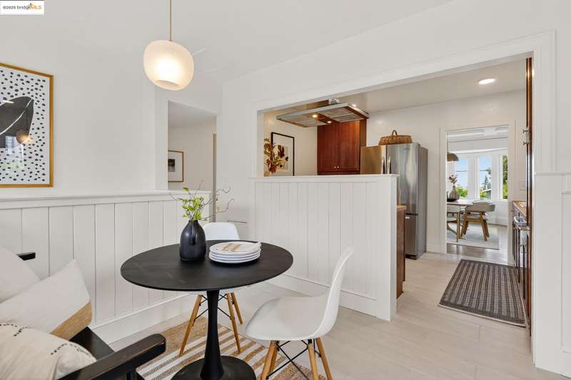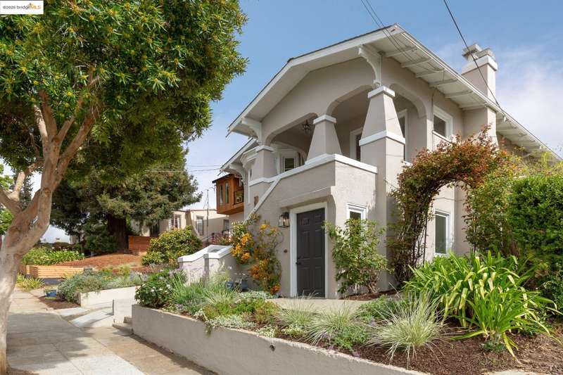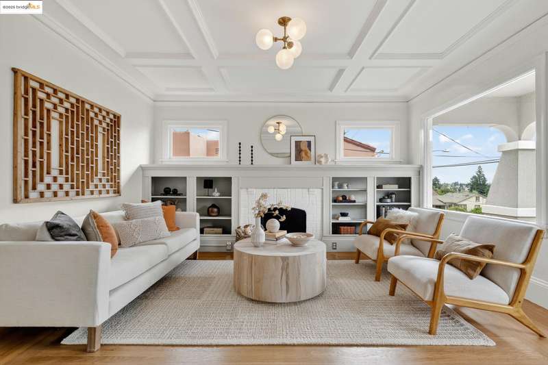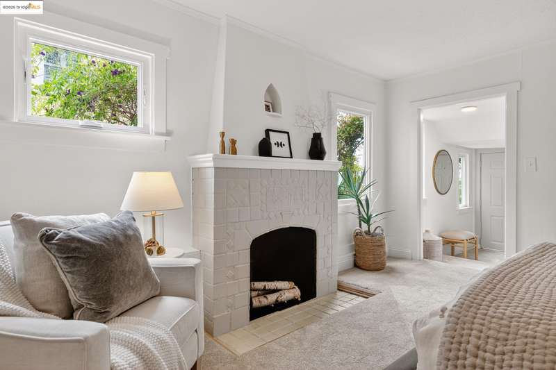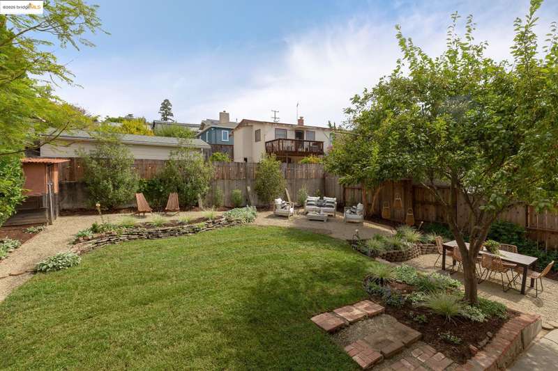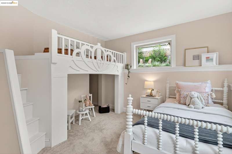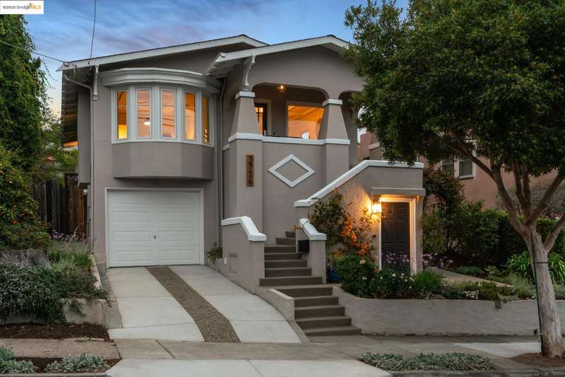 Lovingly maintained by the same owners for 22 years, this thoughtfully updated 4-bedroom, 2-bath home blends vintage character with modern comfort. The main level features a dining room with a beautiful original built-in and five-window bay, a living room with wall-to-wall built-ins flanking the fireplace, and inlay-detailed hardwood floors. The kitchen and bonus dining area open to a lush, flat backyard with mature fruit trees and plenty of space to dine, lounge, and play. A sunny bedroom and vintage full bath with hex tile complete this level. Downstairs offers three large bedrooms, including a versatile suite with original embossed-tile fireplace, laundry room, exterior entry, and interior garage access—perfect for a home office, guest quarters, or rental potential. Two bedrooms share a whimsical tunnel closet; one features a custom princess loft. A full bath remodeled in 2022 adds modern style while honoring the home’s vintage charm. With a newly paved driveway, one-car garage, and central location just blocks from Laurel District favorites—World Ground Coffee, Sequoia Diner, Degrees Plato Taproom, Farmer Joe’s, and more—you’ll love the easy access to both SF and the South Bay, plus weekend escapes to Redwood Regional Park for hiking, biking, and riding.
