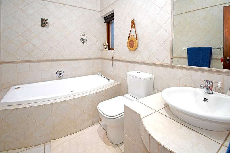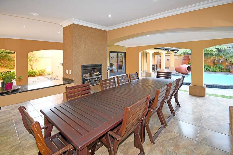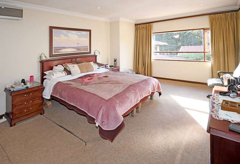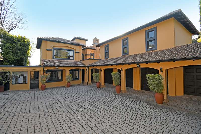 New Release! An Exceptional Home with a Mediterranean Influence. Nestled within a 24-hr access controlled road closure. This home offers every modern convenience while exuding timeless elegance, comfort and casual entertainment. The double volume entrance flows seamlessly into the reception areas that include the private formal lounge, open-plan family lounge, dining room and gourmet kitchen .The outdoor entertainment area offers a covered patio, built-in braai overlooking a private Roman designed courtyard with water feature. A separate entertainers wing designed for year-round enjoyment features a fitted air conditioned gentlemen's bar, cloakroom, cloakroom with shower opening onto a tropical garden with sparkling rim-flow pool. Upstairs the home features 3 bedrooms,(optional conversion to 4) 3 bathrooms. The air-conditioned master suite complete with walk-in closet , palatial bathroom and access to balcony. 3 garages with additional storeroom. Above the garage is a versatile 70m2 room, - studio, private home office, or easily convertible into a guest suite. Staff accommodation. Features include, borehole, automated irrigation system, 5000L water backup tank, solar inverter installation, exceptional security system.