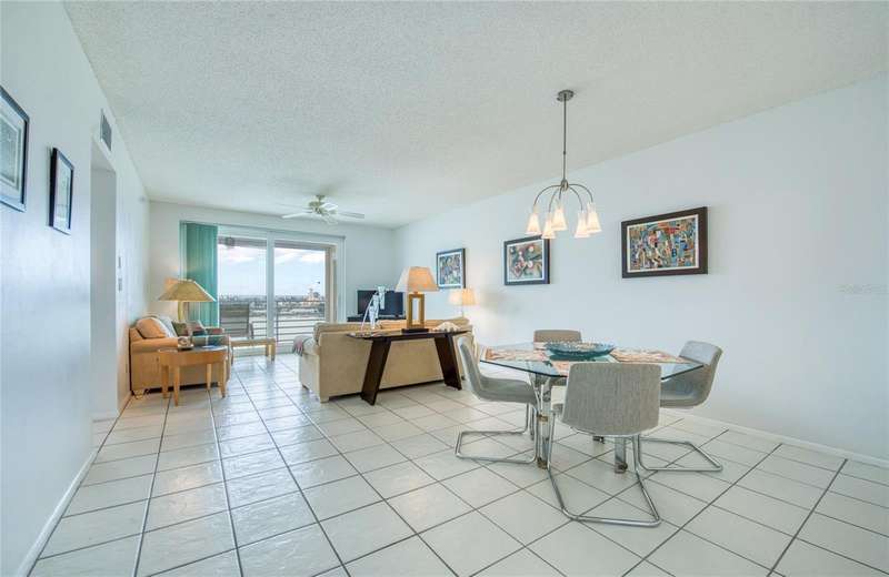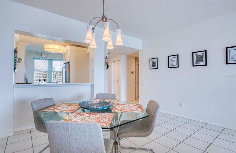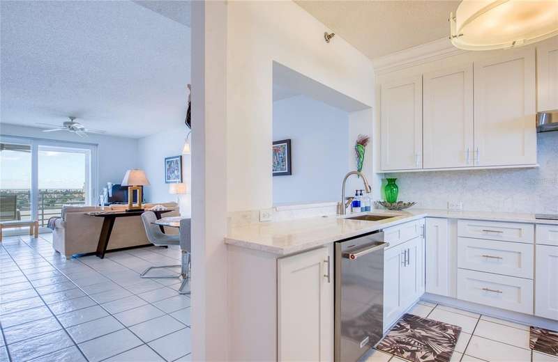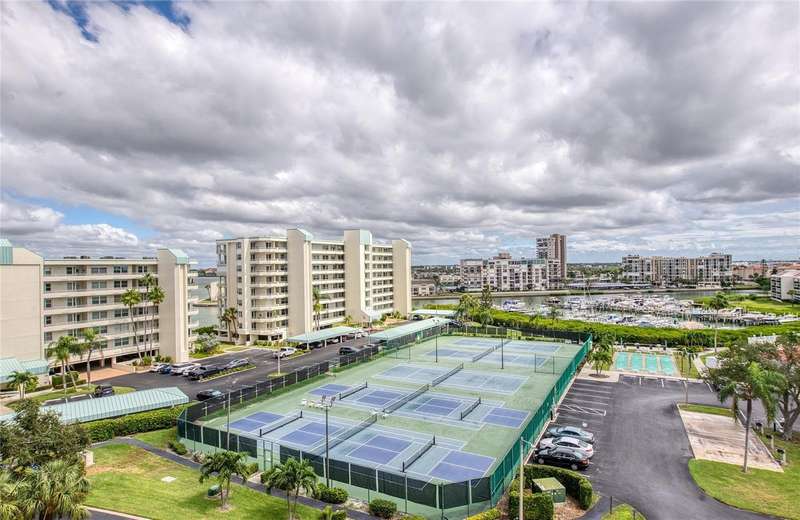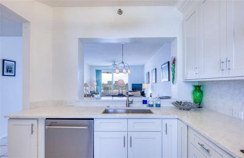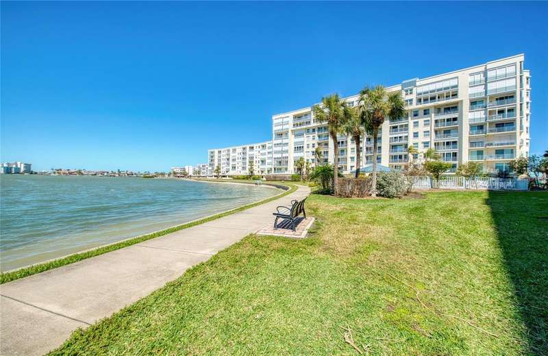 Beautiful waterfront views of both the Gulf and Boca Ciega Bay. Light colored ceramic tile flooring throughout. The 9 foot ceilings give the unit a spacious feel. The kitchen has been totally remodeled with new shaker style cabinets, quartz countertops, soft close drawers and cabinets, and stainless steel appliances. The principal bedroom features a walk in closet and an ensuite bathroom with a whirlpool tub. Other upgrades include new hurricane shutters (2022), hurricane impact windows in the kitchen, the guest bedroom and hurricane impact sliders in the living room. The water heater was replaced in 2024 and the washer/dryer in 2023. Under Bldg parking space #60. Award winning JMC Properties used solid steel reinforced concrete construction. Building 9 has TWO ELEVATORS. Building was recently inspected and painted. Harbourside is a guard gated (24 hour) complex with many amenities including pool, his and hers fitness centers, shuffleboard, pickleball, tennis, hot tub, electric car charging stations, car wash stations, recently renovated clubhouse with many social events throughout the year, library, card room, billiards room, arts and crafts room, wood working area, yoga and water exercise classes. There is a 1.5 mile walkway around the complex along the waterfront which is lit up for nightly walks. Come see what resort living in Florida is all about.