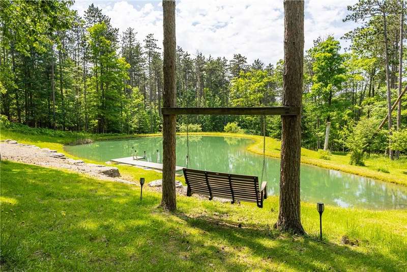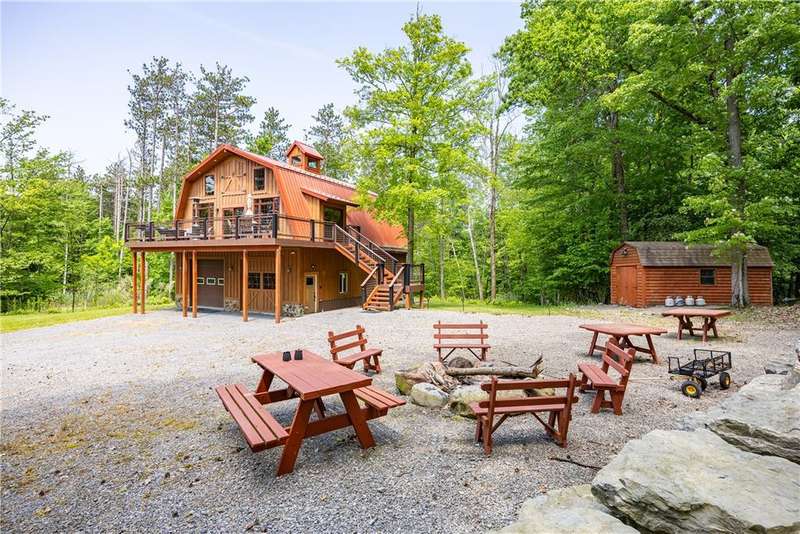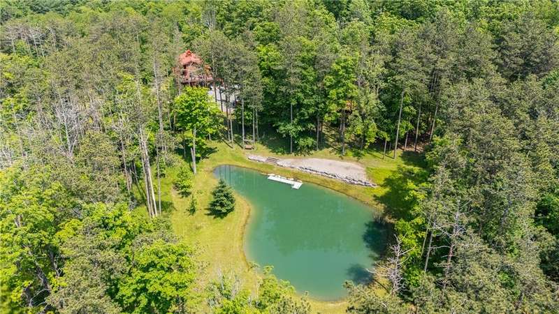 5+ ACRES OF OUTDOOR FUN MEETS LUXURY CUSTOM BUILT POST & BEAM FAMILY COMPOUND!!!!!! WOODS, POND & CAMPFIRES COMBINED WITH RITZ CARLTON ACCOMMODATIONS - ALL WITHOUT GETTING ON AN AIRPLANE!!! GORGEOUS MAIN CABIN AND AMPLE MULTIUSE LIVING SPACES TO ACCOMMODATE EXTENDED FAMILY AND FRIENDS!! PLUS LUXURY BATH CABIN, A GORGEOUS SPRING FED POND CLEAN ENOUGH TO SWIM IN, WALKING TRAILS, & WOODS!!! THE MAIN CABIN -->>HAND CRAFTED CUSTOM FINISHES ON ALMOST EVERY SINGLE SURFACE! POST AND BEAM CONSTRUCTION, MULTIPLE WOOD SPECIES IN THOUGHTFUL HAND-MADE CONSTRUCTION AND DESIGN ELEMENTS, CUSTOM RAILINGS, SPA BATH, AND MORE!! MAIN CABIN SLEEPS 12 COMFORTABLY W PRIMARY SUITE, HUGE KIDS SLEEPING LOFT, AND LOWER-LEVEL BEDROOM/GAME AREA W 1/2 BATH & KITCHENETTE!!! AND CHECK OUT THE MAN CAVE/GARAGE WITH BUILT IN CRAFTSMAN CABINETS! DETAILS NOT TO BE MISSED: RADIANT HEAT FLOORS, TONGUE & GROOVE BEAMS, CHEF'S KITCHEN WITH WOLF GAS RANGE, CUSTOM COPPER MADE RANGE HOOD, BUILT IN WALL OVEN & FRIDGE, HUGE CUSTOM-BUILT HAND-HEWN WOOD TOPPED ISLAND SEATS 7, HAMMERED COPPER SINK, CUSTOM BANQUETTE SEATS 6 OR MORE, WRAP AROUND DECK, WINDOW SEATS, PRIMARY SUITE WITH SPA BATH: CUSTOM STONE SURROUNDED SPA SHOWER W MULTIPLE JETS, JETTED TUB, CUSTOM VANITY & STORAGE! OWNER DESIGNED & OWNER HAND CRAFTED ELEMENTS INCLUDE TIMBER BEAMS MADE OF LARCH, BUILT-INS & BENCHES MADE OF CHERRY, & TABLE AND SPIRAL STAIRCASE TO LOFT MADE OF OAK (MOST CAME FROM THE LAND ITSELF!). CUSTOM STORAGE SPACES, CUSTOM CUT WROUGHT IRON SCREEN STAIRCASES. NO EXPENSE WAS SPARED & CRAFTED WITH CARE - CANNOT BE DUPLICATED! 11 MINUTES TO DROP YOUR BOAT INTO CONESUS LAKE, 30 MINUTES TO ROCHESTER AREA, AND TONS OF WINERIES/BREWERIES AROUND THE FINGER LAKES - TAKE YOUR PICK - TOO MANY TO COUNT!!!!! THIS IS NOT WHAT YOU REMEMBER FROM SLEEP AWAY CAMP! FUN IN THE SUN: SWIM, HIKE, PLAY... AT NIGHT, STARGAZE, CAMPFIRES OR SPA BATHS - YOU CHOOSE! THIS IS YOUR FOREVER HOME TO MAKE A LIFETIME OF MEMORIES WITH FRIENDS AND FAMILY!