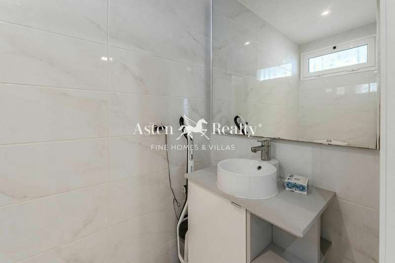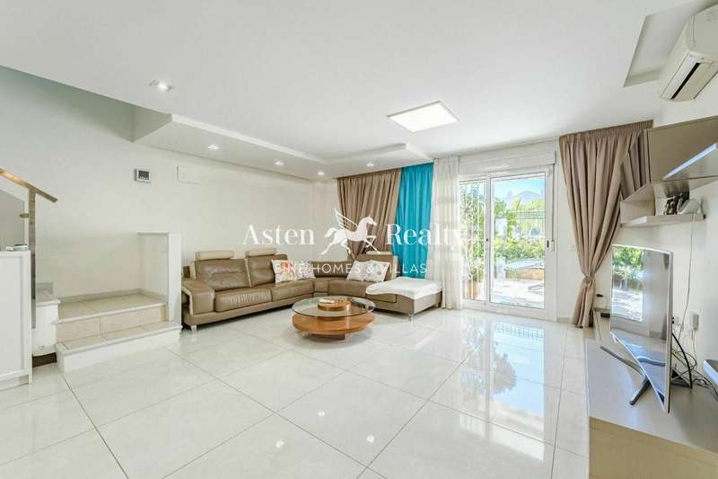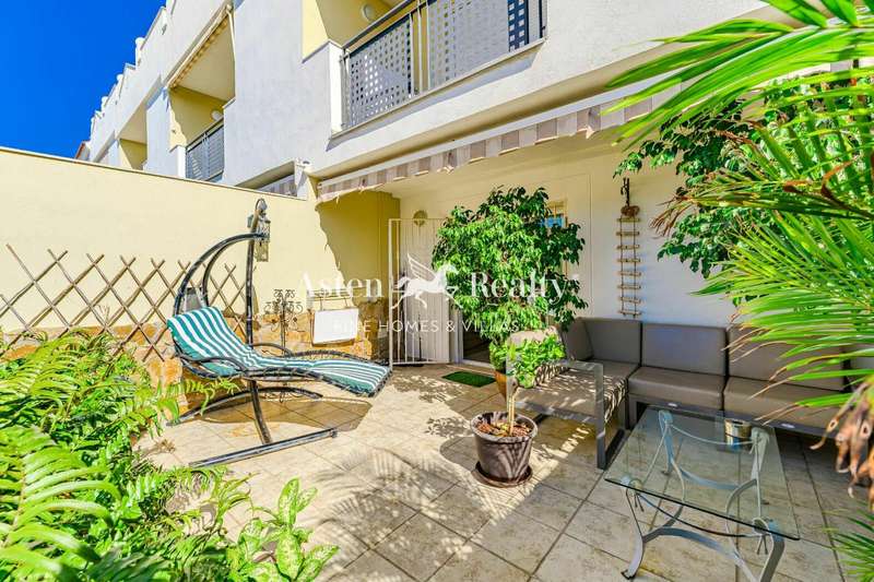 Entering the property from the street, there is a small patio and porch leading to the front door of the townhouse. On the ground floor there is an open plan kitchen completely refurbished in a modern style, a toilet, a spacious living room with access to the covered back terrace of approximately 40 m2, decorated with garden furniture and plants.