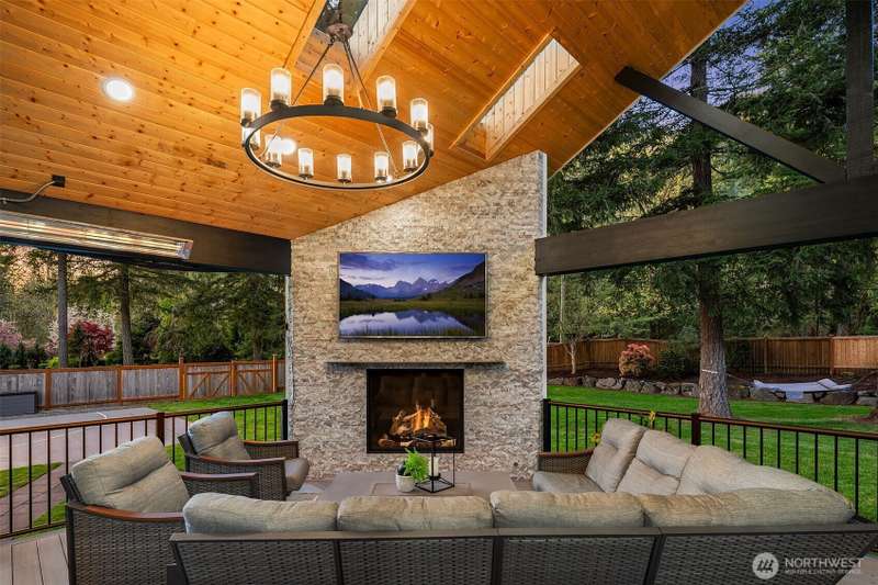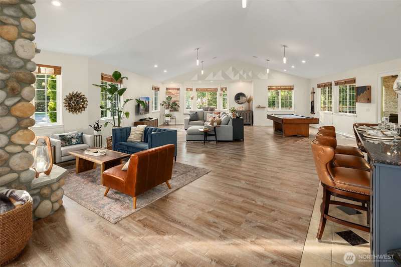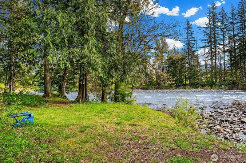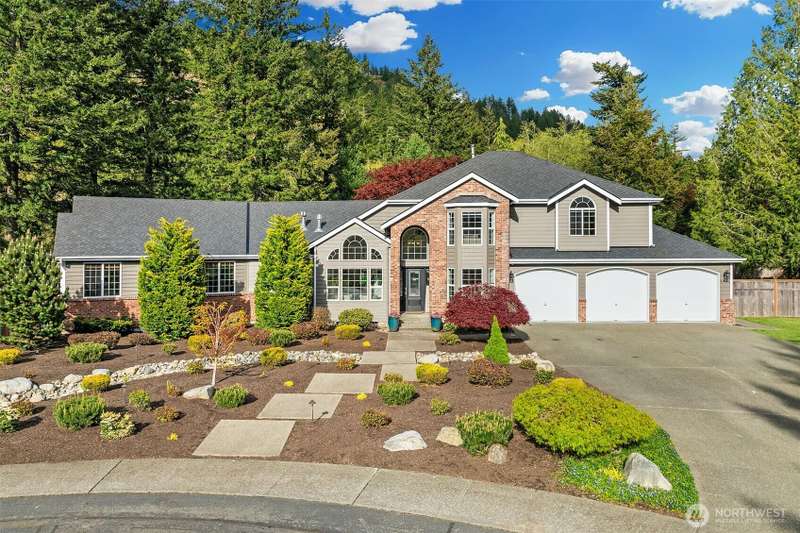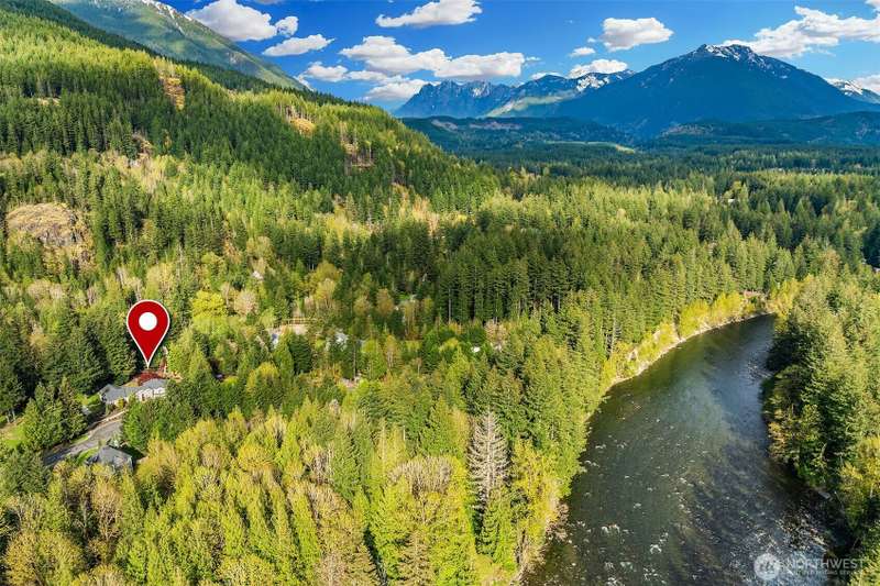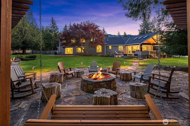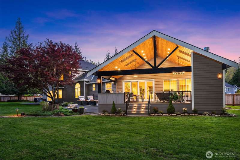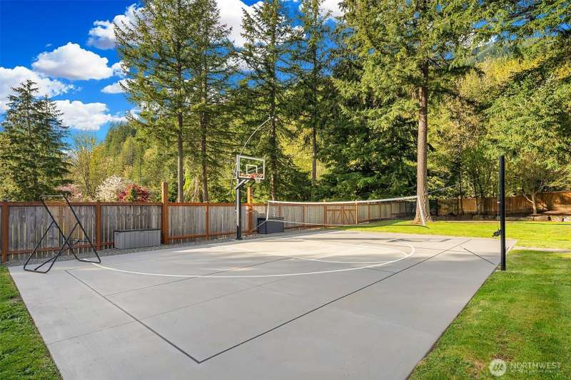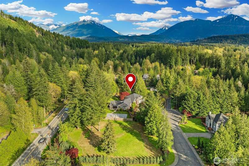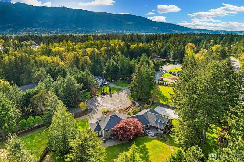 Rare opportunity to live in the coveted and GATED community of River Si! This beautiful home sits on just under 2 acres, nestled between majestic Mount Si and the Snoqualmie River. UNDIVIDED COMMUNITY OWNERSHIP INTEREST IN PRIVATE WATERFRONT ACCESS TO HUNDREDS OF FEET OF WATERFRONT. Gorgeously updated kitchen to include Thermador appliances, quartz countertops and marble backsplash. New flooring, paint, roof, toilets, and updated powder room. Large entertainment wing addition includes wet bar area, river rock fireplace and bathroom added to home in 2005. Large custom outdoor living space complete with gas fireplace, TV, infrared heaters, custom rain/wind curtain, BBQ and chandeliers. Large custom sports court. Minutes from I90 and town.