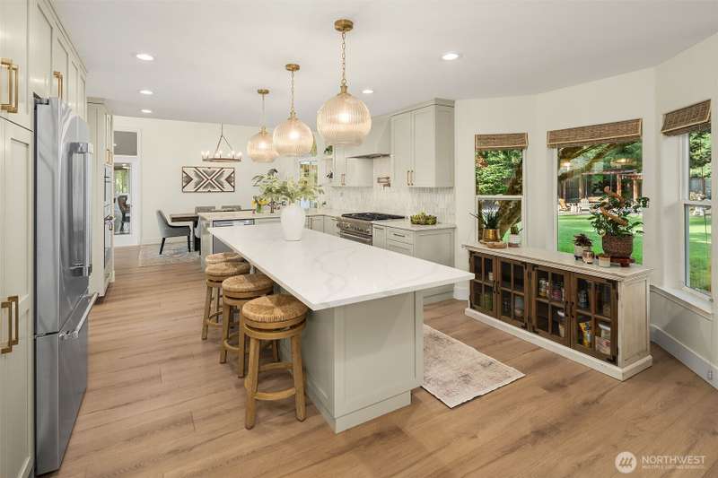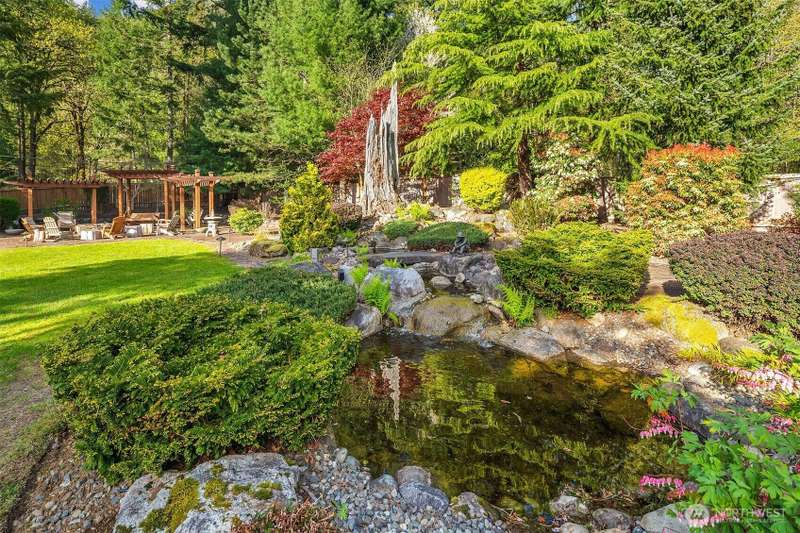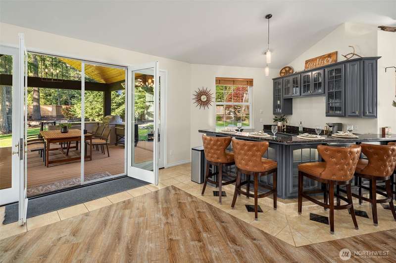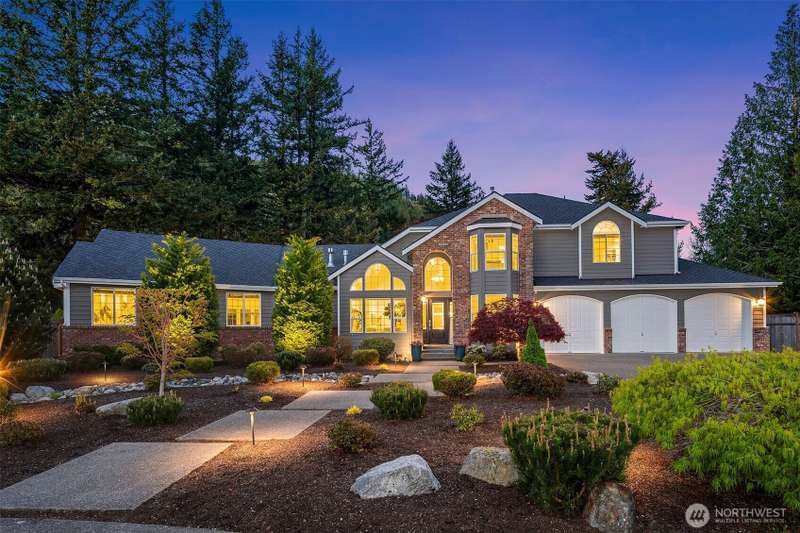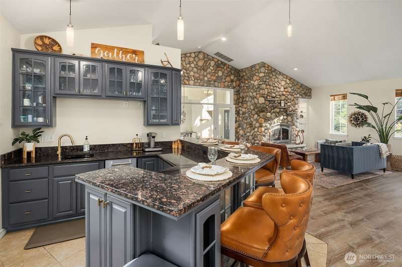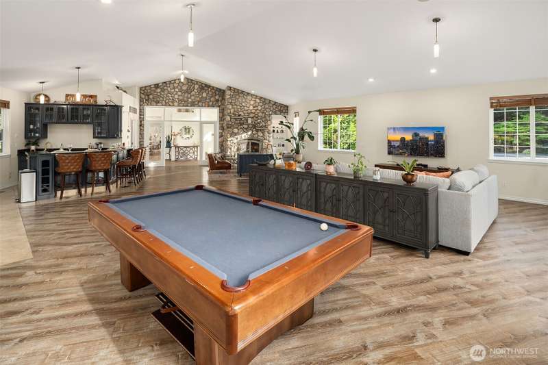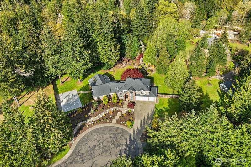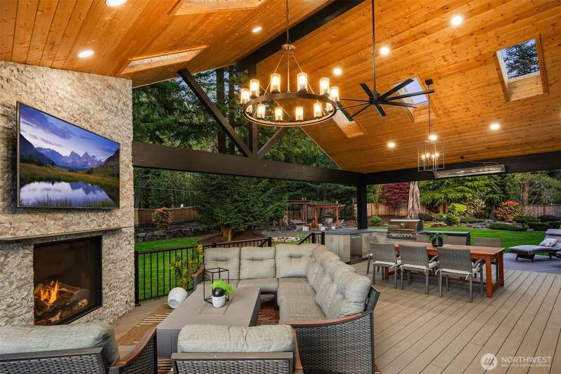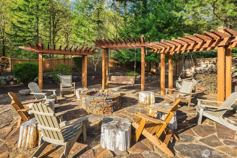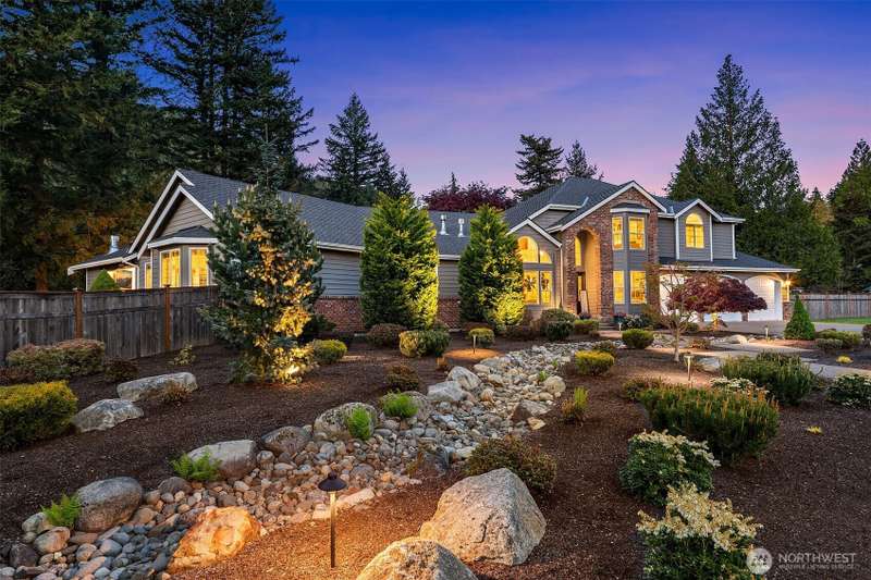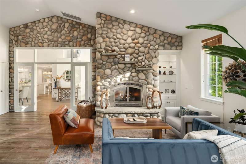 Rare opportunity to live in the coveted and GATED community of River Si! This beautiful home sits on just under 2 acres, nestled between majestic Mount Si and the Snoqualmie River. UNDIVIDED COMMUNITY OWNERSHIP INTEREST IN PRIVATE WATERFRONT ACCESS TO HUNDREDS OF FEET OF WATERFRONT. Gorgeously updated kitchen to include Thermador appliances, quartz countertops and marble backsplash. New flooring, paint, roof, toilets, and updated powder room. Large entertainment wing addition includes wet bar area, river rock fireplace and bathroom added to home in 2005. Large custom outdoor living space complete with gas fireplace, TV, infrared heaters, custom rain/wind curtain, BBQ and chandeliers. Large custom sports court. Minutes from I90 and town.