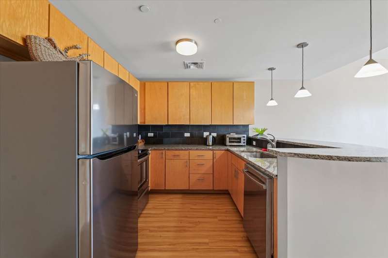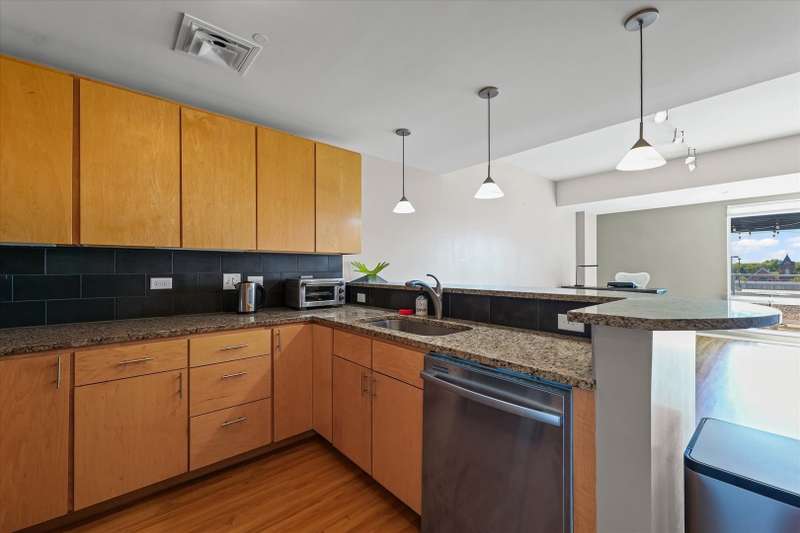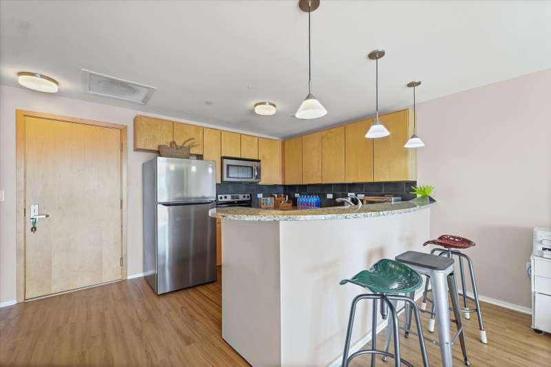 Experience modern downtown living in this beautiful condo at the sought-after M2 building, right in the heart of Champaign. Enjoy the peace of mind that comes with a secure building while being steps away from the city's best restaurants, shops, and entertainment. This stylish one-bedroom unit is highlighted by a rare and expansive private patio-perfect for relaxing or entertaining. Inside, the open-concept living area is filled with natural light, and the kitchen boasts elegant natural stone countertops and a convenient breakfast bar. A truly unique find in one of Champaign's most desirable locations!