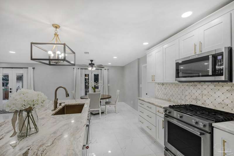 This completely renovated 5-bedroom home offers modern upgrades, timeless design, and a prime location just minutes from Crab Island, HarborWalk Village, Destin Elementary, and Joe's Bayou Boat Launch. The home was fully gutted and rebuilt with new electrical (including panels inside and out), updated lighting with 3-option dimmer controls, ceiling fans, and a Tesla Supercharger compatible with other EVs. A cohesive marble-look large tile flooring flows throughout the entire home, and the bathroom tile and finishes are thoughtfully designed to match for a seamless aesthetic. The open living space features a gas fireplace with new gas lines, flowing into a reimagined kitchen with new cabinetry, KitchenAid gas range, and dishwasher. A built-in speaker system conveys with the home, enhancing both everyday living and entertaining. The primary suite is a true retreat with a massive walk-in closet, spa-style bath featuring a soaking tub, chandelier, and built-in sound system with voice control. A split floor plan offers privacy, and the flooring was installed with full-bed mortar for long-term durability. All new ductwork and two attic fans help keep utility costs down. The roof was installed in 2021. Step outside to your private backyard oasis featuring a brand-new (2024) in-ground, kidney-shaped gunite chlorine pool with new pavers, pump, waterfall, accent lighting, and updated piping. All pool equipment will stay, with most stored neatly in the outbuilding and the vacuum kept outside. Four pool loungers and an umbrella will also convey (swing does not).The backyard also features a new privacy fence with double gate access for boat or RV parking, a climate-controlled storage building, and an enclosed side yard for extra storage. A circular driveway enhances curb appeal, and the newly landscaped yard adds to the home's fresh, modern feel. No HOA. While the City of Destin restricts short-term rentals in this area, some owners still pursue them independently.