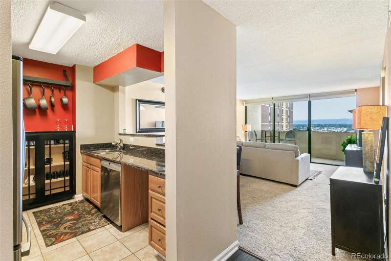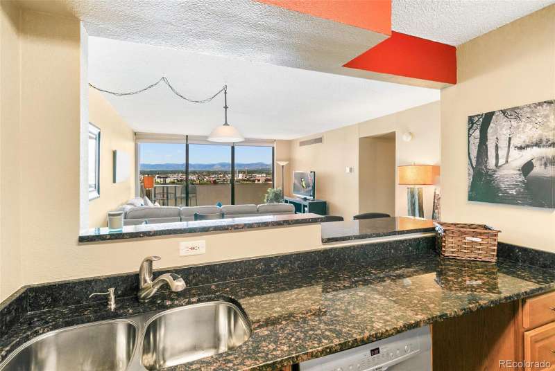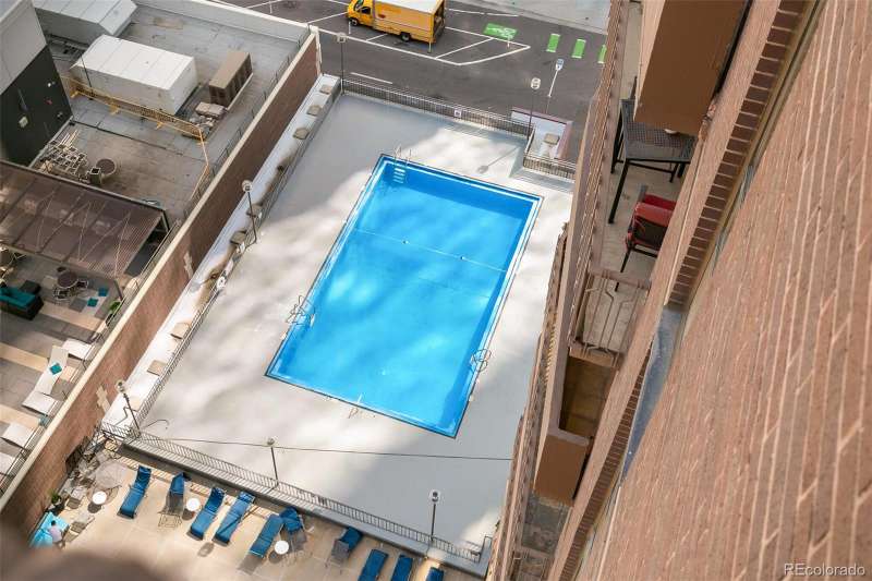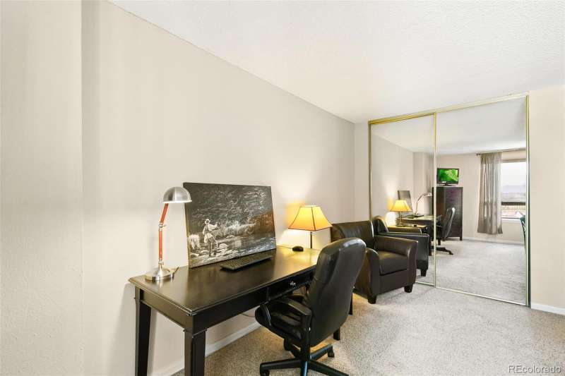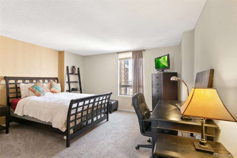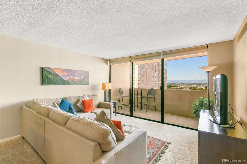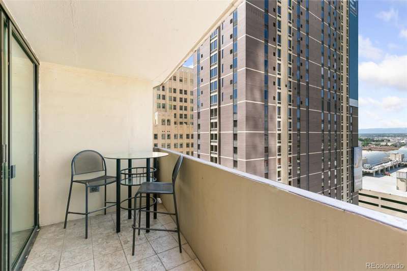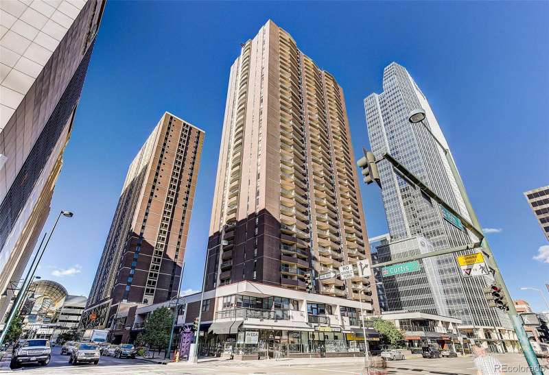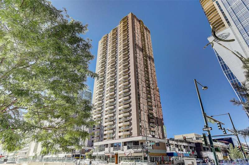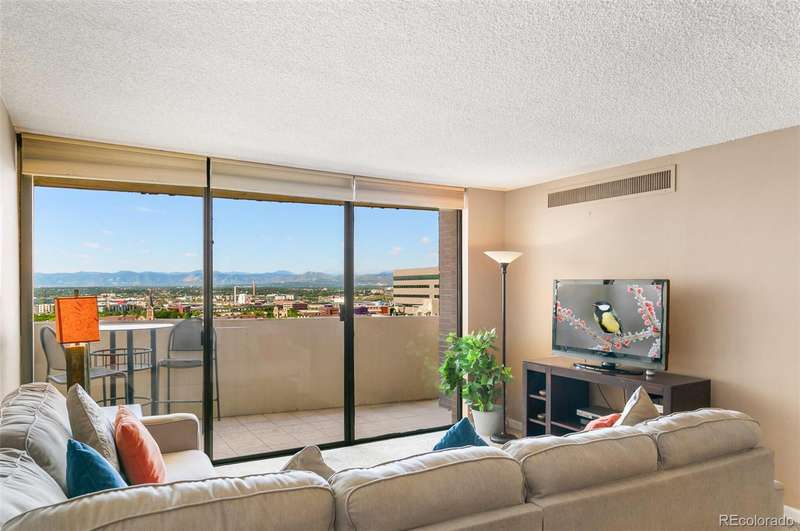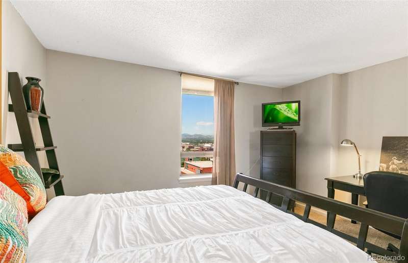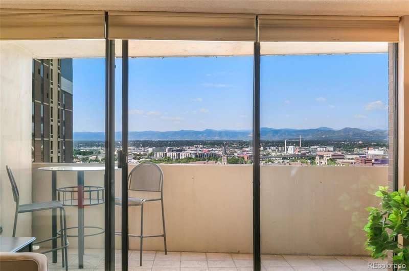 Spacious one-bedroom with mountain views - a beautiful quiet space away from hustle and bustle of downtown life! Thoughtful floor plan with good storage, a smart kitchen layout, and a flexible living space that includes space for an office, dining room or perhaps a workout space. This 16th floor residence faces west with a sunny balcony and abundant natural light. Remodeled over the last 5 years, the bathroom layout is wonderful! The balcony is great to take in a sunset or two, peek at the weather before you head out for a night on the town or a day in the foothills/mountians! With all that downtown has to offer just blocks from theater, nightlife, restaurants, shopping, and easy public transportation all the way out to the airport. Take comfort in a secure building with 24-hour guarded and controlled access. There are options to lease or buy and parking space in the buildings garage. If you need storage, there are storage units available in the building for rent, and bike storage available as well. There are a lot of conveniences to life here - including direct interior access to a hardware store and convenience store from the lobby! The building is pet friendly, and you can take your dog over to Skyline Park just across the block for a little green space. Take advantage of the building's on site management and staff to help you solve life's little issues for a reasonable price - from light bulb replacement to appliance issues and even housecleaning services! Find community with HOA activities, and meet your neighbors in the newly renovated 3rd floor laundry room. Residents have access to a large fitness room and lounge area, as well as a sunny outdoor pool and pooldeck