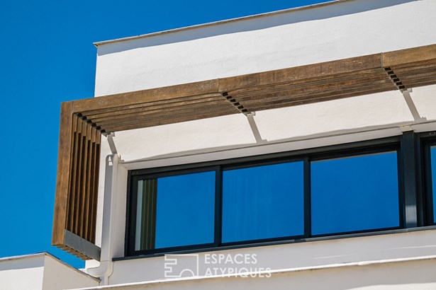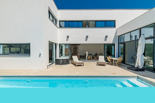 Designed to offer perfect continuity between interior and exterior, the ground floor opens widely onto the terrace and its sumptuous 3 m x 10 m heated swimming pool. It features a bedroom, a vast 86 sqm living room bathed in light, as well as a high-end kitchen fully equipped with Gaggenau appliances. A functional pantry/laundry room and toilet complete this space. An elegant wooden staircase with clean lines, enhanced by a glass railing, leads to the upper floor dedicated to the sleeping areas. The left wing houses a bedroom and a spacious master suite with a dressing room and shower room.