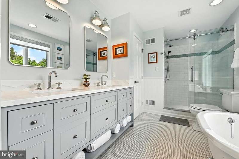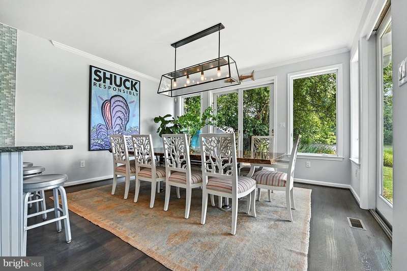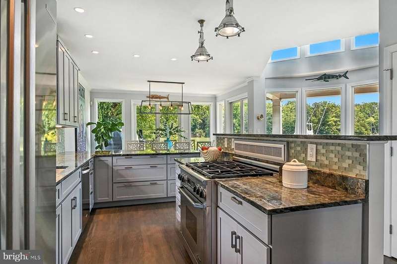 Welcome to 3307 Harness Creek Road-- a Nantucket style, coastal home with spectacular water views, a private backyard oasis and two deep-water piers on protected Harness Creek. This waterside gem, with 190 ft of waterfrontage, is situated directly across from Quiet Waters Park and offers quick access to the South River and the Chesapeake Bay. Inside, you're greeted by the natural warmth pouring in from the numerous floor-to-ceiling windows on the main level. The foyer starts a seamless transition to the living room on one side and the kitchen on the other. A central island draped by granite countertops centers the kitchen. Casual and formal dining options make the home great for entertaining. Adjacent to the kitchen is a walk-in pantry with quartz counters, sink and additional storage. The washer and dryer are also conveniently located here. A cozy sitting area surrounded by bay windows shifts into the main living area. This space features many special details: a wood-burning fireplace, a window seat, and immediate access to the waterside ipe decks. Gorgeous hardwood floors are throughout the house. Closets and a powder room complete the main floor layout. As you approach the staircase to go upstairs, you'll notice the beautiful ribbon striped Sapele treads and one-of-a-kind detailing in the railing construction that add another creative touch to this special home. The two-story sitting area brings the natural light into the stairwell. The primary suite includes a spacious bedroom with fabulous Harness Creek and Quiet Waters Park views. The ensuite bathroom has a double-bowl vanity, soaking tub, and oversized shower with glass tile accent. There are two additional water view bedrooms upstairs and an updated hall bath. On a coveted street close to downtown and providing easy access to Routes 97 and 50, a short walk to the local winery, or a paddle to hiking trails in Quiet Waters Park, this home's prime location and modern interior make it the perfect combination of boater's heaven and entertainer's dream. One of the best features of this property is the privacy in the lush, waterside yard. Adjacent to the main level living room, there is a spacious ipe wood deck with standing seam metal roof. Relax here and watch the paddlers on Harness Creek and the parade of boats and wildlife. With beautiful landscaping and hardscape, the sumptuous yard adds to the serenity of the waterfront scenery. The two private piers complete with water and electric offer tons of options for the serious boater. One pier is 46 ft and includes a 20,000 lb boat lift, 30/50 amp. electric, fresh water supply and has 5+ ft water depth. The second pier, with fresh water supply, is 76 ft long and can accommodate a sizable sailboat; here, the water is 8 ft at mean low tide. The outdoor spaces and interior detailing work in tandem to create a polished encapsulation of coastal living in Annapolis. Major system updates include: new two zone high-efficiency 21 SEER Bosch HVAC systems (2024, 2023), treated water for irrigation, sprayed foam insulation in crawl space, new refrigerator, Dacor dual fuel range with propane cooktop, exterior landscape lighting, alarm system, freshly painted interior, new window treatments, and a new roof in 2022.