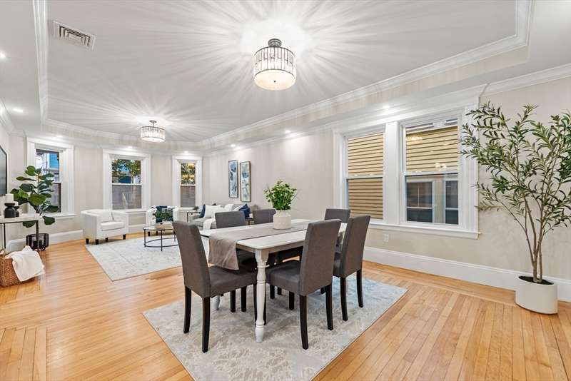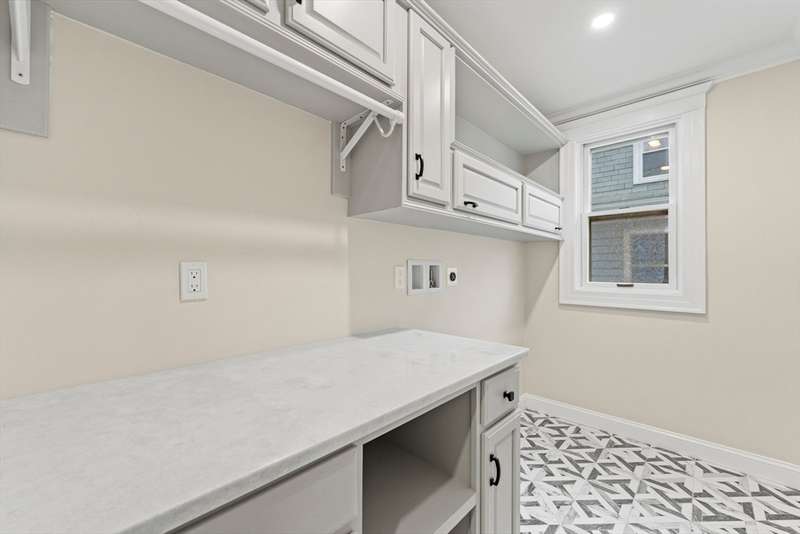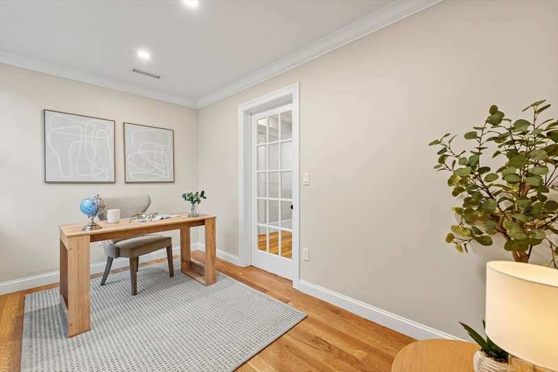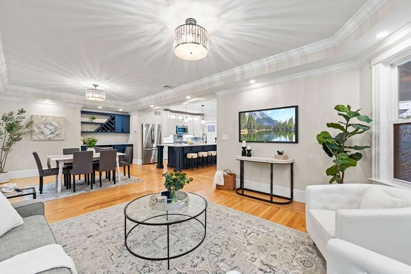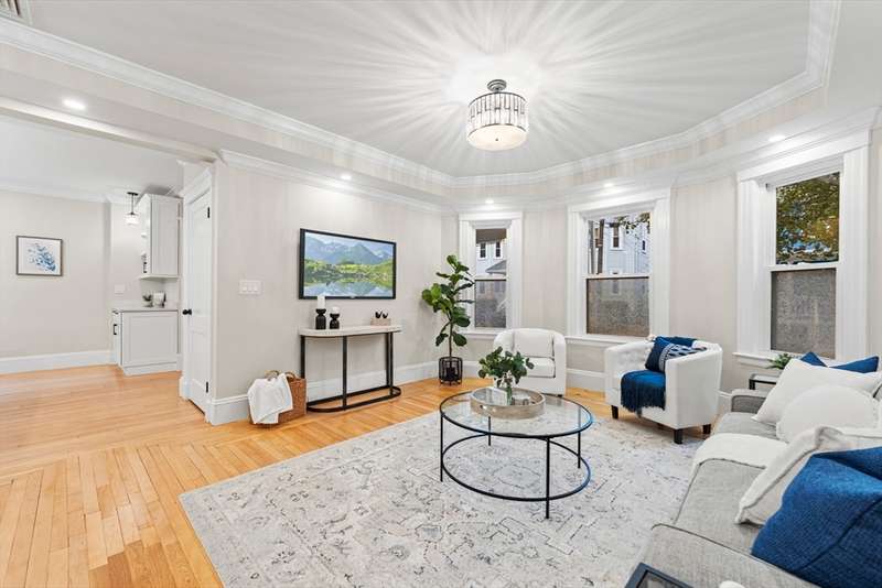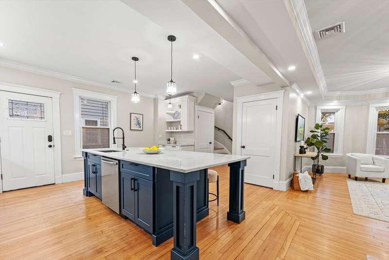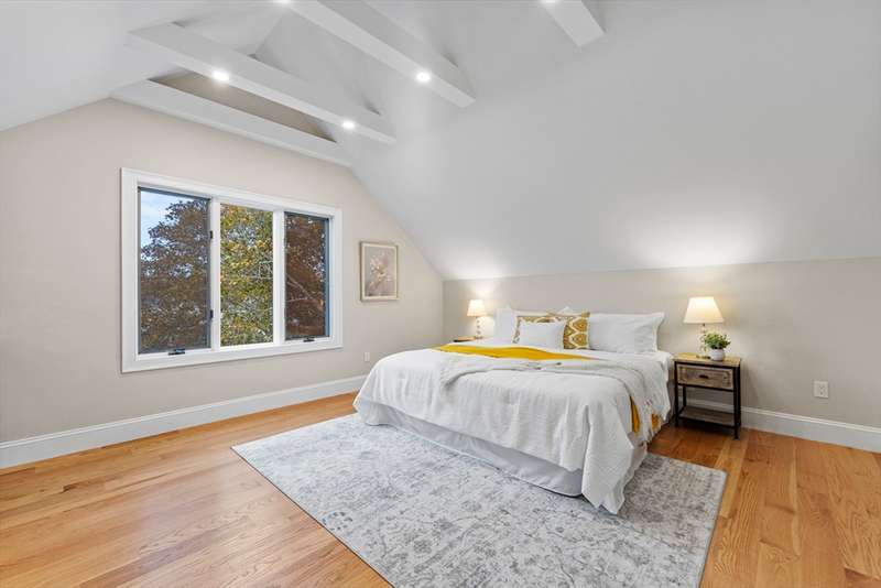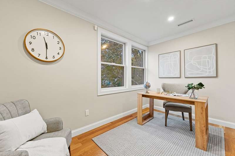 Beautifully designed three-level townhome-style condo offering a blend of modern finishes and thoughtful details throughout. The main floor features an open-concept kitchen and dining area with quartz counters, a 9' island, pot filler, pantry, and custom coffee bar. The second floor includes two spacious bedrooms, a bright office with French door, and a full bath with laundry and custom tilework. The third-floor primary suite offers a beamed cathedral ceiling, fireplace, beverage center, large dressing room, and spa-like bath with soaking tub, dual vanities, and separate shower. Enjoy a private porch, fenced yard with shared patio, and deeded off-street parking with garage. Conveniently located near downtown Salem, restaurants, the waterfront, and commuter rail.