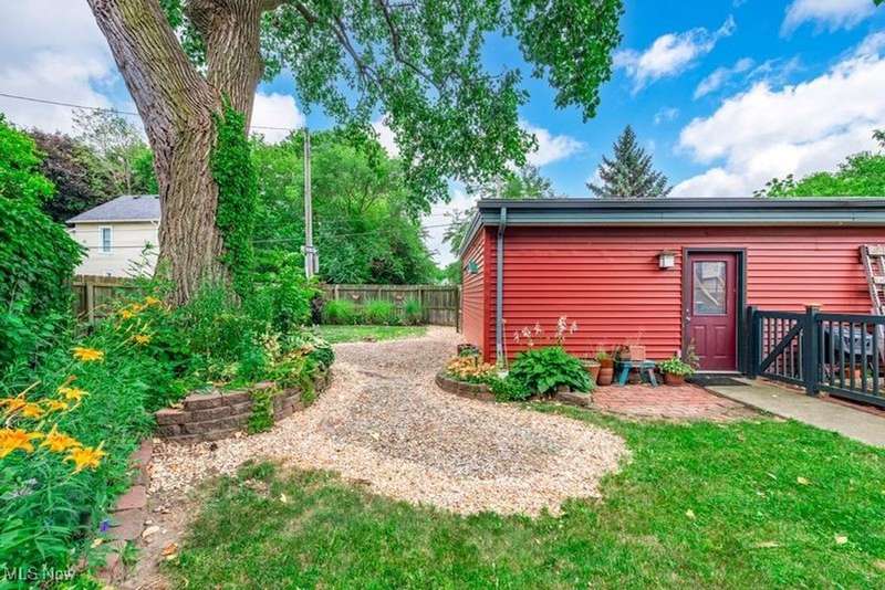 Welcome to this desirable corner townhome in the EcoVillage enclave of Detroit Shoreway, complete with a private rental garden apartment and a 2-car garage. A graceful, wide front staircase and front porch welcome you into the home's entryway. Inside, the 1st floor features real hardwood floors that flow seamlessly from the dining room area to the open-concept kitchen and living space. Expansive windows bring in abundant morning and afternoon light and invite a refreshing cross-breeze throughout the day. The kitchen with its rich wood cabinetry, stainless steel appliances, and a central island ideal for entertaining and everyday living. Just off the kitchen, you'll find a half bath, a walk-in pantry, and a generous under-stair storage area. Upstairs, a bright flex space offers room for a home office or reading nook. One bedroom features newly added bamboo flooring and a mirrored wall that can double as an inspired yoga or fitness space. A full bath and laundry area line the hallway toward the 2nd bedroom. The spacious primary bedroom enjoys soft filtered light through the branches of the Cottonwood tree outside the window, along with a walk-in closet and a private full bath. Step outside to a fully fenced and thoughtfully landscaped backyard that acts as an oversized oasis for people and pets. A paved path leads to the detached 2-car garage. Both the house and the garage have new roofs installed in 2023 and 2025 respectively. The private-entry rental garden apartment adds unique value and versatility to the property. This bright 1-bedroom suite features its own full bath, fully equipped kitchen, in-unit laundry, and open living/dining space perfect for rental income, guests, or extended family. The location of the home is within walking distance to neighborhood cafes, restaurants, wine bars, art galleries, and the W 65th-Lorain RTA rail and bus lines. You will be minutes away from Gordon Square, Edgewater Park, the Lake Erie shoreline, and Downtown Cleveland.