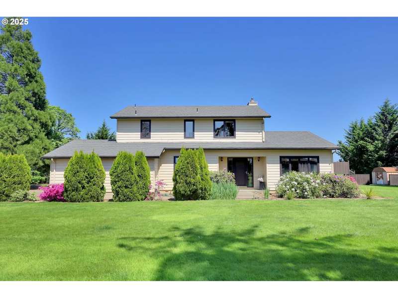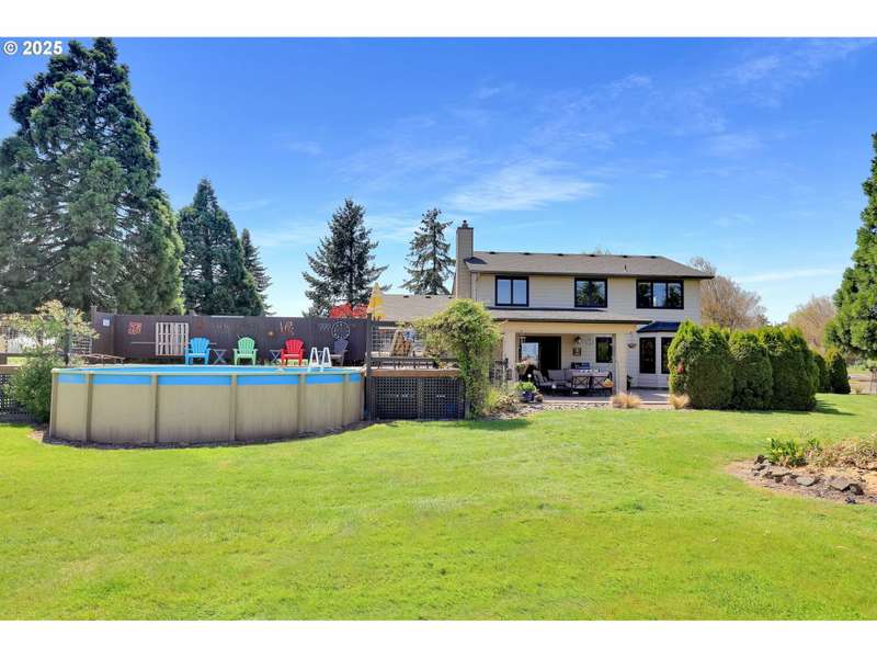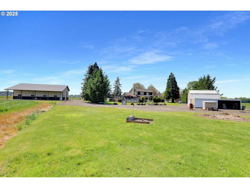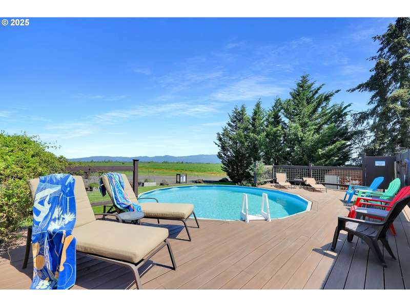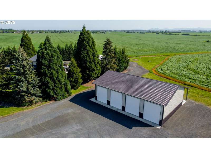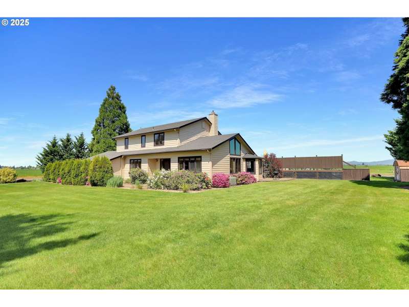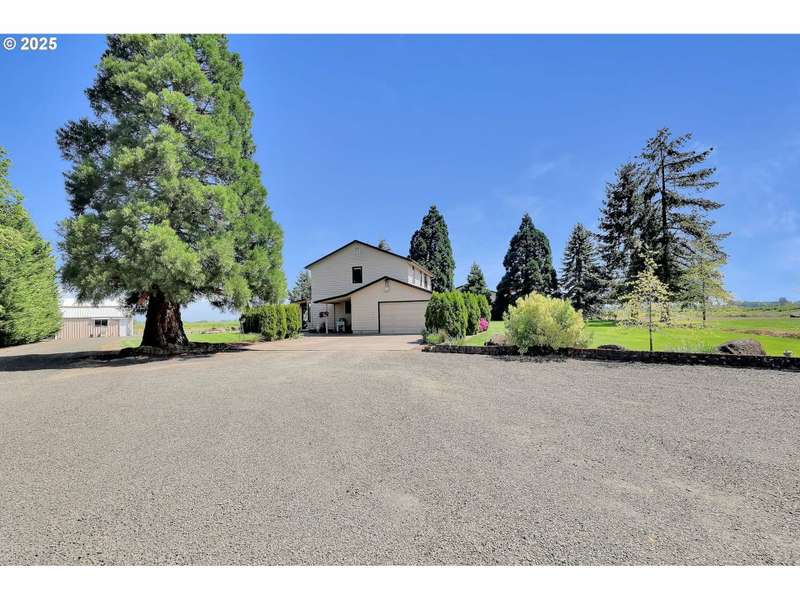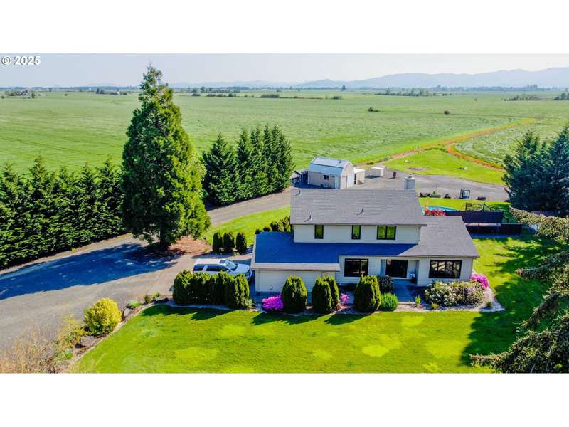 Your 5 acre oasis awaits! This spacious 3 bedroom 3.5 bath home has it all. A light and bright living room with high ceilings and ceiling high windows let in the view. A formal dining room with wood floors is great for entertaining, and the kitchen with double ovens, eating nook and breakfast bar opens up to a cozy family room with rock fireplace. Upstairs you'll find a loft office and 3 bedrooms including the primary suite, that has a large picture window so you can wake up each morning to a lovely view of the field and hills. Enjoy the outdoors on the large stamped concrete patio and an 20' swimming pool surrounded by deck to lounge on. The nearby sun/pool room has 1/2 bath for your pool parties. And you can't miss the 40'x60' shop, big enough to store your motor home and then some, with 12'x60' covered area on the back side, complete with 220V outlets and several 120V outlets, well lit on the inside and out, with water supply including 2 outside and 1 inside faucet. There is plenty of water with 2 wells on the property, one domestic and one irrigation. This all sits in a great location just south of Harrisburg and north of Coburg. This is your dream home! Don't miss it.