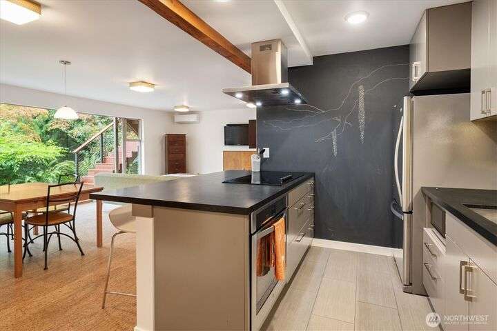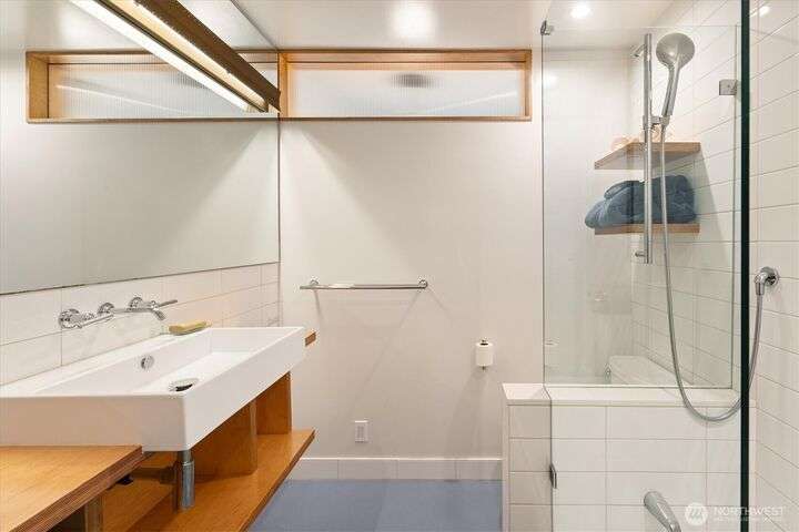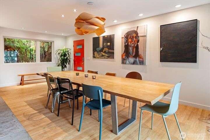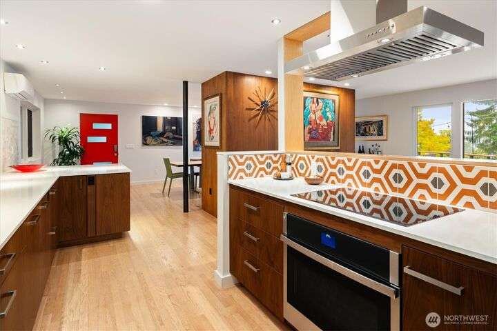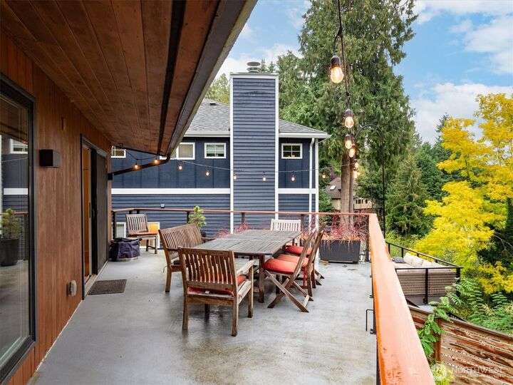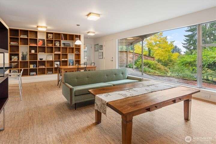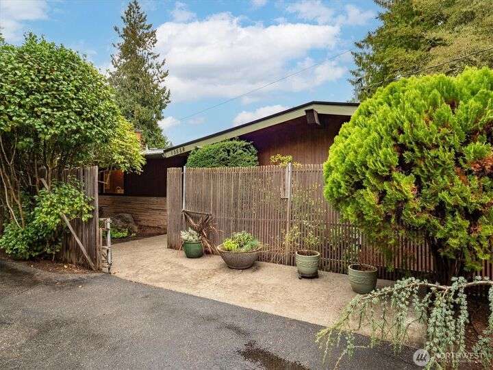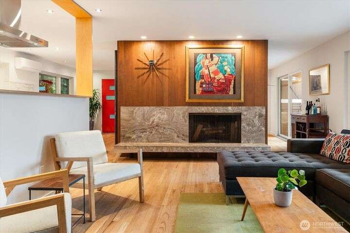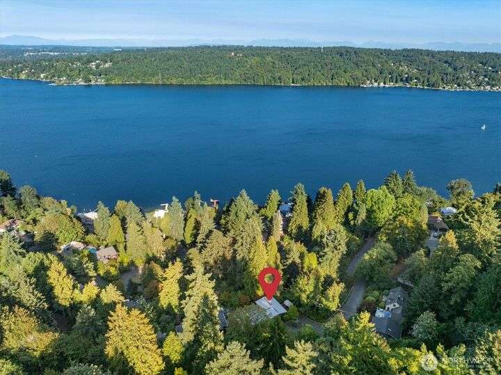 Enjoy the splendor of Cedar Park & the finesse of elevated design in this stunning mid-century modern home. Enter the main floor and you are welcomed by views of Lake Washington from almost every room. The enormous kitchen flows into equally expansive living and dining rooms, bisected by a striking double-sided fireplace. A deck off the dining room offers more superb views of Lake Washington and treetop outlooks. Also on the main floor, primary suite with ample closet space and a fabulous 50s-inspired primary bath and 2 additional large bedrooms. On the lower level (which could easily function as a separate unit), find 2 more bedrooms, a massive rec room with custom built-in book case, a 2nd kitchen, and more views from the patio.