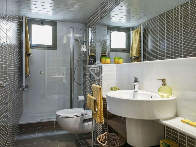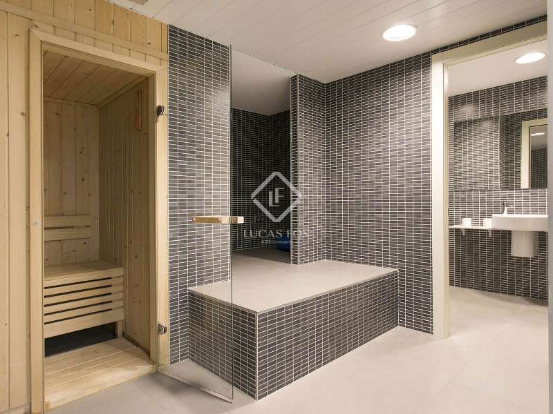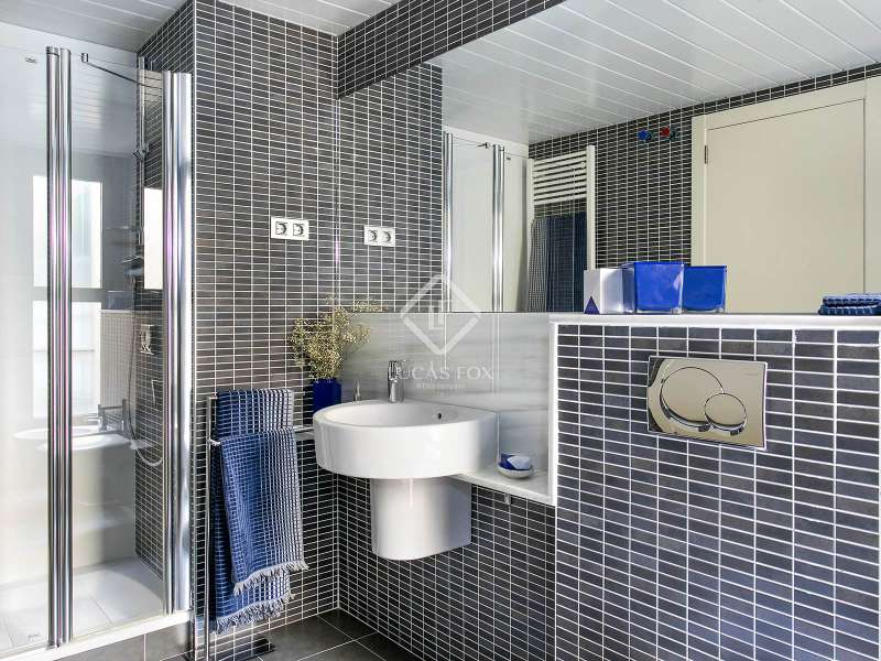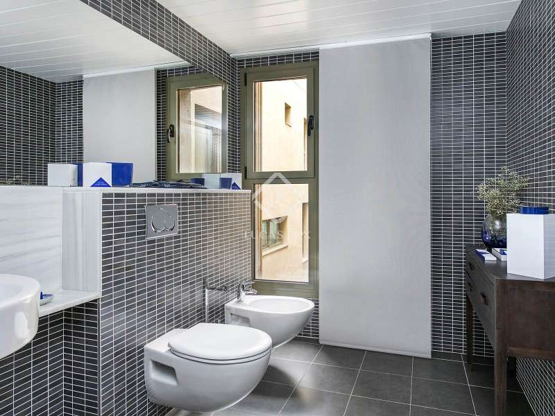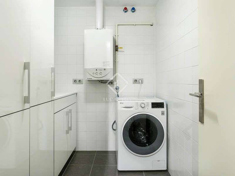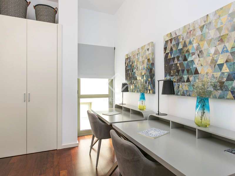 This bright, modern apartment is being sold completely renovated, tastefully furnished, and ready to move into. It stands out for its high ceilings and spacious open-plan living room . Its location in the heart of Barcelona is ideal, yet it enjoys a peaceful atmosphere. Upon entering, a long corridor leads to a bright, open-plan 80 m² space that houses the living room, dining room , and kitchen. The other rooms are to the right of the corridor. There is also a single and double bedroom with built-in wardrobes and private bathroom, as well as an study that could be converted into an additional bedroom . Finally, there is a laundry area with a washing machine and dryer, as well as a full bathroom with a shower. The property has air conditioning and gas heating, while La Finca has a communal rooftop pool and a communal gym on the second floor. It also offers concierge service.