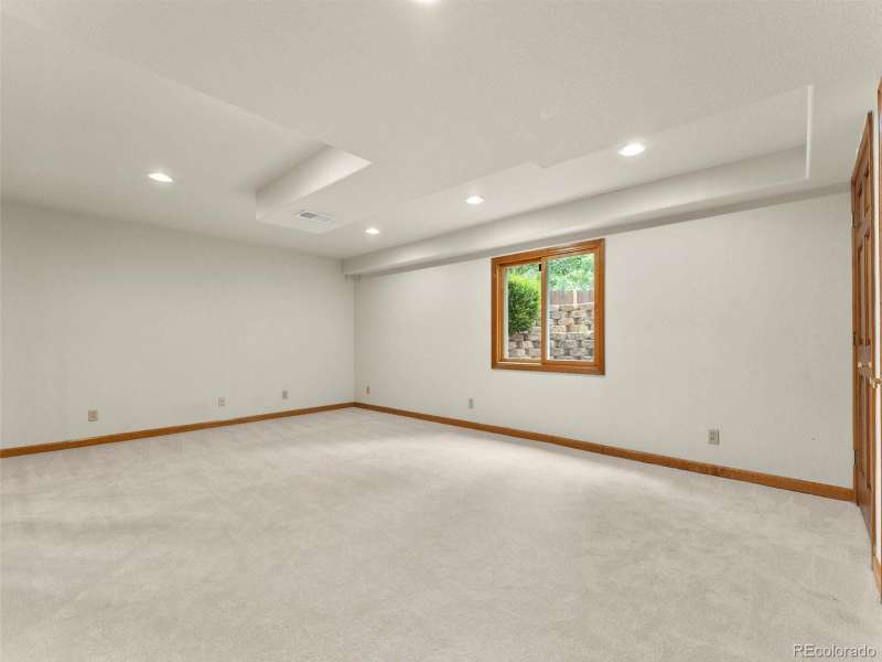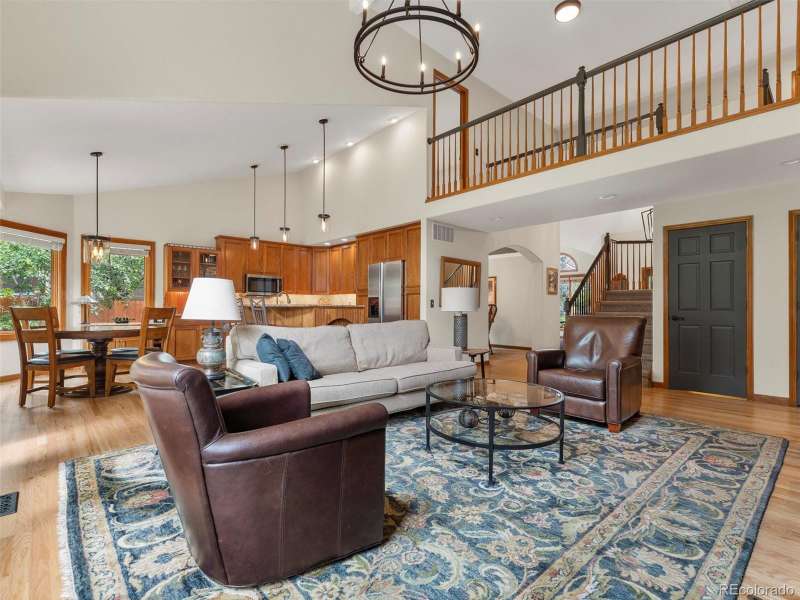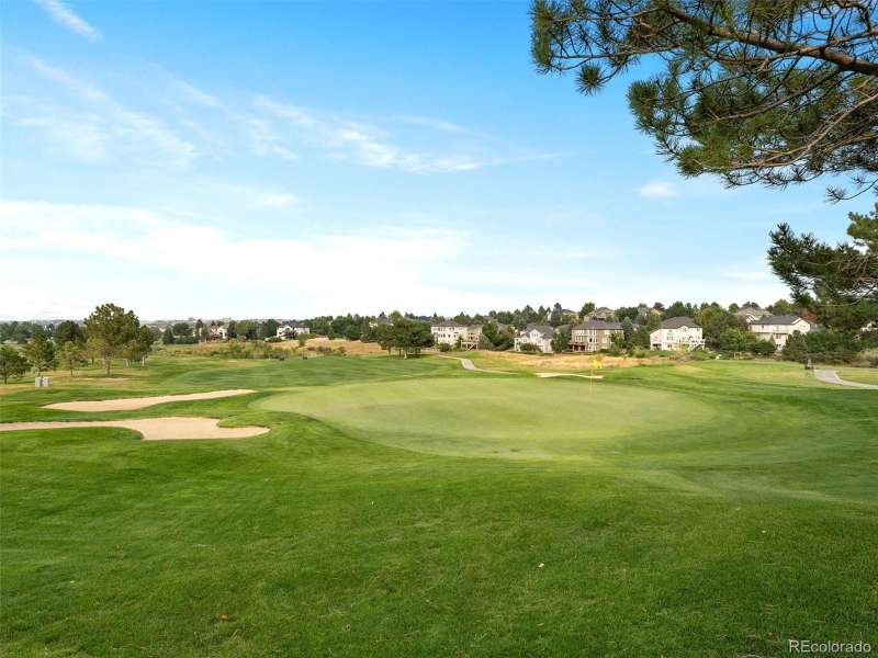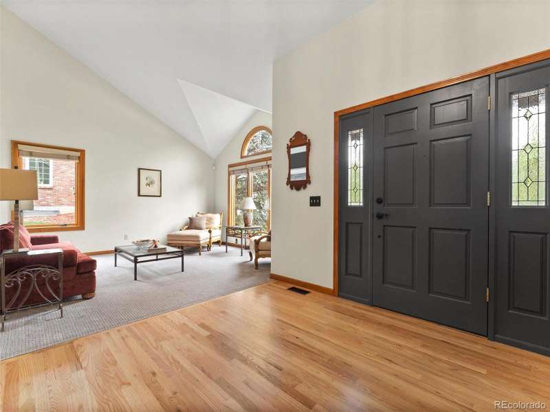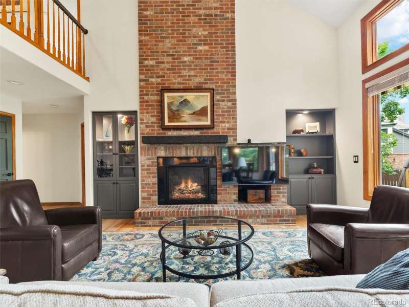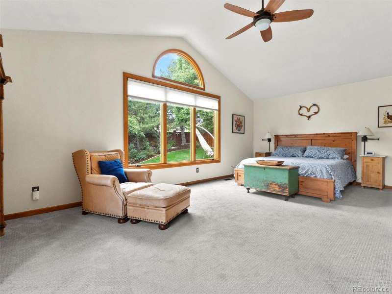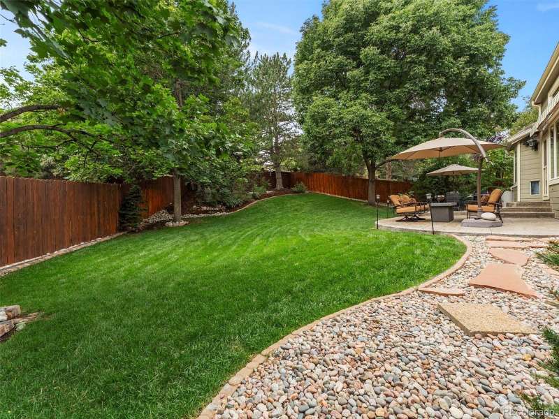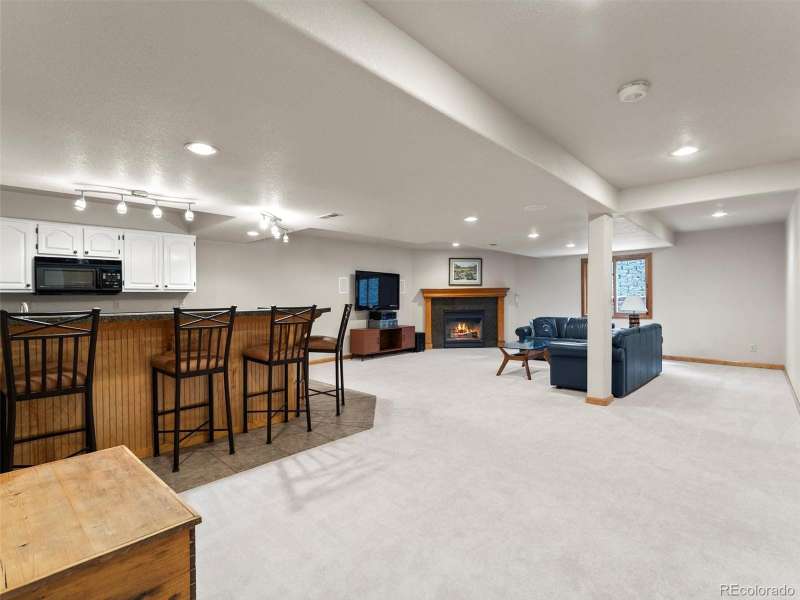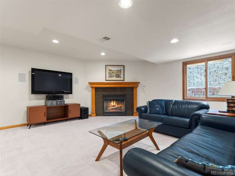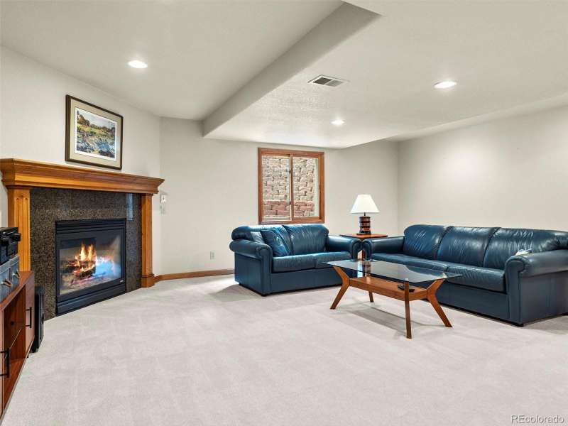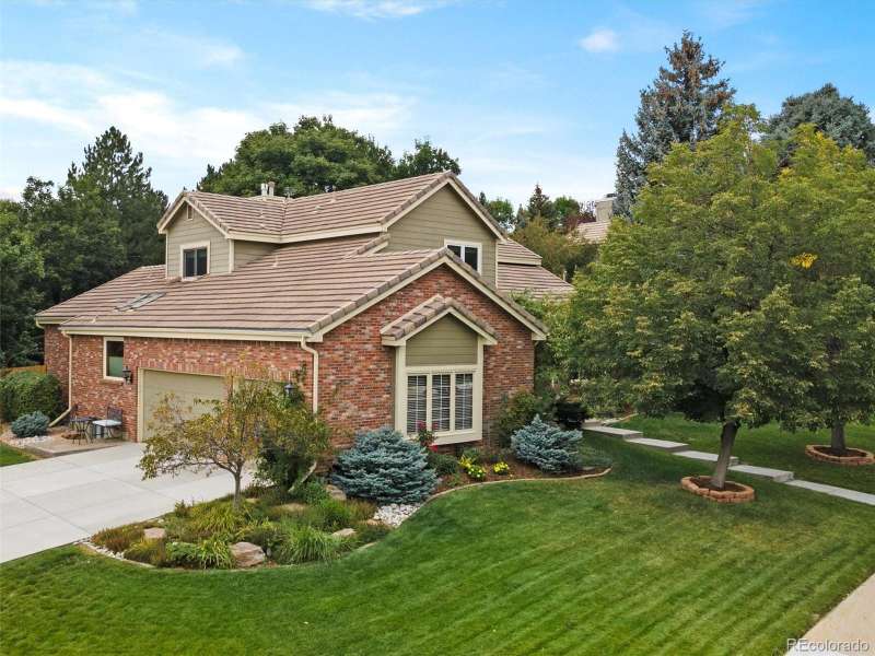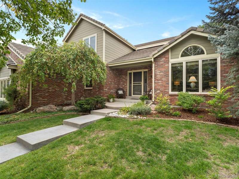 Welcome to this beautifully maintained home in the highly desirable Ridgeview neighborhood of Lone Tree, offering outstanding curb appeal with a side-load garage, mature trees, and professional landscaping. Inside, a voluminous open floor plan highlights a two-story foyer, vaulted living room, formal dining room, and hardwood floors that flow into the kitchen and family room. The two-story family room showcases dramatic picture windows that bring the outdoors in, built-in glass cabinetry and bookcase, and an impressive brick gas fireplace. The updated kitchen features custom cabinetry with glass doors, stainless steel appliances, granite counters, and a spacious eating area framed by oversized picture windows. The main-floor primary suite is exceptionally large with a vaulted ceiling, two walk-in closets, and a remodeled bath (2022) with heated tile floors, while the main level also includes a generous laundry room with ample cabinetry, closet space, and utility sink. Upstairs are three spacious bedrooms and an updated full bath. The bright garden-level basement offers abundant natural light with a rec room, fireplace, wet bar, fifth bedroom, newly updated bath, and a versatile bonus room perfect for exercise, play, or hobbies. Updated windows throughout, stamped concrete patio with electric awning, and a beautifully landscaped, private backyard complete this home. Thoughtful recent updates include new carpet, refinished wood floors, fresh interior and exterior paint, and a brand-new driveway. All within walking distance to Eagle Ridge Elementary, Cook Creek Pool, Lone Tree Golf & Tennis Center, Bluffs Regional Park, and miles of walking paths.