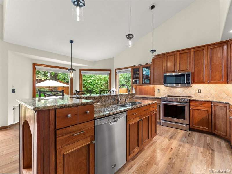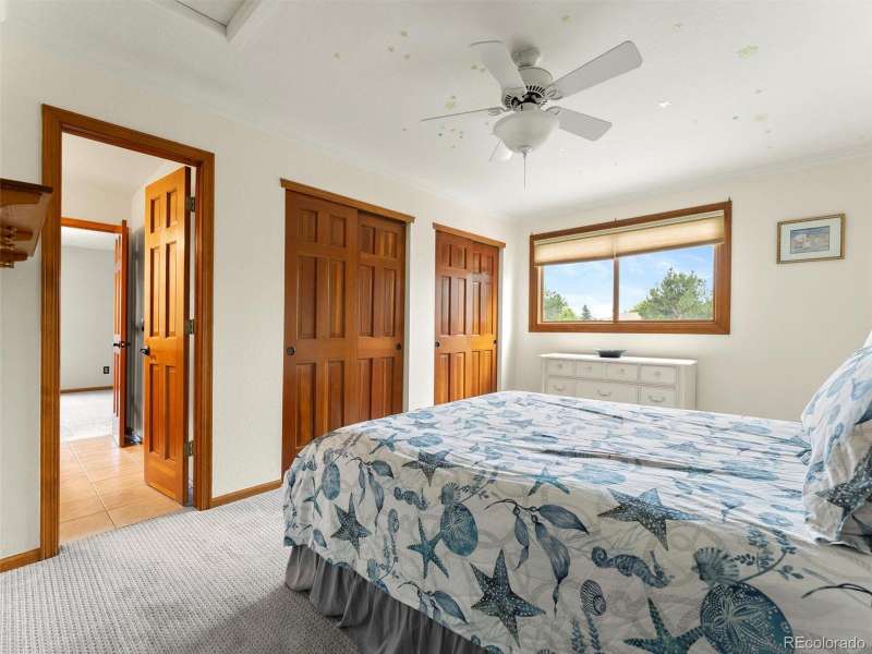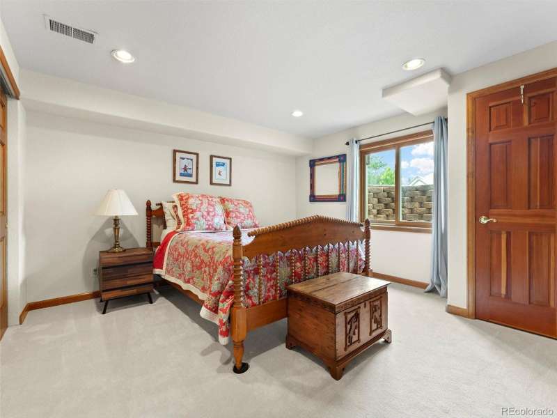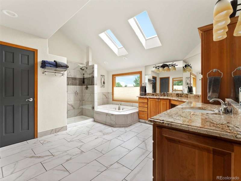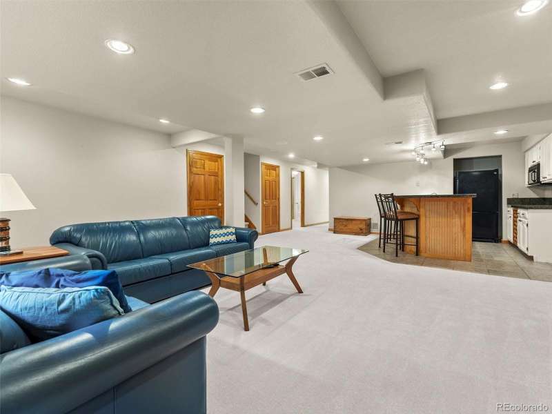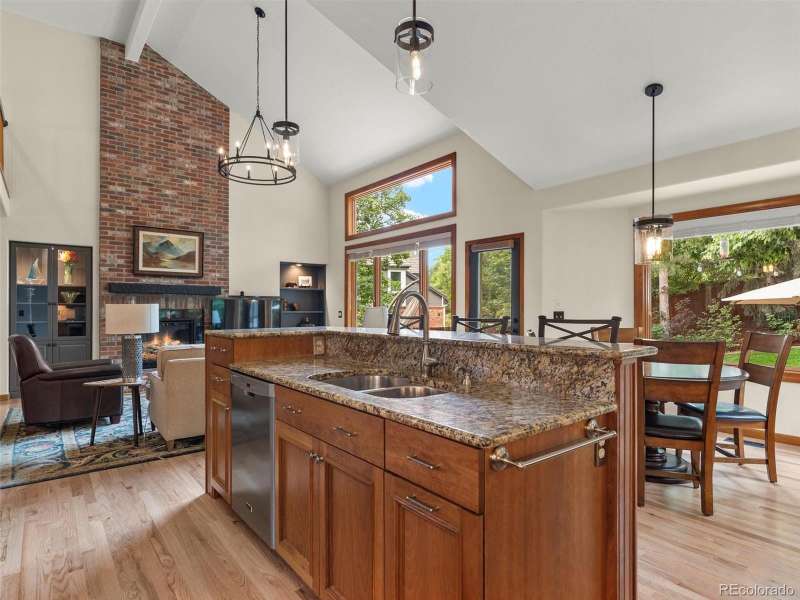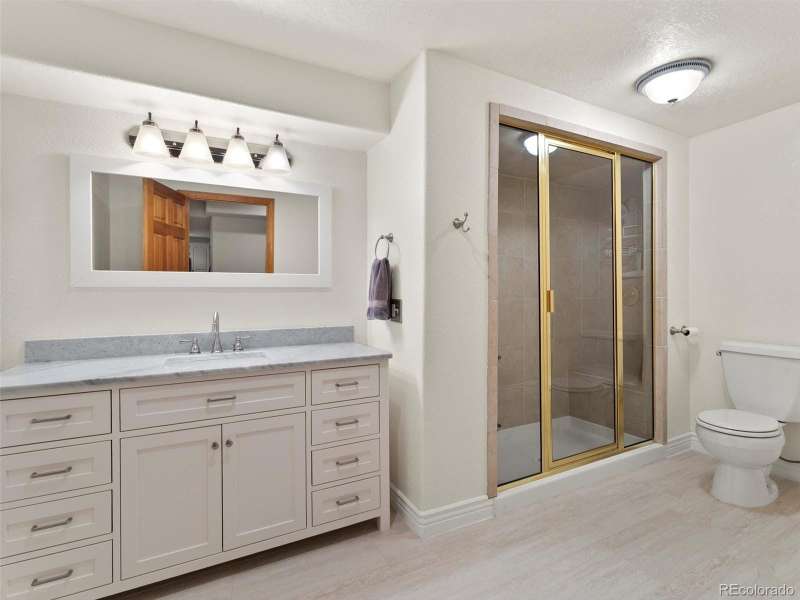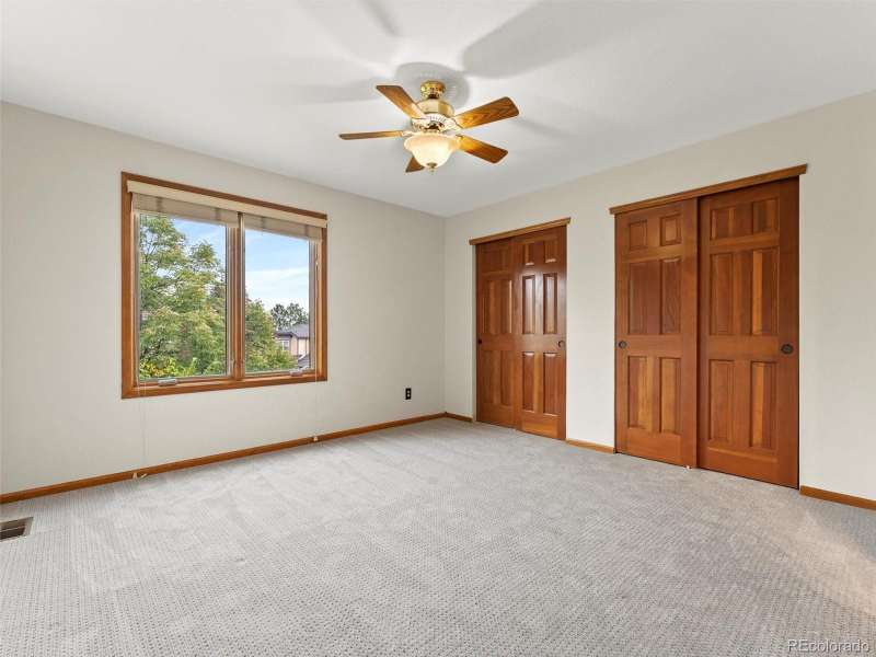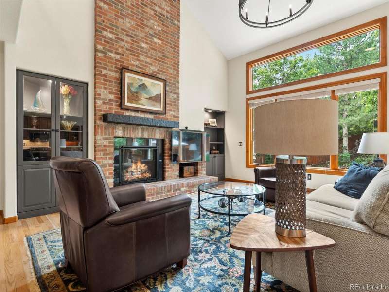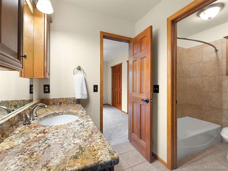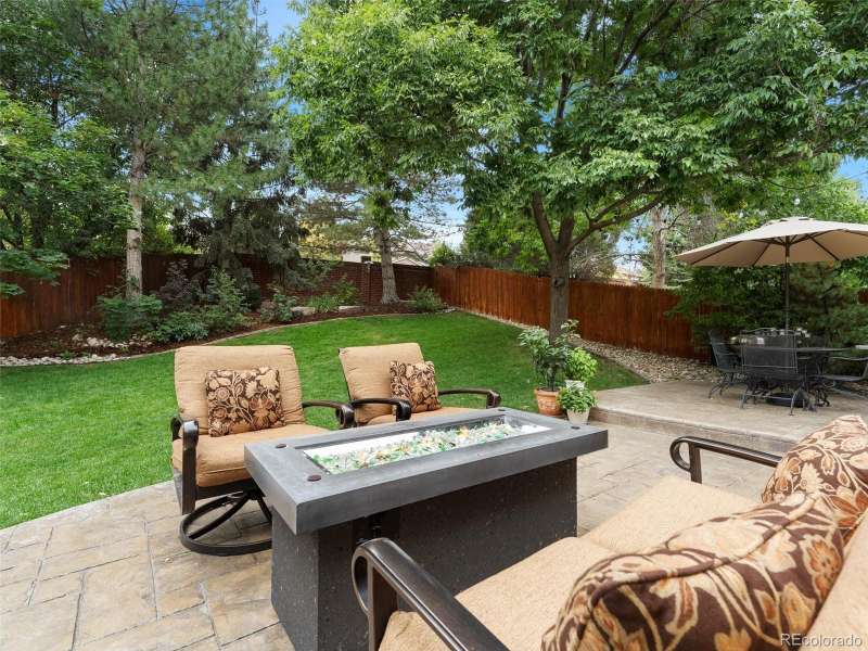 Welcome to this beautifully maintained home in the highly desirable Ridgeview neighborhood of Lone Tree, offering outstanding curb appeal with a side-load garage, mature trees, and professional landscaping. Inside, a voluminous open floor plan highlights a two-story foyer, vaulted living room, formal dining room, and hardwood floors that flow into the kitchen and family room. The two-story family room showcases dramatic picture windows that bring the outdoors in, built-in glass cabinetry and bookcase, and an impressive brick gas fireplace. The updated kitchen features custom cabinetry with glass doors, stainless steel appliances, granite counters, and a spacious eating area framed by oversized picture windows. The main-floor primary suite is exceptionally large with a vaulted ceiling, two walk-in closets, and a remodeled bath (2022) with heated tile floors, while the main level also includes a generous laundry room with ample cabinetry, closet space, and utility sink. Upstairs are three spacious bedrooms and an updated full bath. The bright garden-level basement offers abundant natural light with a rec room, fireplace, wet bar, fifth bedroom, newly updated bath, and a versatile bonus room perfect for exercise, play, or hobbies. Updated windows throughout, stamped concrete patio with electric awning, and a beautifully landscaped, private backyard complete this home. Thoughtful recent updates include new carpet, refinished wood floors, fresh interior and exterior paint, and a brand-new driveway. All within walking distance to Eagle Ridge Elementary, Cook Creek Pool, Lone Tree Golf & Tennis Center, Bluffs Regional Park, and miles of walking paths.