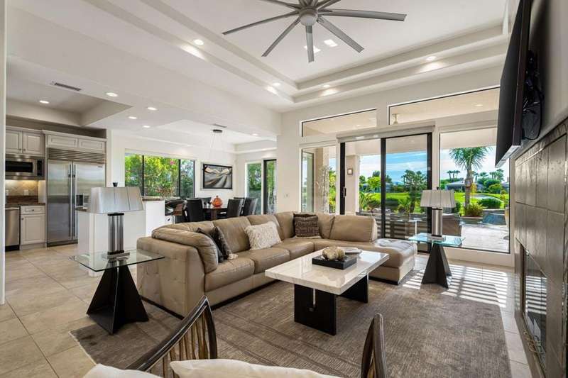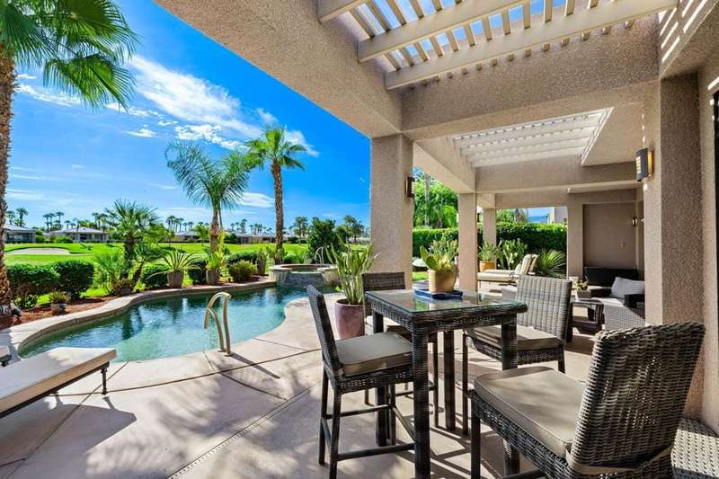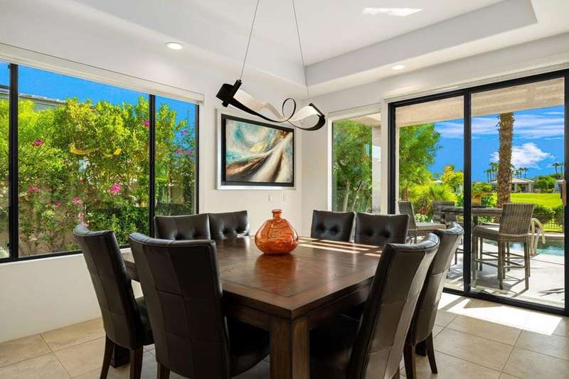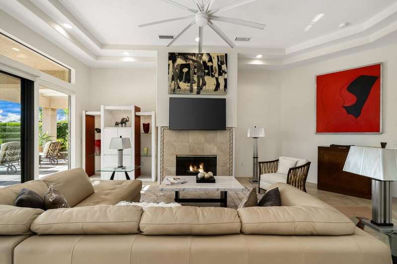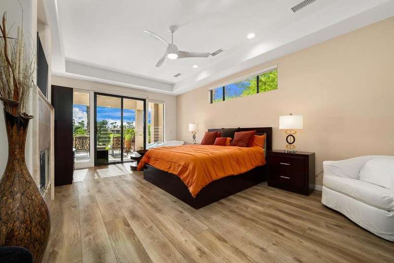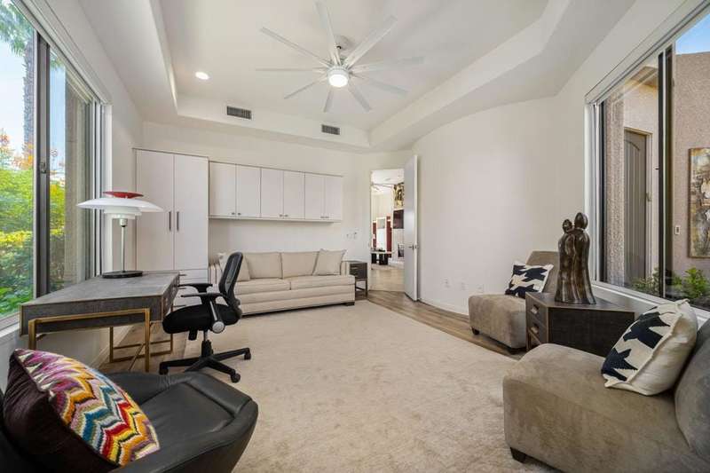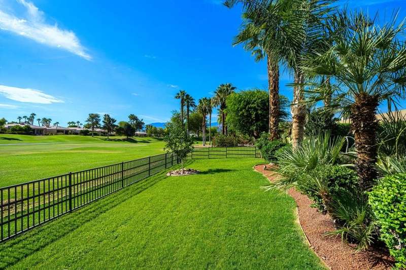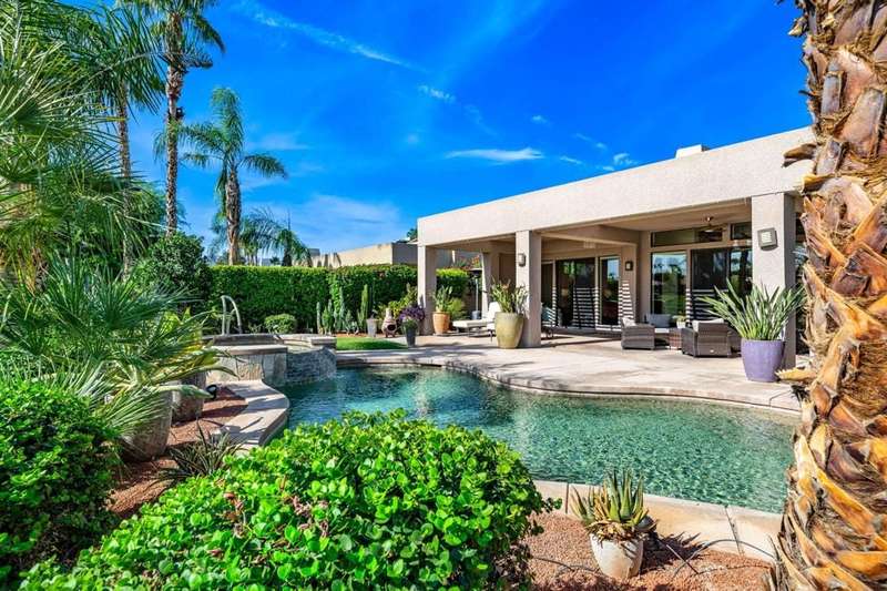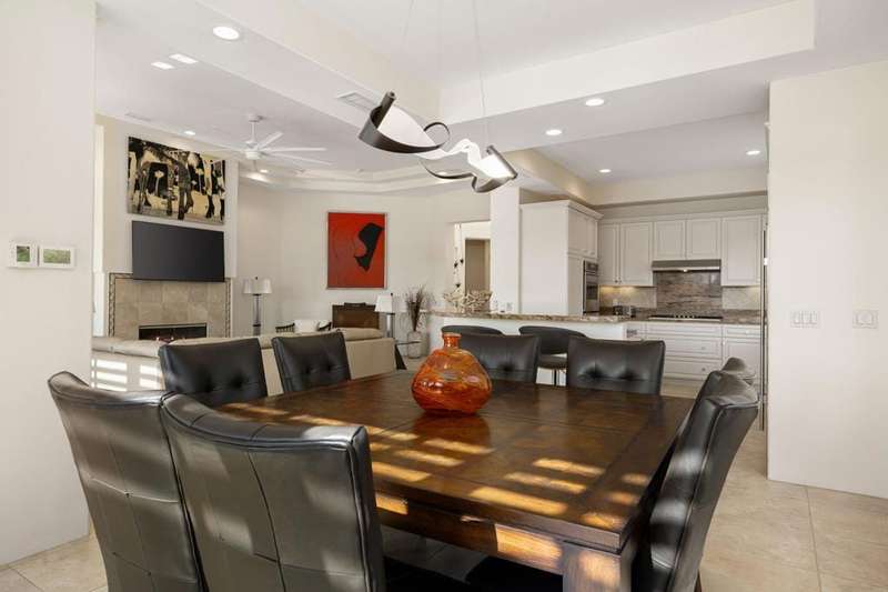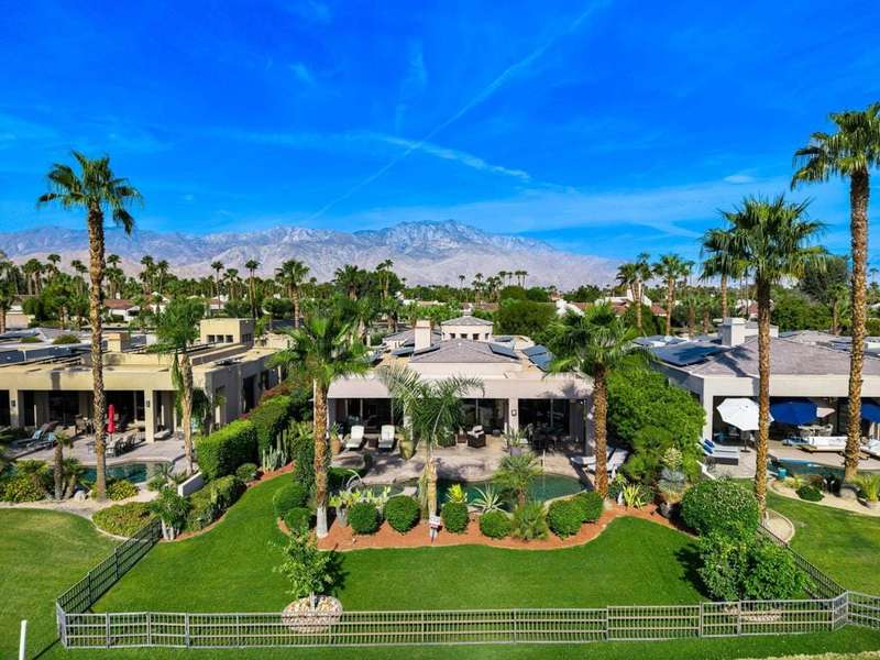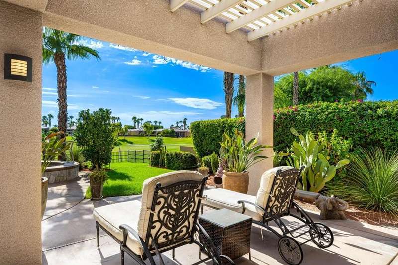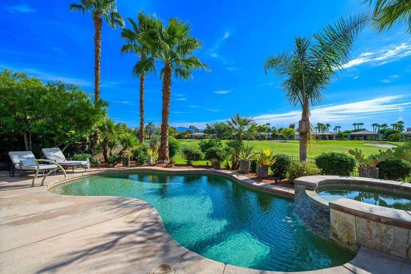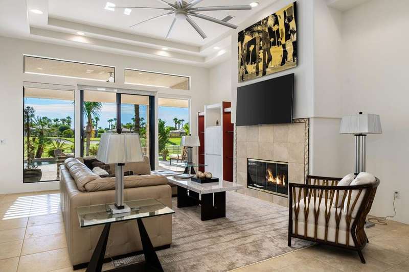 Updated Contemporary on Premium Lot with Mountain and Fairway Views in Mission Hills. Enter through a gated courtyard with fountain and custom landscaping. Entry Hall Tower makes for dramatic entrance to an Open Great Room with Fireplace, Dining and Walls of Glass opening to the Pool Terrace making for a light and bright home. Gourmet Kitchen with Updated White Cabinetry, Stainless Appliances including Subzero Refrigerator and Wolf Cooktop, and social island open to Great Room. Tasteful Powder Room is perfect for entertaining. Primary Suite features a fireplace, retreat area, sliders to the pool terrac, a marble filled spa bath and a large walk-in closet with custom cabinetry. A guest bedroom and an office/bedroom in the house each with ensuite bath and a Casita with refreshment center provide great space for family and friends. Outside is an expansive and private backyard with pool/spa and outdoor living room and dining. Solar equipped. Contemporary Style with expansive outdoor living and custom landscaping like this can be yours and some furnishings are negotiable. Come home to your Desert Retreat!