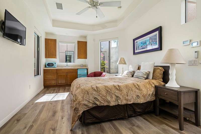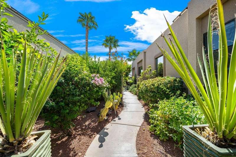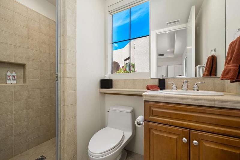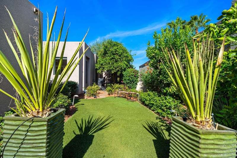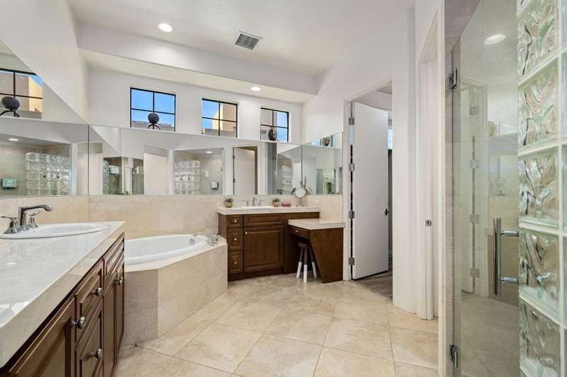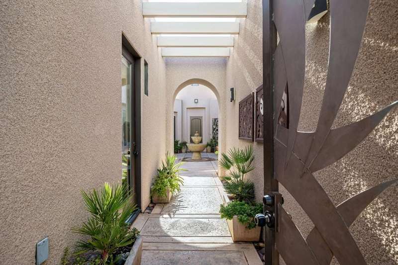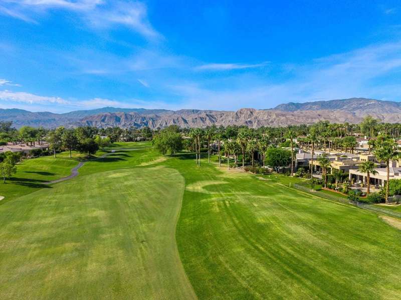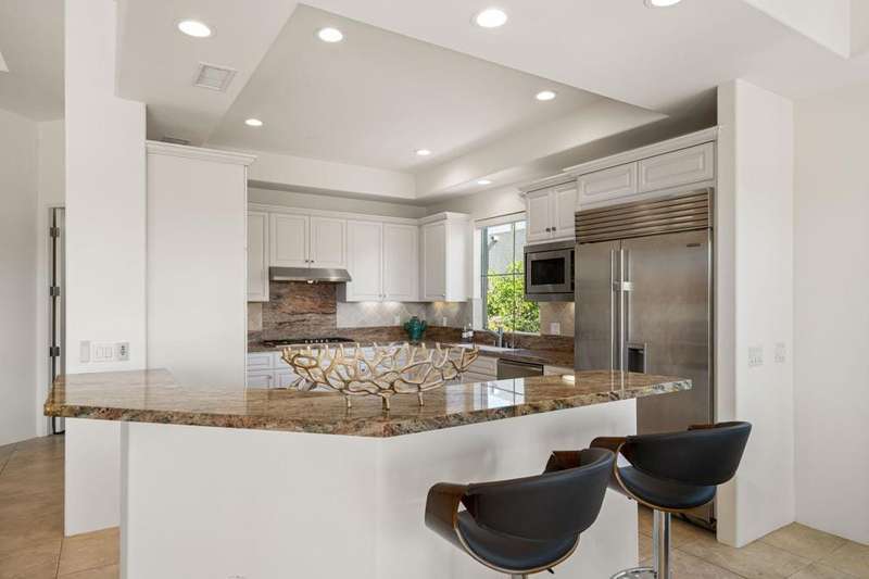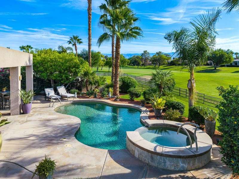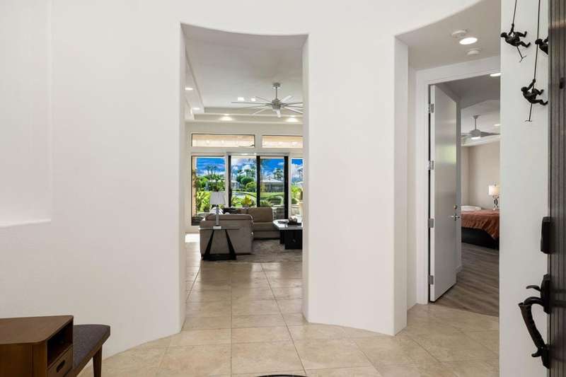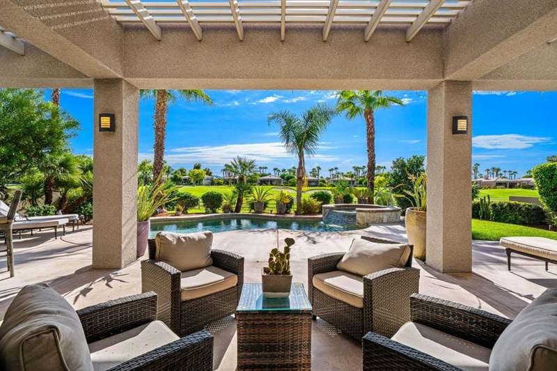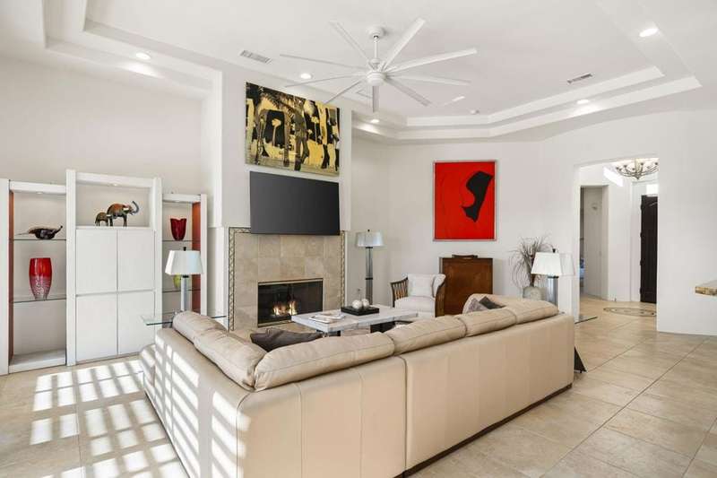 Updated Contemporary on Premium Lot with Mountain and Fairway Views in Mission Hills. Enter through a gated courtyard with fountain and custom landscaping. Entry Hall Tower makes for dramatic entrance to an Open Great Room with Fireplace, Dining and Walls of Glass opening to the Pool Terrace making for a light and bright home. Gourmet Kitchen with Updated White Cabinetry, Stainless Appliances including Subzero Refrigerator and Wolf Cooktop, and social island open to Great Room. Tasteful Powder Room is perfect for entertaining. Primary Suite features a fireplace, retreat area, sliders to the pool terrac, a marble filled spa bath and a large walk-in closet with custom cabinetry. A guest bedroom and an office/bedroom in the house each with ensuite bath and a Casita with refreshment center provide great space for family and friends. Outside is an expansive and private backyard with pool/spa and outdoor living room and dining. Solar equipped. Contemporary Style with expansive outdoor living and custom landscaping like this can be yours and some furnishings are negotiable. Come home to your Desert Retreat!