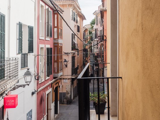 This spectacular apartment of 107 m² enjoys a privileged location in one of the most charming streets of Palma's Old Town. Carrer de Can Sales is located in an iconic and historic area, known for its contemporary art galleries and vibrant cultural atmosphere. Just steps away from El Corte Inglés on Jaime III, the apartment is surrounded by restaurants, bars, shops, supermarkets, and playgrounds — all in a unique setting filled with art, history, and the soul of Palma.This beautifully presented apartment features two en-suite bedrooms, each with its own private bathroom — one with a shower and the other with a bathtub — and two balconies overlooking a street full of character, art, and creativity. Inside, you’ll find spacious built-in wardrobes in the hallway providing ample storage, along with air conditioning in all rooms and gas heating throughout the building. The modern, open-concept kitchen is both functional and bright, and the property is in impeccable condition — ready to m