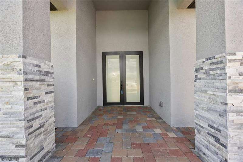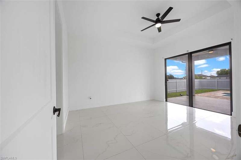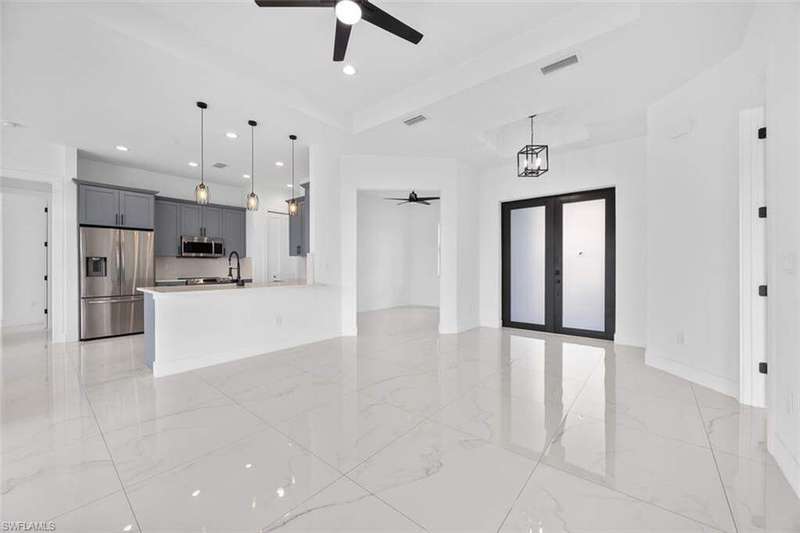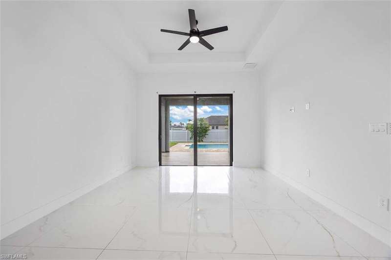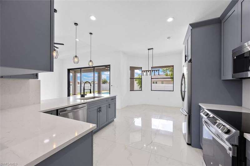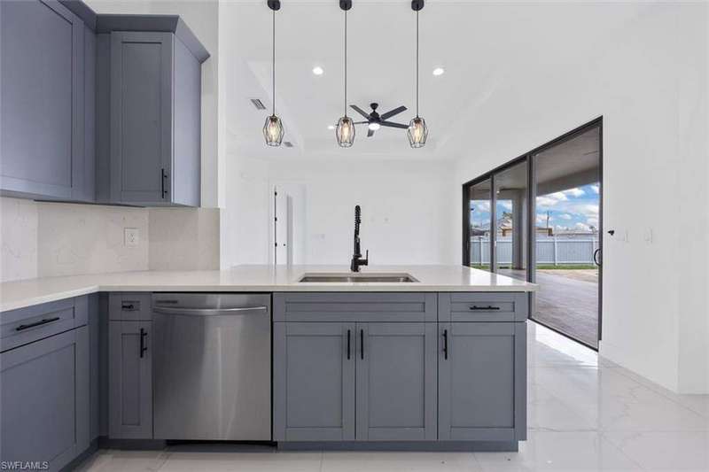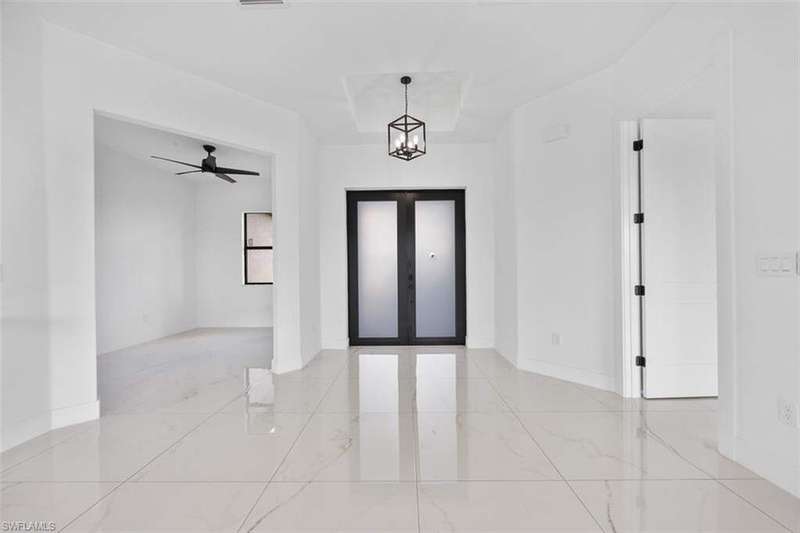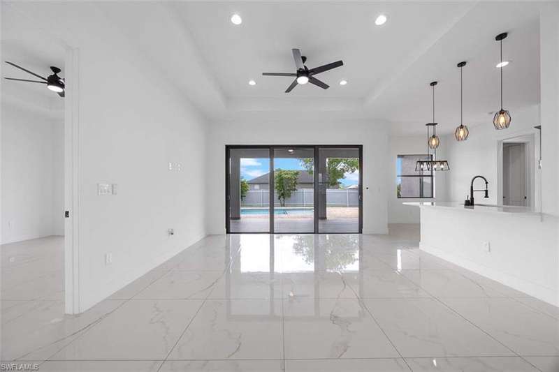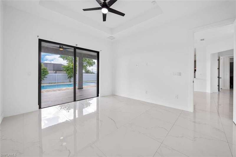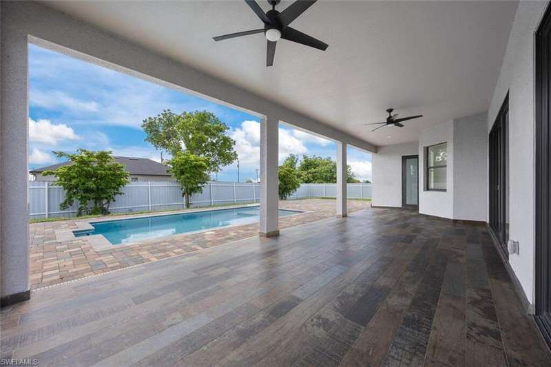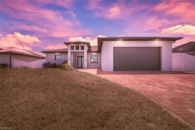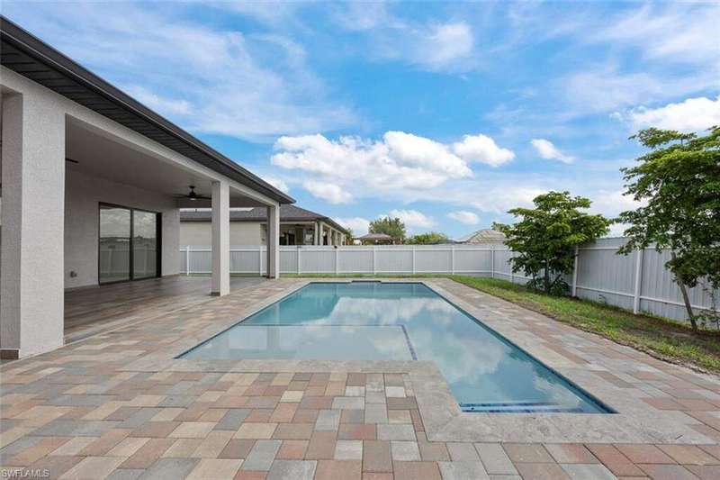 Experience the best of Florida living in this custom-built pool home located in Cape Coral'. This beautifully designed residence offers 3 spacious bedrooms plus a versatile den, providing the perfect space for a home office, guest room, or hobby area. Built with energy efficiency and style in mind, every detail has been carefully selected to blend luxury with comfort. From the moment you arrive, the home's curb appeal shines with its paver driveway, fenced yard, and hurricane-impact windows and doors. Inside, you'll find high-end finishes throughout, including 42-inch all-wood, soft-close cabinetry, elegant quartz countertops and backsplash, and smart stainless steel appliances with washer and dryer included. Gleaming 32"x32" porcelain tile runs throughout the home, enhancing the open and airy feel. The gourmet kitchen is a true focal point, featuring pendant lighting, ample counter space, and a spacious pantry. The owner's suite offers a private retreat with a tray ceiling, sliding glass doors to the pool area, a frameless glass shower with rainfall shower head, a soaking tub, and a walk-in closet. Additional bedrooms are generously sized, and the home's versatile layout is ideal for both relaxation and entertaining. Step outside to enjoy your own Florida oasis. The 14'x30' custom pool is perfect for year-round enjoyment, while the expansive covered lanai and fully fenced backyard create the ideal setting for family gatherings or quiet evenings. An oversized two-car garage with epoxy flooring provides plenty of parking and storage space. This home is perfectly situated for convenience. You'll be within walking distance to Publix, Walmart, restaurants, and medical care, and just minutes from Cape Coral's shopping districts and local parks. The property is connected to city water and irrigation with assessments paid, and it's located in a Zone X, meaning no flood insurance is required. With its luxury features, low-maintenance design, and prime location in one of Southwest Florida's fastest-growing communities, this home is an incredible opportunity for buyers seeking quality, comfort, and style.