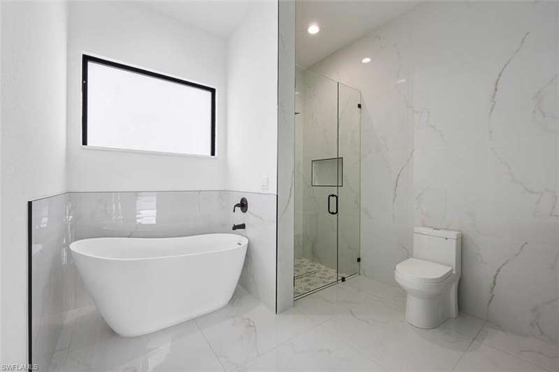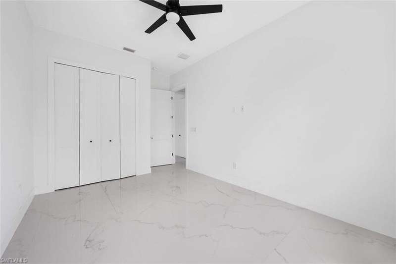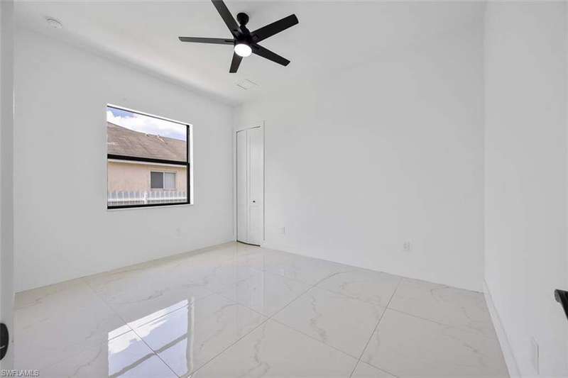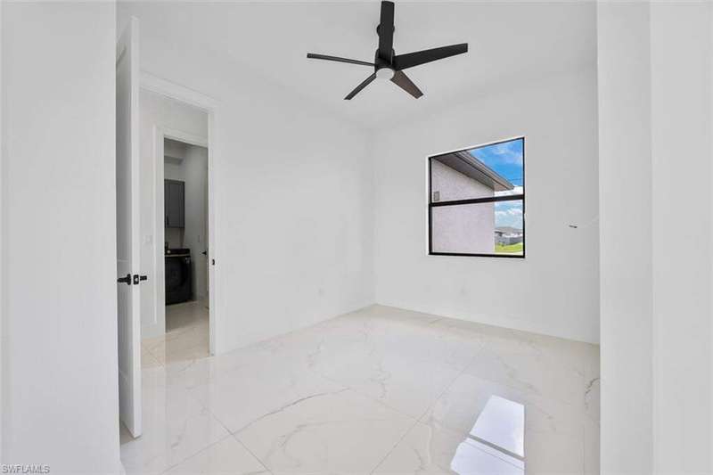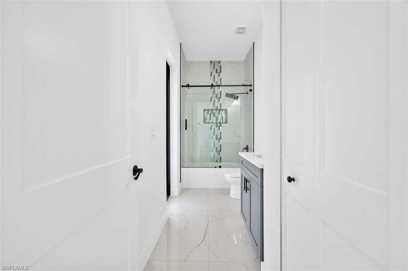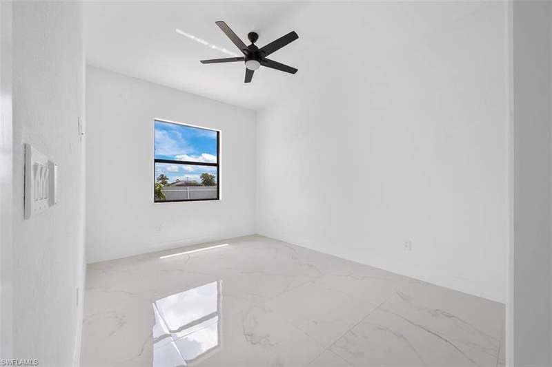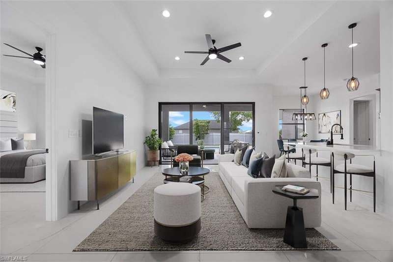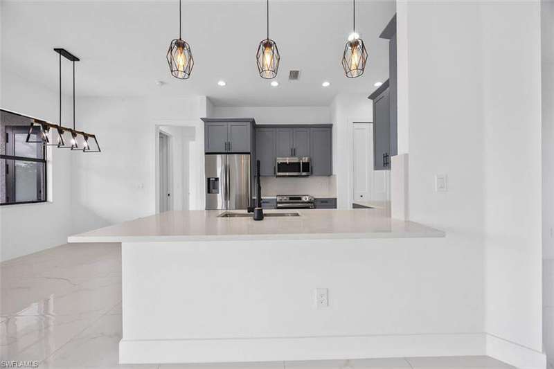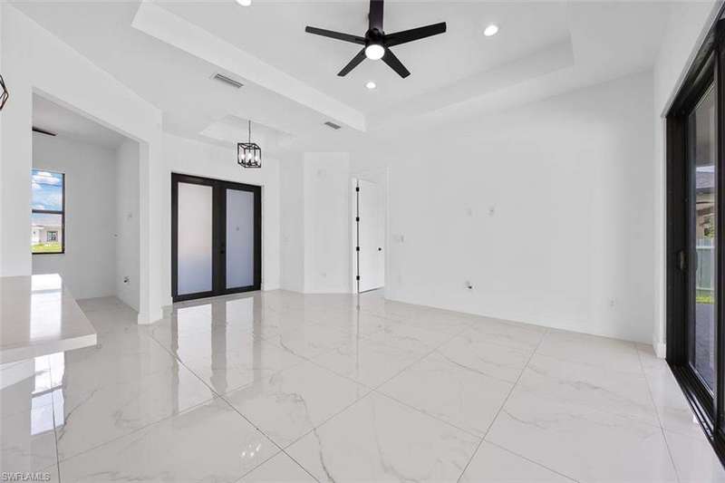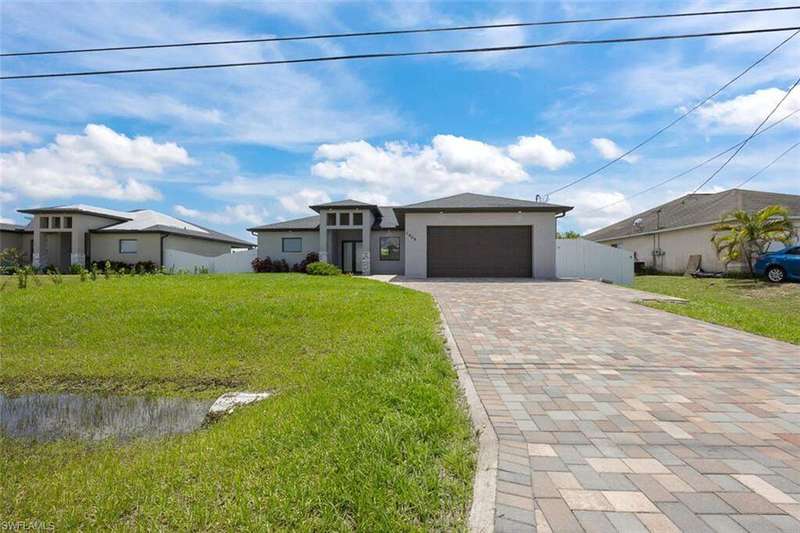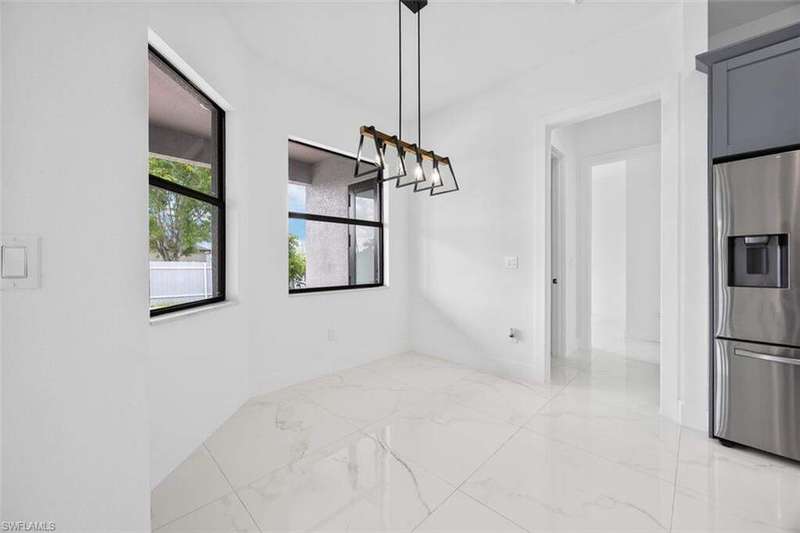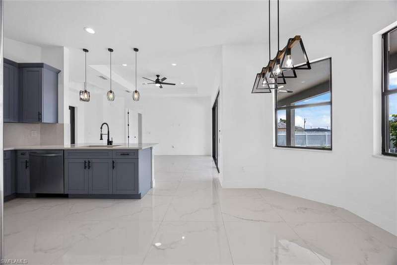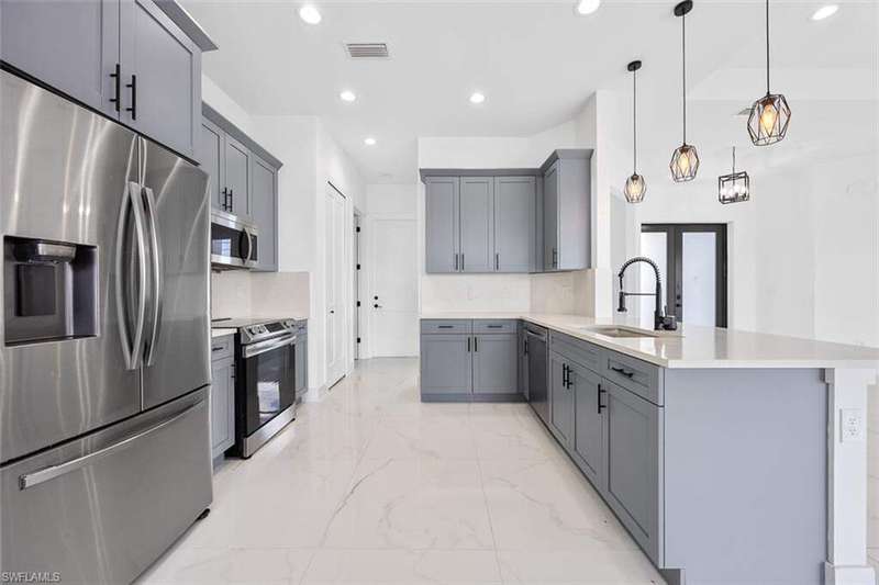 Experience the best of Florida living in this custom-built pool home located in Cape Coral'. This beautifully designed residence offers 3 spacious bedrooms plus a versatile den, providing the perfect space for a home office, guest room, or hobby area. Built with energy efficiency and style in mind, every detail has been carefully selected to blend luxury with comfort. From the moment you arrive, the home's curb appeal shines with its paver driveway, fenced yard, and hurricane-impact windows and doors. Inside, you'll find high-end finishes throughout, including 42-inch all-wood, soft-close cabinetry, elegant quartz countertops and backsplash, and smart stainless steel appliances with washer and dryer included. Gleaming 32"x32" porcelain tile runs throughout the home, enhancing the open and airy feel. The gourmet kitchen is a true focal point, featuring pendant lighting, ample counter space, and a spacious pantry. The owner's suite offers a private retreat with a tray ceiling, sliding glass doors to the pool area, a frameless glass shower with rainfall shower head, a soaking tub, and a walk-in closet. Additional bedrooms are generously sized, and the home's versatile layout is ideal for both relaxation and entertaining. Step outside to enjoy your own Florida oasis. The 14'x30' custom pool is perfect for year-round enjoyment, while the expansive covered lanai and fully fenced backyard create the ideal setting for family gatherings or quiet evenings. An oversized two-car garage with epoxy flooring provides plenty of parking and storage space. This home is perfectly situated for convenience. You'll be within walking distance to Publix, Walmart, restaurants, and medical care, and just minutes from Cape Coral's shopping districts and local parks. The property is connected to city water and irrigation with assessments paid, and it's located in a Zone X, meaning no flood insurance is required. With its luxury features, low-maintenance design, and prime location in one of Southwest Florida's fastest-growing communities, this home is an incredible opportunity for buyers seeking quality, comfort, and style.