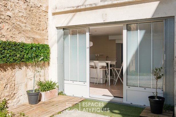 The volume could make it a perfect location for a boutique or an artistic venue. The living space has direct and independent access from a courtyard. The entrance opens onto a vast open space of over 85 sqm. The fully equipped kitchen, fitted with a central island, includes a dining area. Skylights and a large industrial-style French window bring natural light to the living room and lounge.