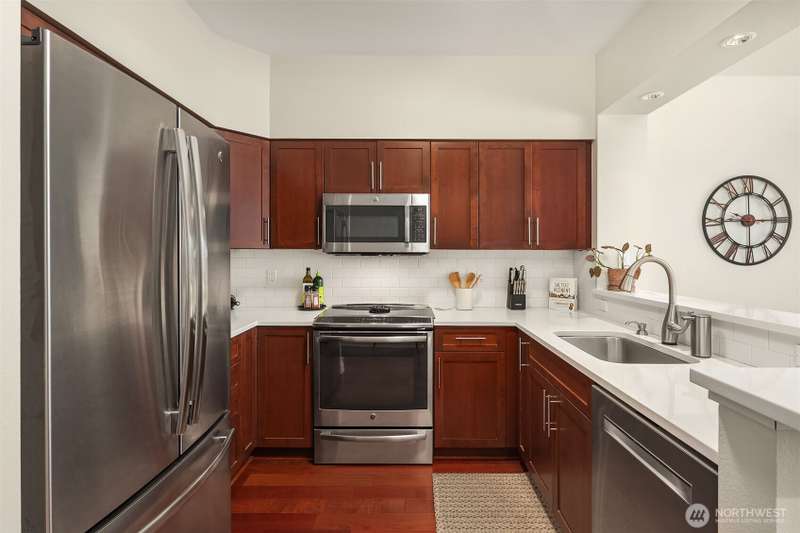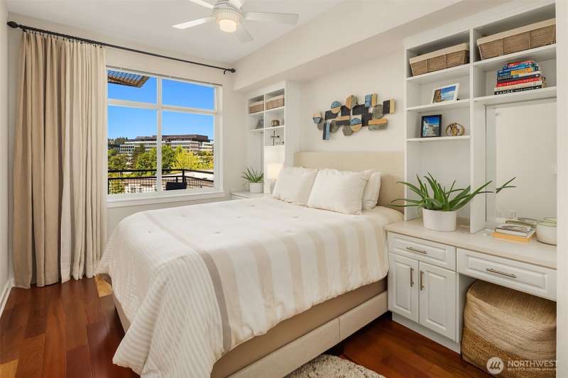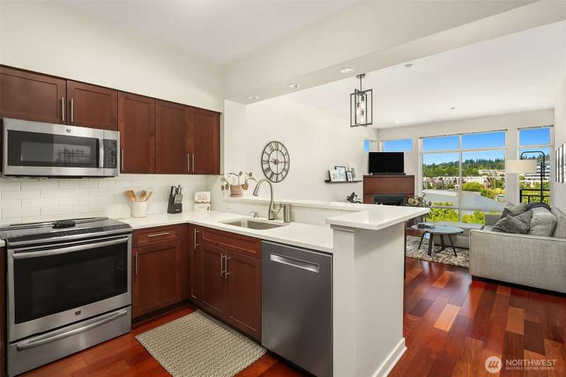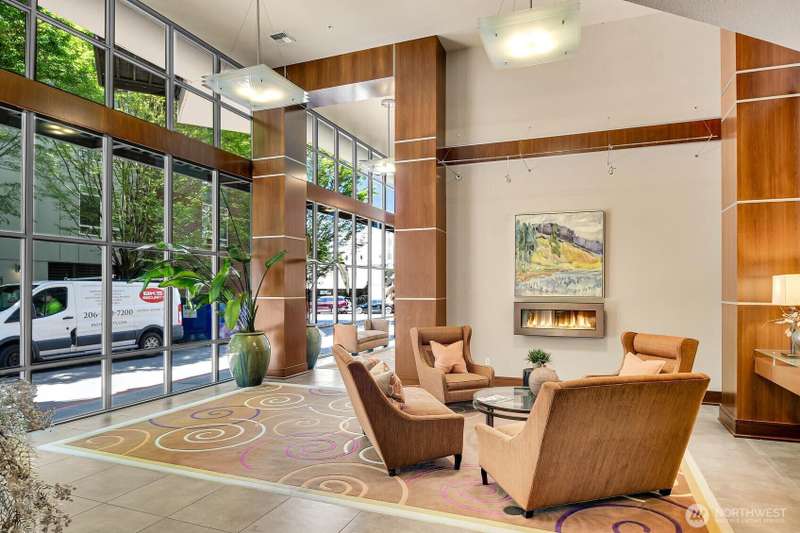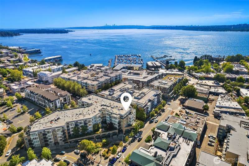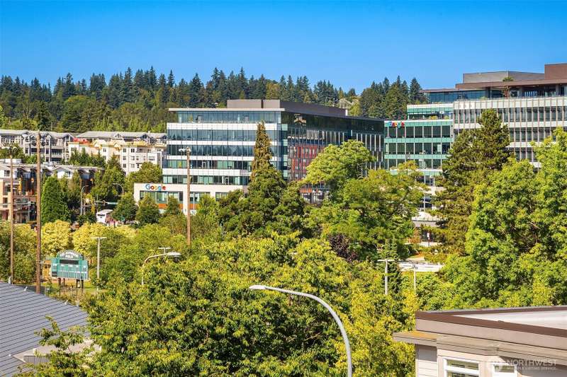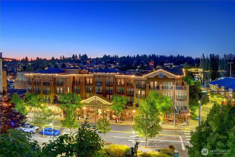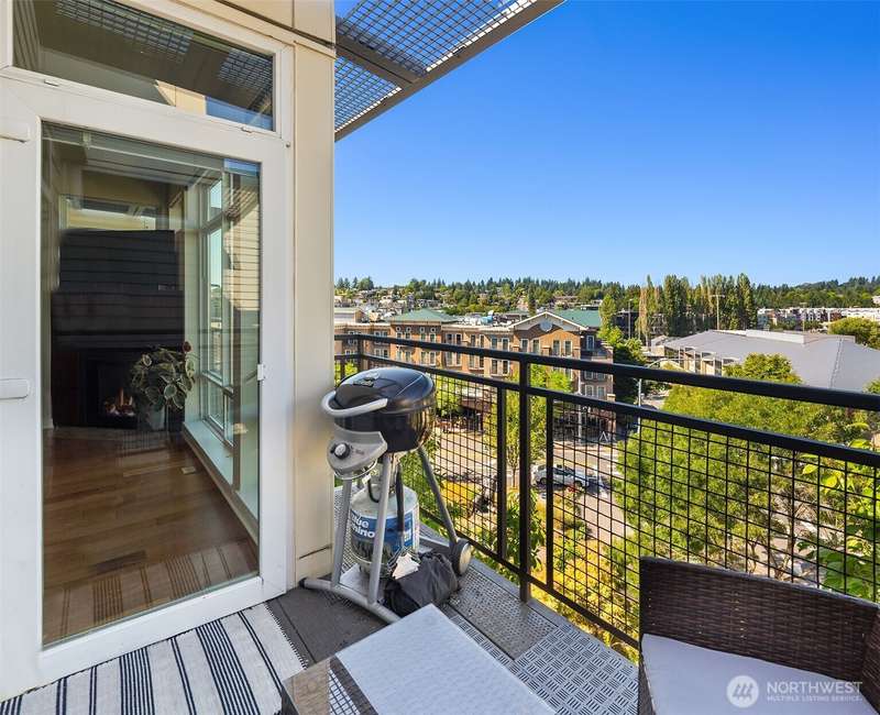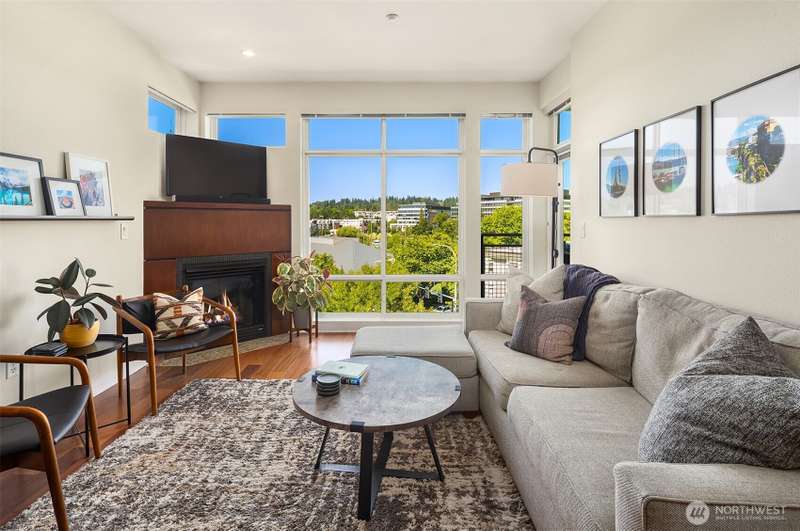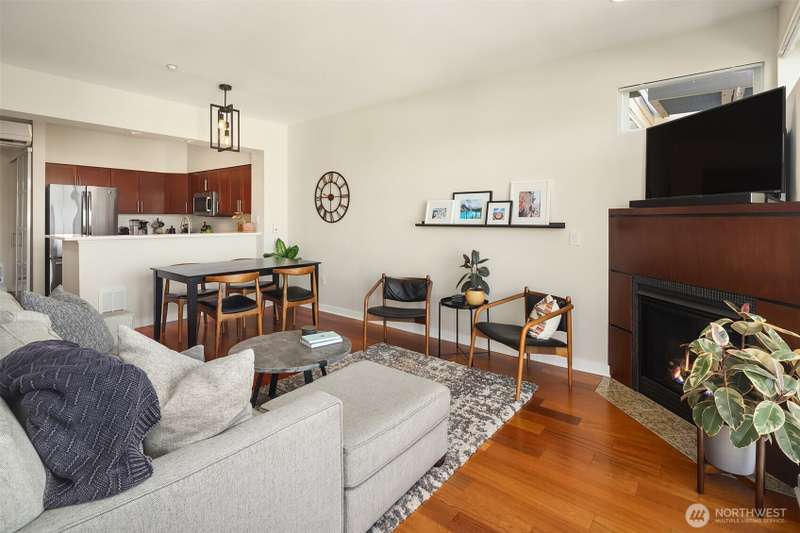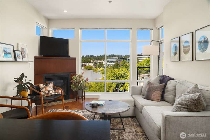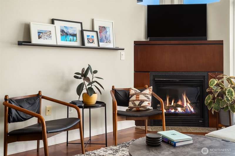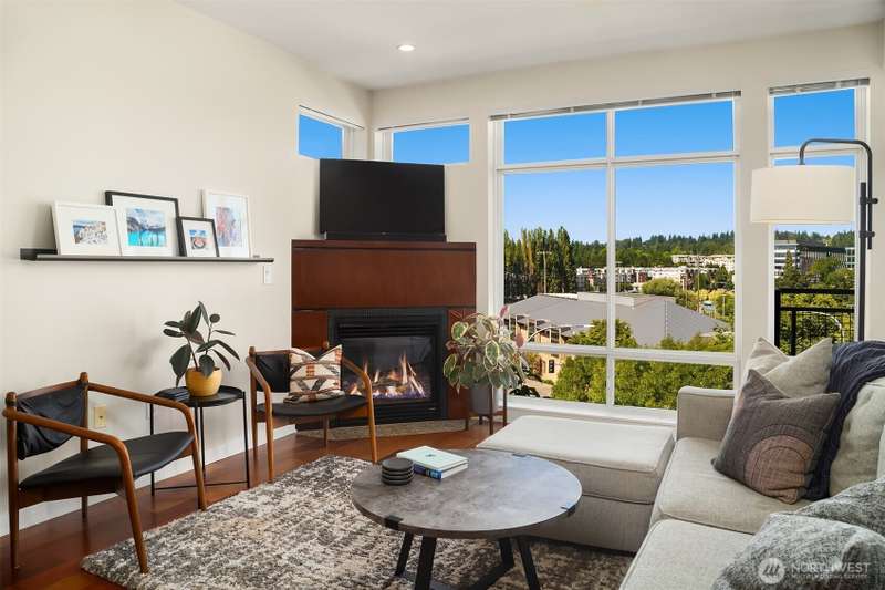 Penthouse living in coveted Kirkland Central—just a 5-min stroll to the waterfront. This light-filled top-floor 1-bed + den unit offers territorial views through floor-to-ceiling windows. Brazilian hardwoods throughout. Open-concept layout features chef’s kitchen w/ shaker-style cherry cabs, quartz counters, SS appl & under-cabinet lighting. Corner gas fireplace adds ambiance. Spacious bed includes custom built-ins maximizing storage & WIC. Den w/ sliding privacy door makes ideal office/flex space. In-unit laundry w/ storage shelving. Mini-split heat pump for heating & A/C. Private deck perfect for relaxing or entertaining. 2 garage parking spaces & huge storage unit. Unbeatable walkable location near dining, shops & lakefront.