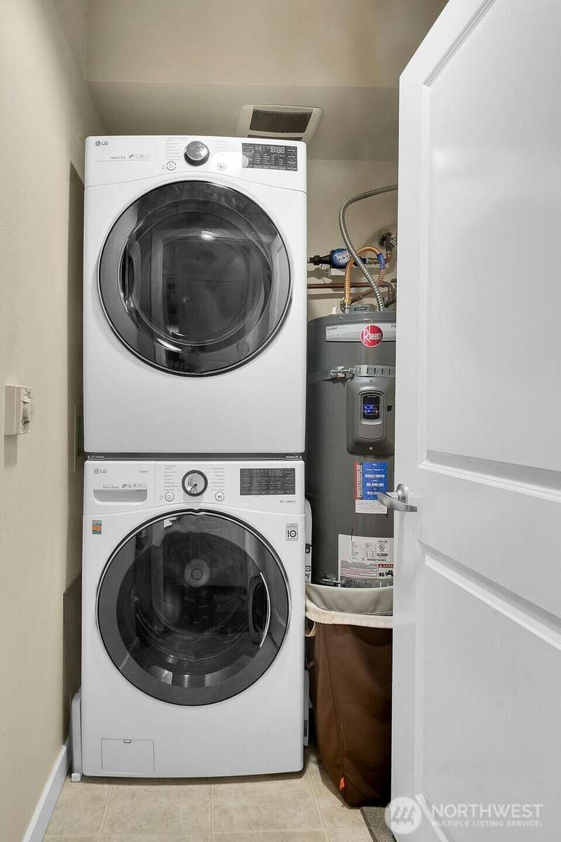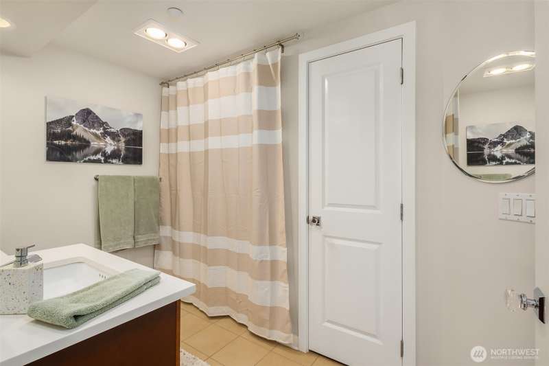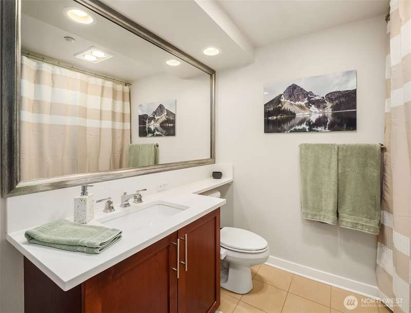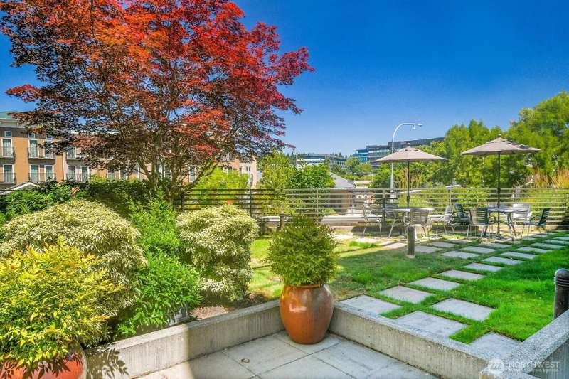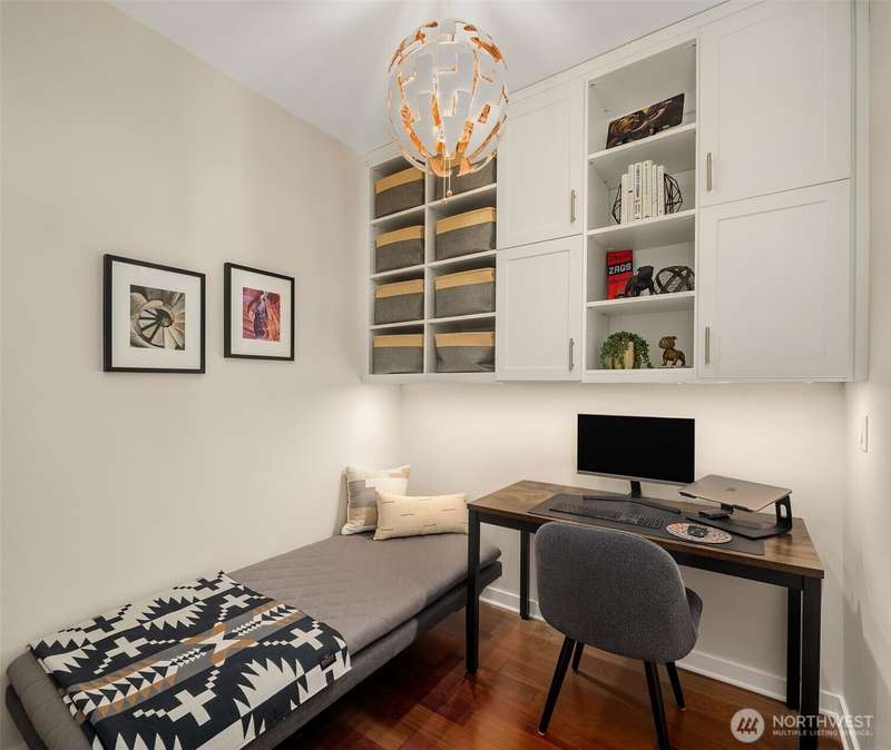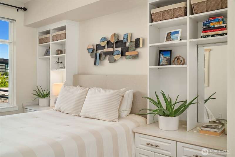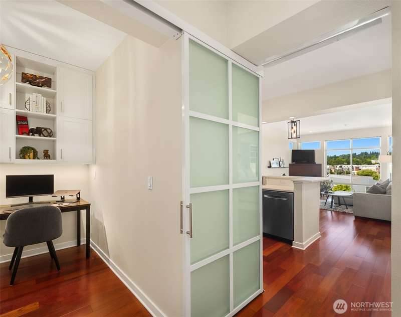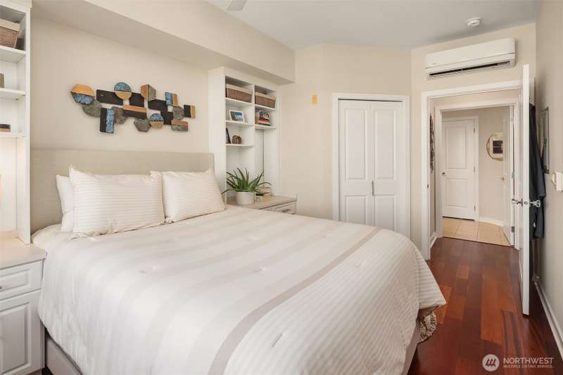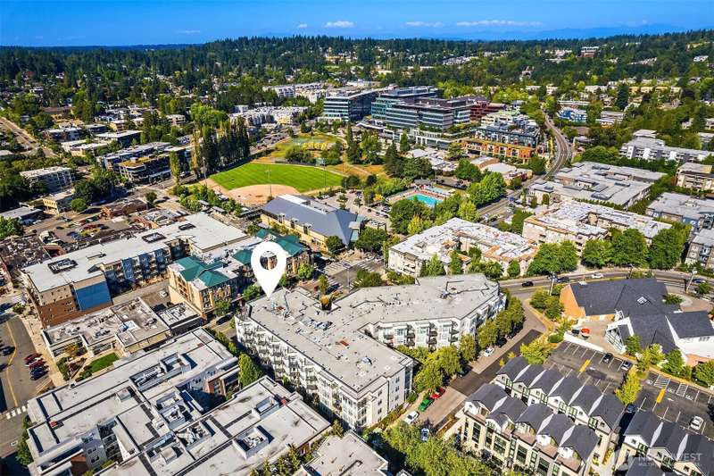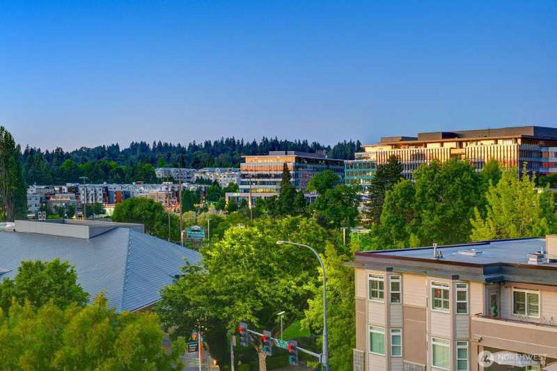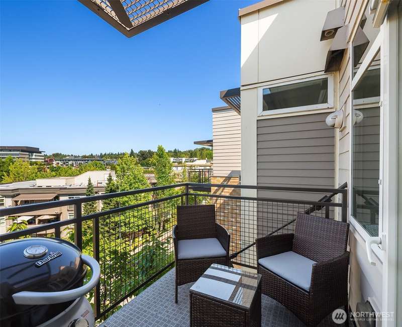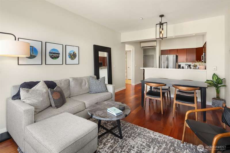 Penthouse living in coveted Kirkland Central—just a 5-min stroll to the waterfront. This light-filled top-floor 1-bed + den unit offers territorial views through floor-to-ceiling windows. Brazilian hardwoods throughout. Open-concept layout features chef’s kitchen w/ shaker-style cherry cabs, quartz counters, SS appl & under-cabinet lighting. Corner gas fireplace adds ambiance. Spacious bed includes custom built-ins maximizing storage & WIC. Den w/ sliding privacy door makes ideal office/flex space. In-unit laundry w/ storage shelving. Mini-split heat pump for heating & A/C. Private deck perfect for relaxing or entertaining. 2 garage parking spaces & huge storage unit. Unbeatable walkable location near dining, shops & lakefront.