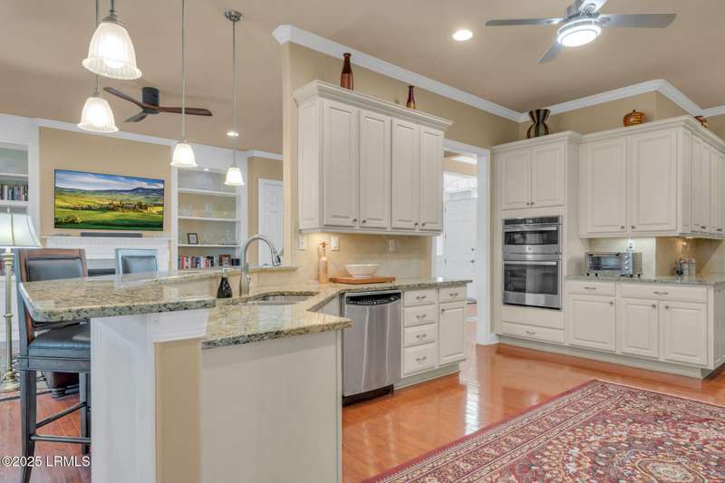 This Riverwalk floorplan shows like a model and is move in ready. 3 bedrooms/3.5 bathrooms loaded with extras: kitchen with granite counters, SS appliances, pull-outs, over/under counter lighting, tile backsplash, pendant lighting over bar seating, and built in oven/microwave. Primary suite has a large bedroom, bath with separate shower and extra large walk in closet. Great separation of bedrooms. Both guest rooms are ensuite. Wood flooring in all main living areas, carpet in bedrooms, plantation shutters throughout. Crown molding in all living areas plus primary bedroom. Oversized garage with utility sink allows for 2 cars + a golf cart. Pulldown stairs in garage with partially floored storage above. Premium lot with extra spacious back yard overlooking the lagoon. Riverton Pointe is a s