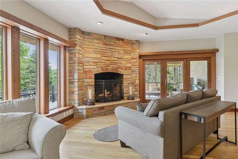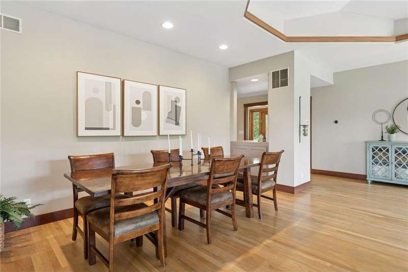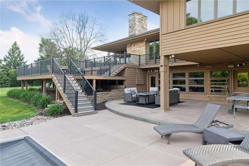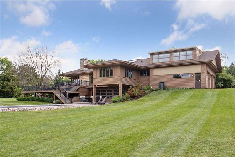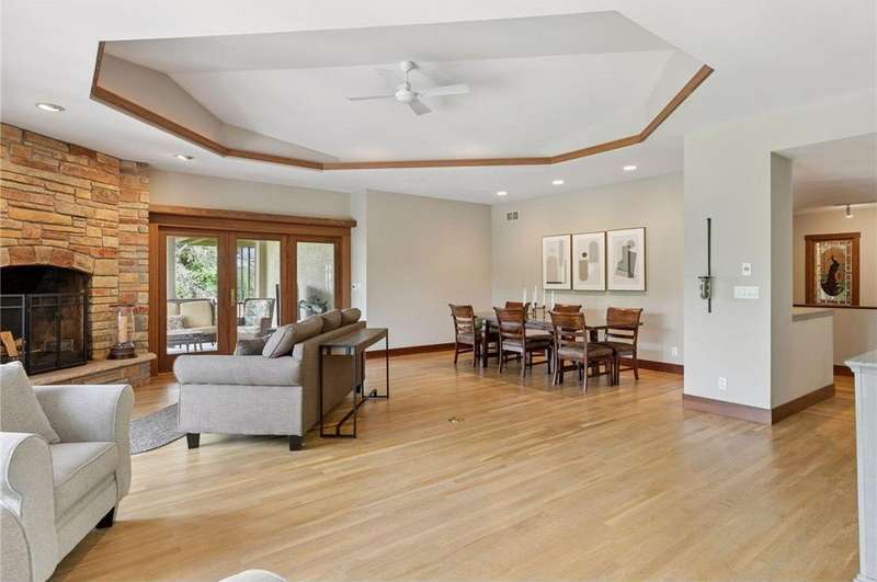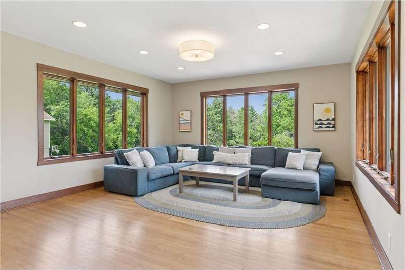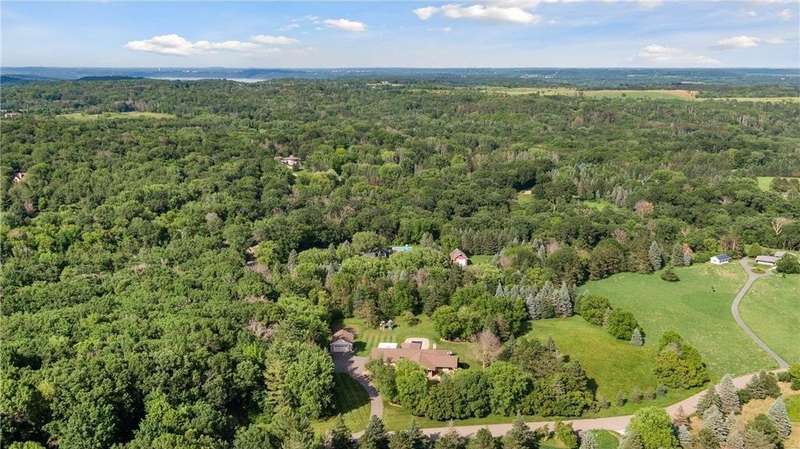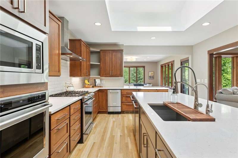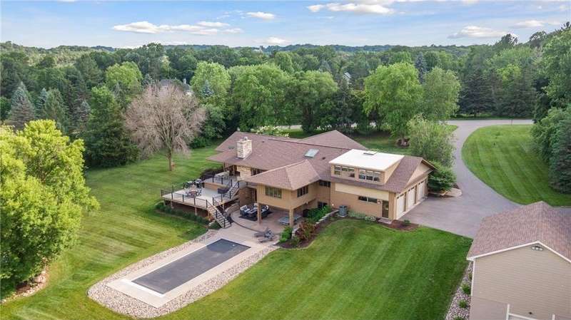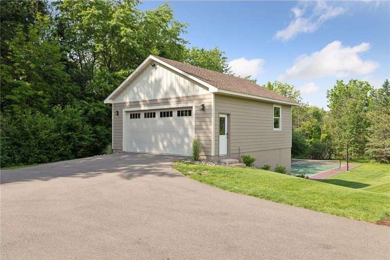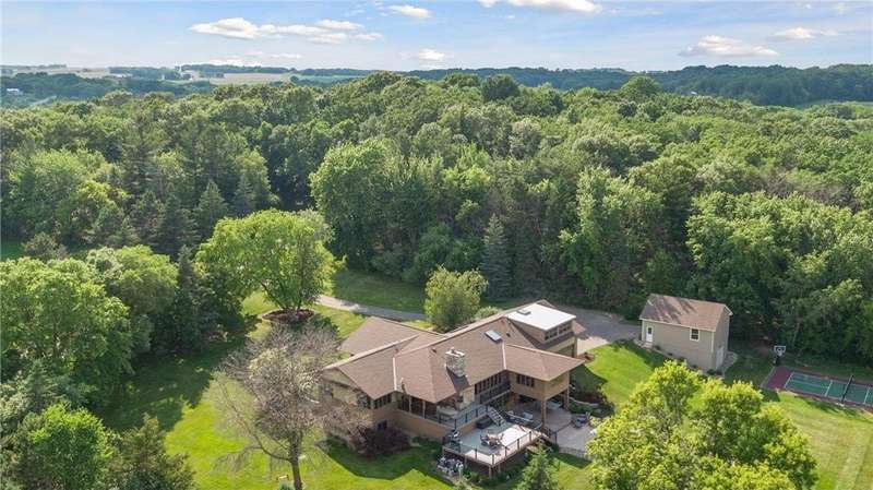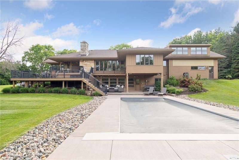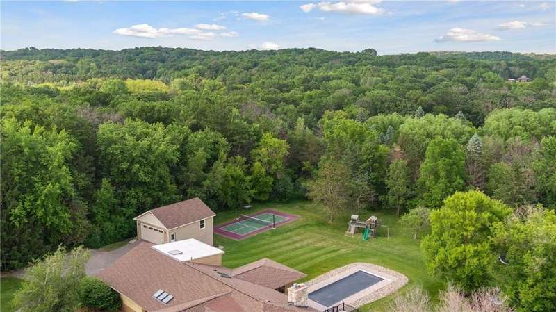 Tucked away on a beautifully wooded 5.42-acre lot in the heart of Afton, this striking mid-century modern home is the perfect blend of timeless design and thoughtful modern updates. Every detail of this property exudes style, comfort, and functionality—from the open floor plan and dramatic vaulted ceilings to the sun-drenched skylights and architectural double-sided woodburning fireplace, seamlessly connecting the main living space with a cozy covered back deck. The heart of the home is the fully remodeled kitchen (2019), where sleek Quartz countertops, soft-close cabinetry, a statement vent hood, and premium appliances—including a Kitchenaid ice machine—make entertaining a breeze. Warm hardwood floors lead to a stunning sunroom and three spacious main-level bedrooms, while recently updated bathrooms add fresh sophistication with high-end finishes. Step outside to experience the ultimate in resort-style living: a heated saltwater pool, expansive 2-tiered maintenance-free deck, and your very own outdoor sport court and pickleball court for endless summer enjoyment. A tree house tucked among the trees adds a whimsical touch for guests of all ages. A newly constructed (2022) 25x29 detached garage offers the perfect setup for a workshop, extra storage, or even boat parking. Additional highlights include new carpet, new interior doors, a radon mitigation system, sauna, and a newer roof (2018). This home is not just a property—it's a lifestyle. Experience peace, privacy, and inspired design just minutes from downtown Afton