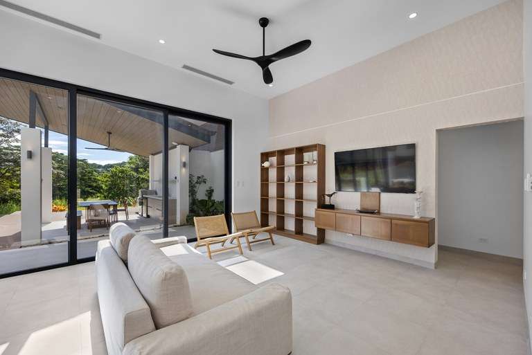 The home's outdoor area is designed for ultimate relaxation, with a stunning infinity pool that overlooks the golf course, a large covered kitchen, BBQ and dining area for outdoor dining, and a modern kitchen with granite countertops and wood cabinetry. It's only a 5-minute walk from the Beach Club and the famous white sands of Playa Conchal beach, making it the perfect place for beach lovers.