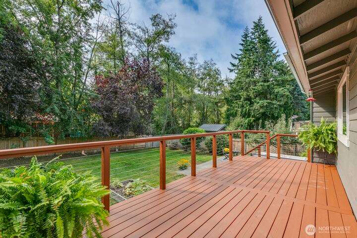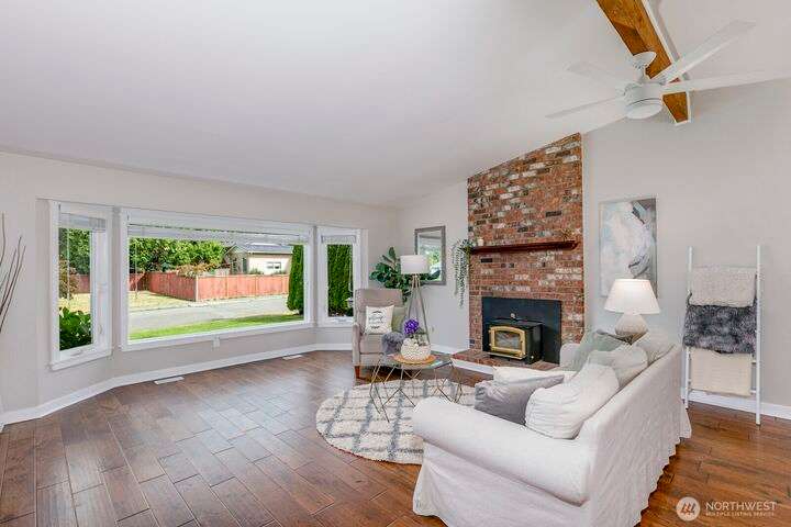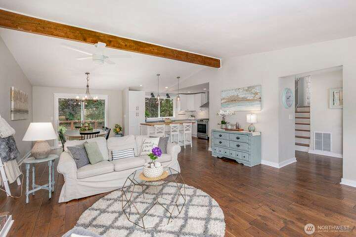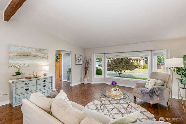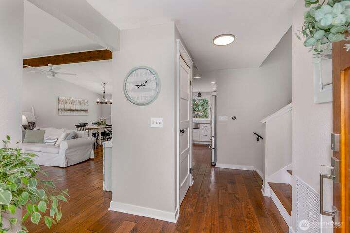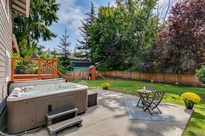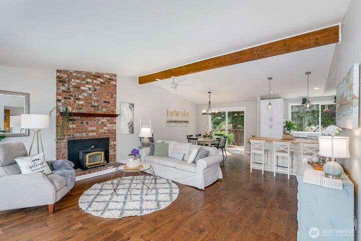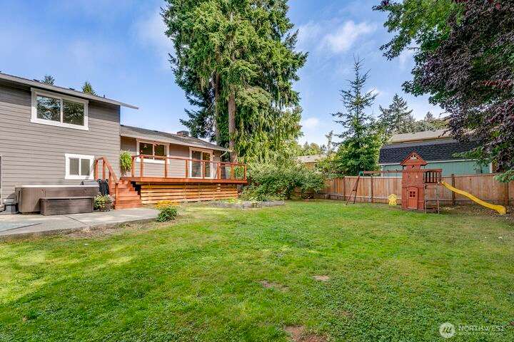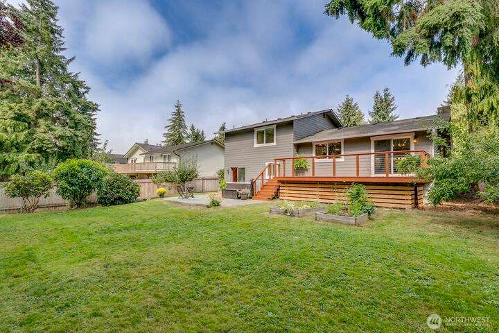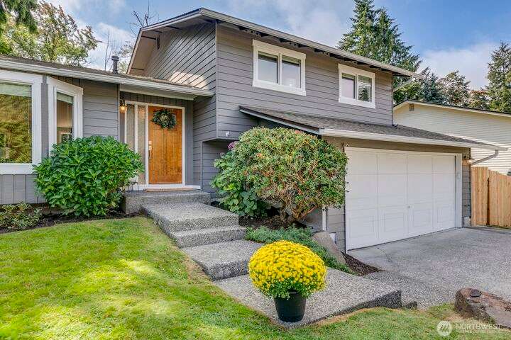 Lovingly updated & gorgeous, this tri-level home is bright & welcoming. Large windows & vaulted ceiling fill the open main floor w/sunlight, while hardwood floors w/cozy fireplace make you feel at home. You will love this kitchen w/quartz counters, SS appliances & huge island w/eating space. Upstairs the primary has its own luxury ensuite bath, while 2 bedrms share a newly remodeled guest bath. The basement is the perfect place to have a movie rm, playrm or office. New carpets & paint! Amazing huge private backyard, complete w/newer deck, hot tub, gardens & fruit trees. Even backs to greenbelt. Neighborhood is wonderful w/ walking loops & quiet streets but so close to shopping centers & transportation. Excellent Mukilteo schools!!