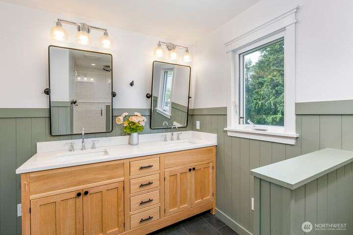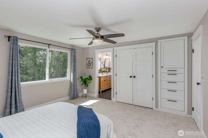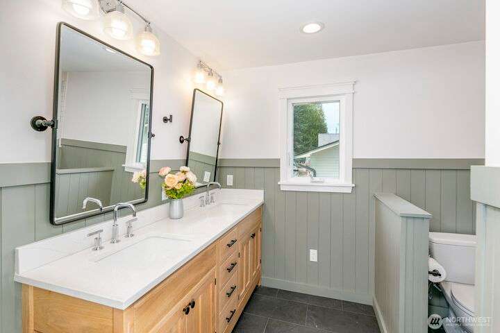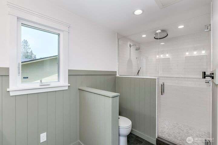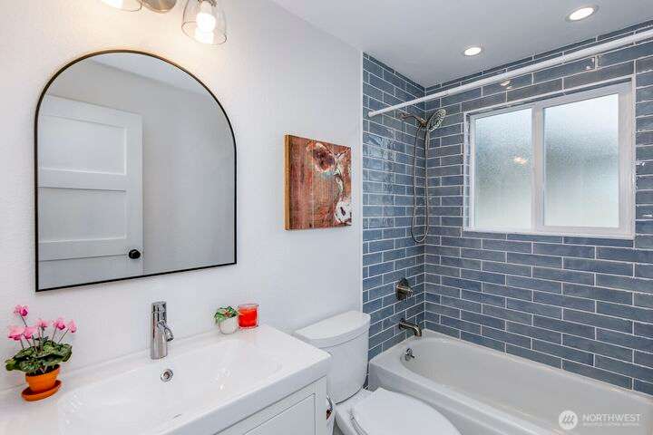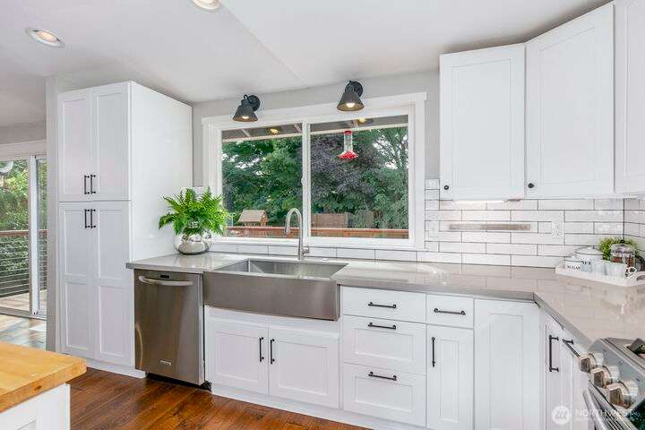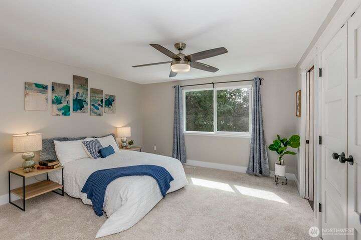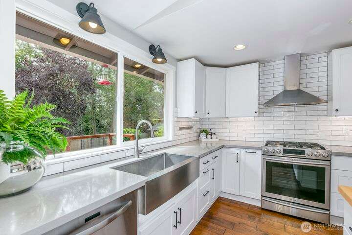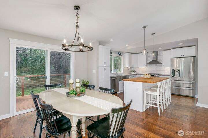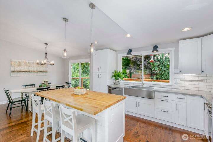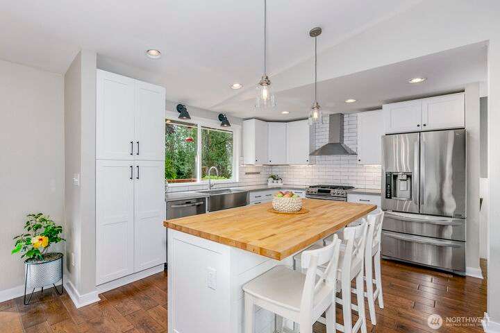 Lovingly updated & gorgeous, this tri-level home is bright & welcoming. Large windows & vaulted ceiling fill the open main floor w/sunlight, while hardwood floors w/cozy fireplace make you feel at home. You will love this kitchen w/quartz counters, SS appliances & huge island w/eating space. Upstairs the primary has its own luxury ensuite bath, while 2 bedrms share a newly remodeled guest bath. The basement is the perfect place to have a movie rm, playrm or office. New carpets & paint! Amazing huge private backyard, complete w/newer deck, hot tub, gardens & fruit trees. Even backs to greenbelt. Neighborhood is wonderful w/ walking loops & quiet streets but so close to shopping centers & transportation. Excellent Mukilteo schools!!